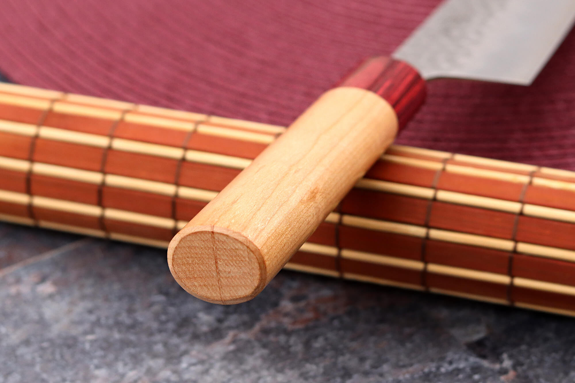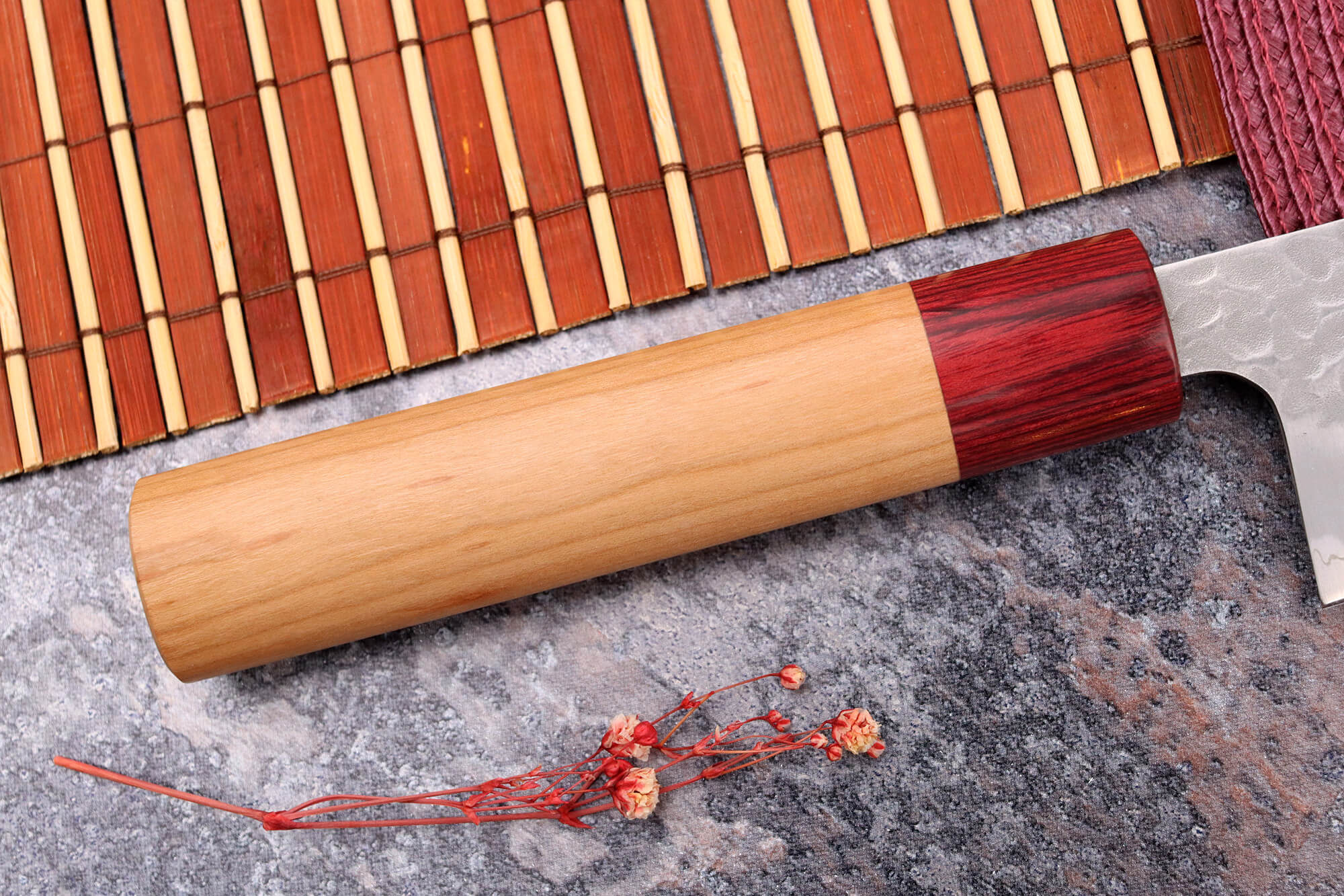 Le manche de ce couteau japonais de cuisine est conçu en bois de cerisier clair, une essence appréciée pour sa robustesse et son élégance naturelle. Au Japon, le cerisier est un arbre emblématique, symbole de beauté éphémère et de renouveau, omniprésent dans la culture et le paysage de l’archipel.