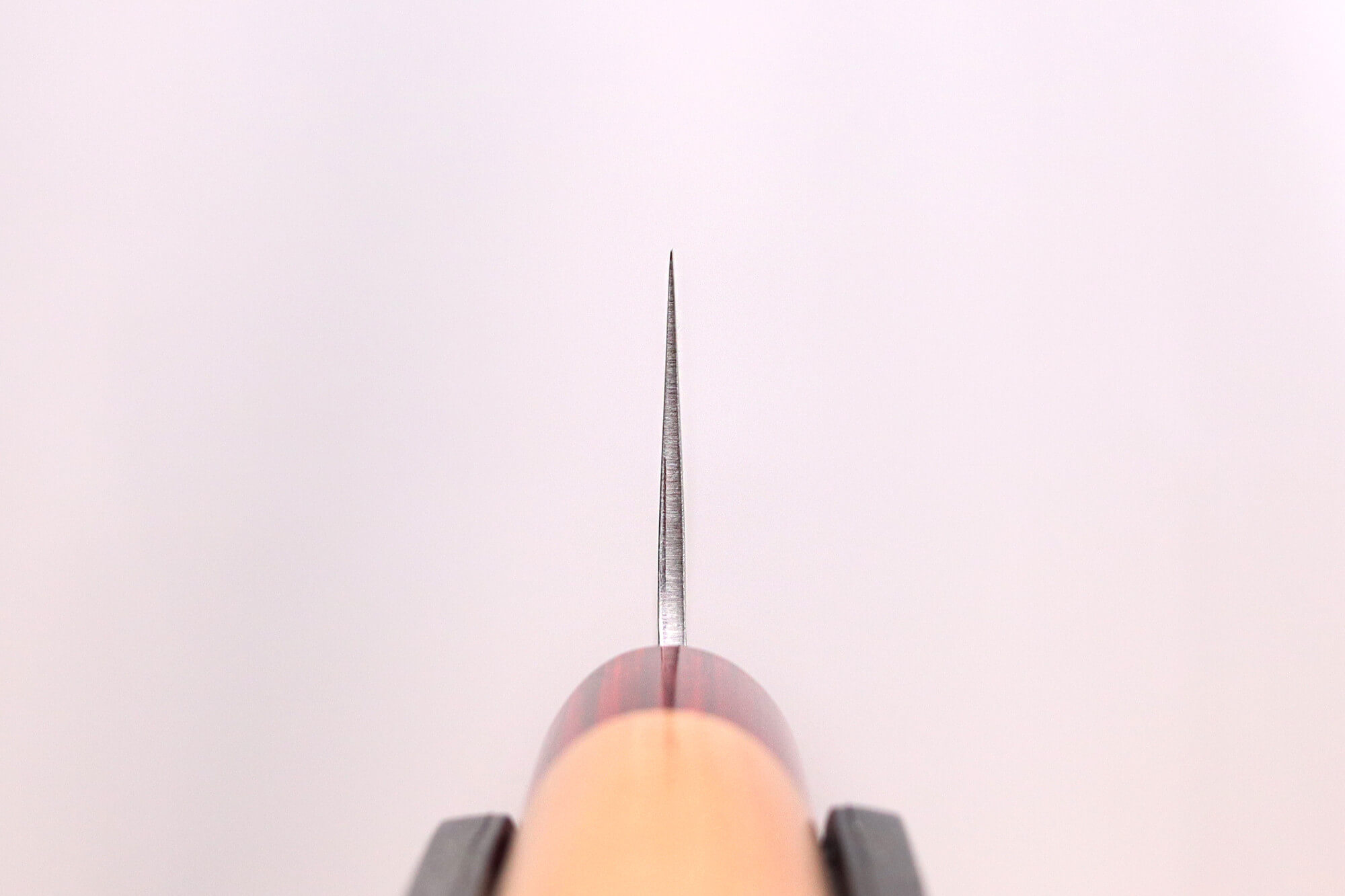 Avec une teneur en carbone d'environ 1,5 %, cet acier offre une dureté élevée, renforçant la robustesse de la lame et assurant une excellente longévité du tranchant. Grâce à cette composition, la dureté de la lame atteint les 65HRC sur l’échelle de Rockwell, bien supérieure à celle des couteaux occidentaux, généralement situés entre 55 et 60 HRC. Cela garantit une rétention du tranchant optimale et des performances de coupe durables.