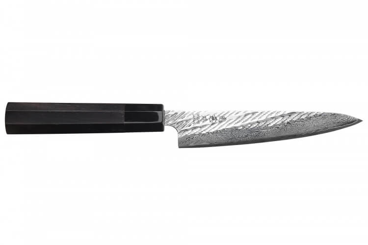 Le couteau japonais universel Wusaki Kuronawa G3 damas est une pièce artisanale compacte et performante ! Il est pensé pour les tâches de précision du quotidien : trancher des oignons, ciseler des herbes ou découper des petits fruits devient un geste fluide et naturel. Avec une lame de 13,5cm, il se glisse facilement entre les aliments et s’adapte parfaitement aux petites surfaces de travail.