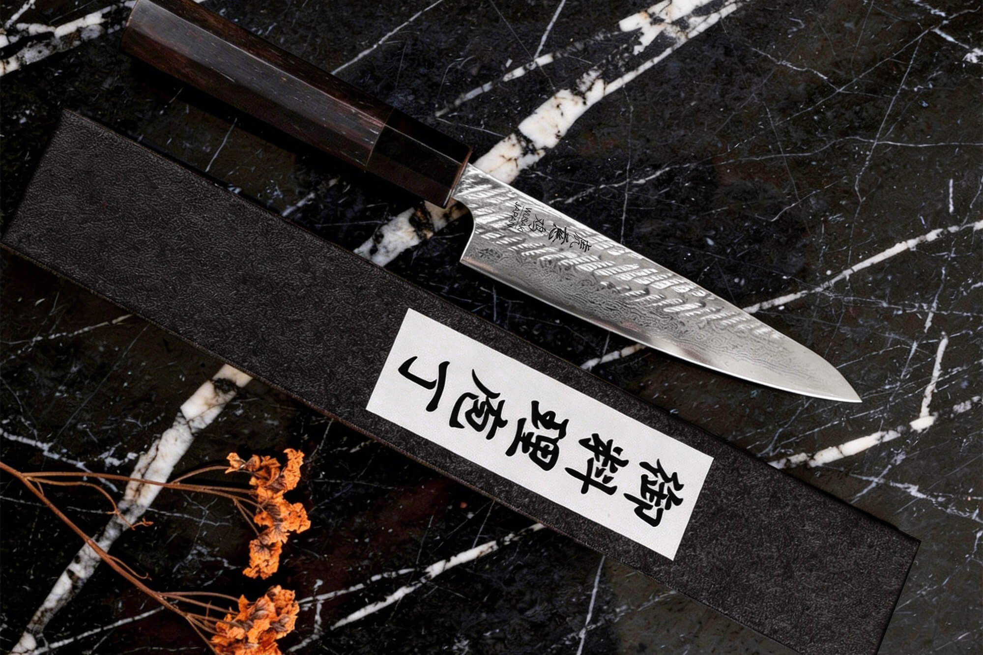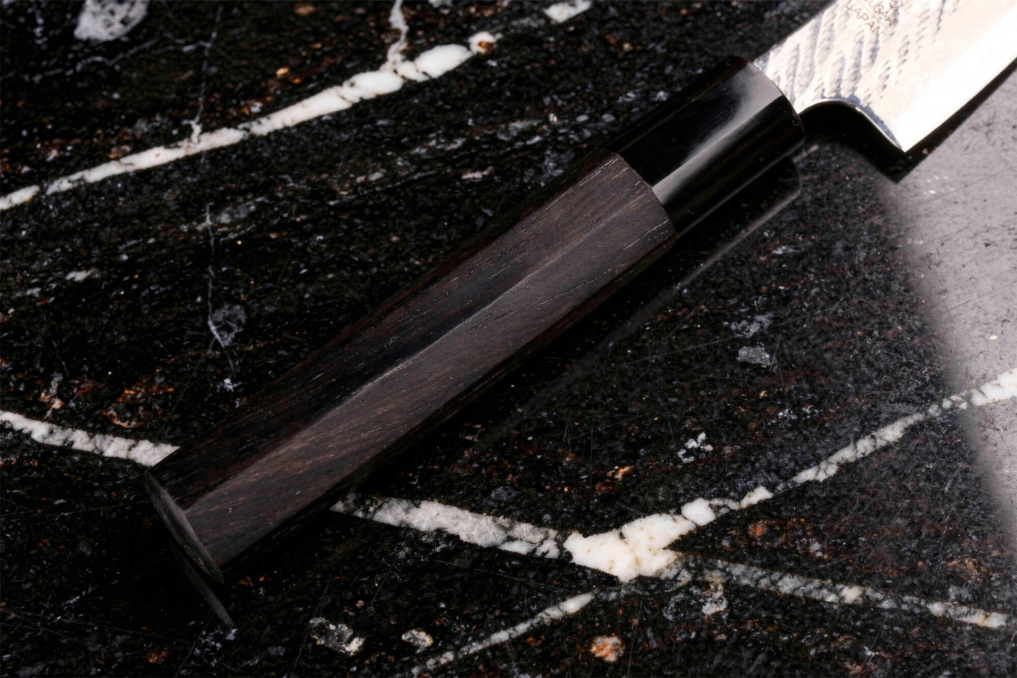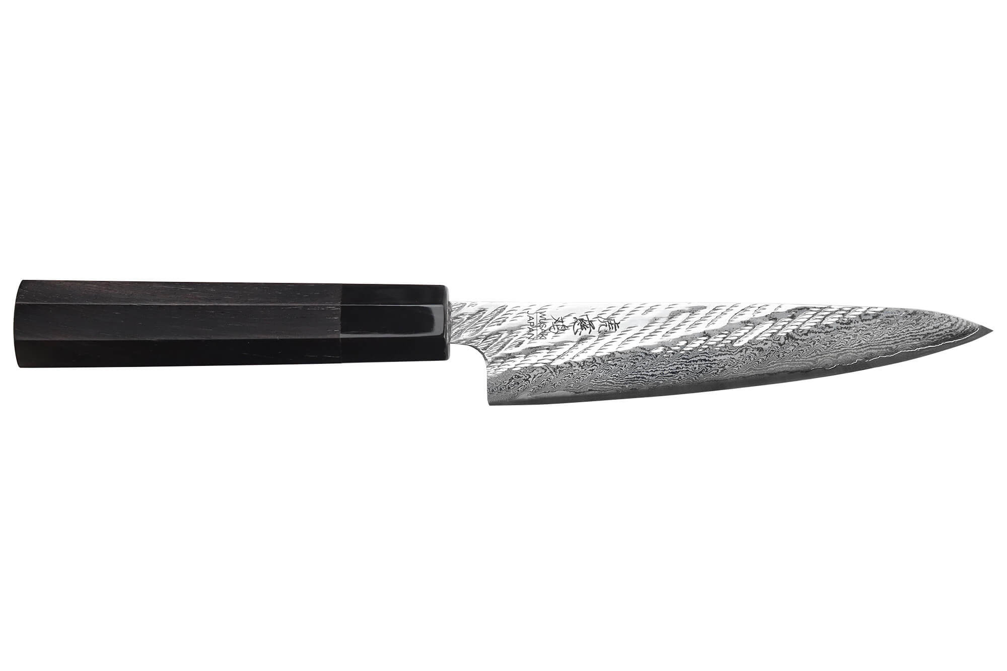 Le manche de ce couteau japonais universel est réalisé en ébène, un bois exotique dense, résistant à l’humidité, à la chaleur et aux variations de température. Très apprécié pour sa teinte profonde et sa durabilité, le bois d'ébène donne au couteau un caractère noble et traditionnel.