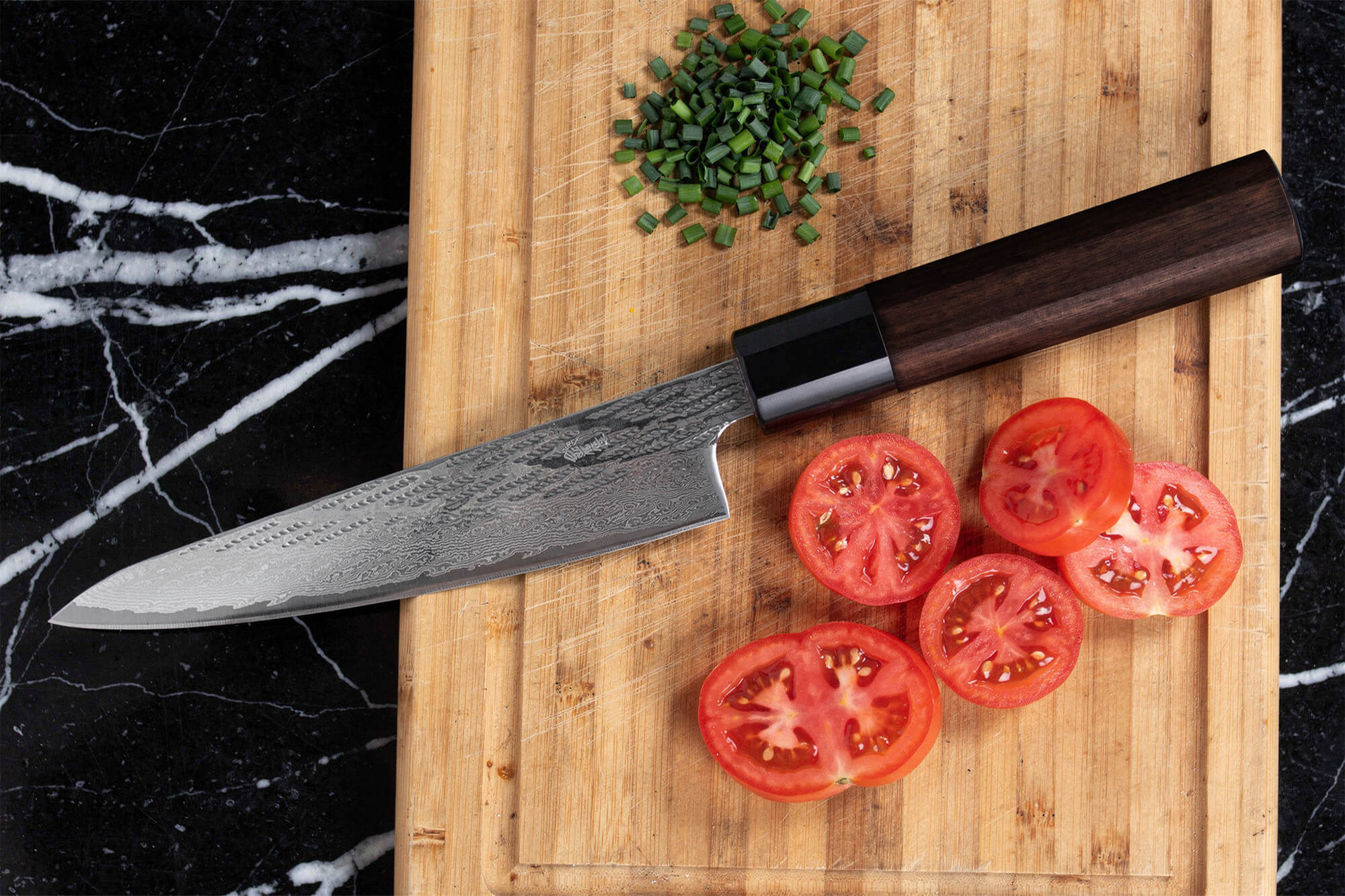 Le tout est sublimé par une finition miroir, qui accentue la beauté du damas tout en apportant une sensation de glisse très agréable en main. L’émouture plate de la lame assure quant à elle une coupe franche et droite dès la première utilisation.