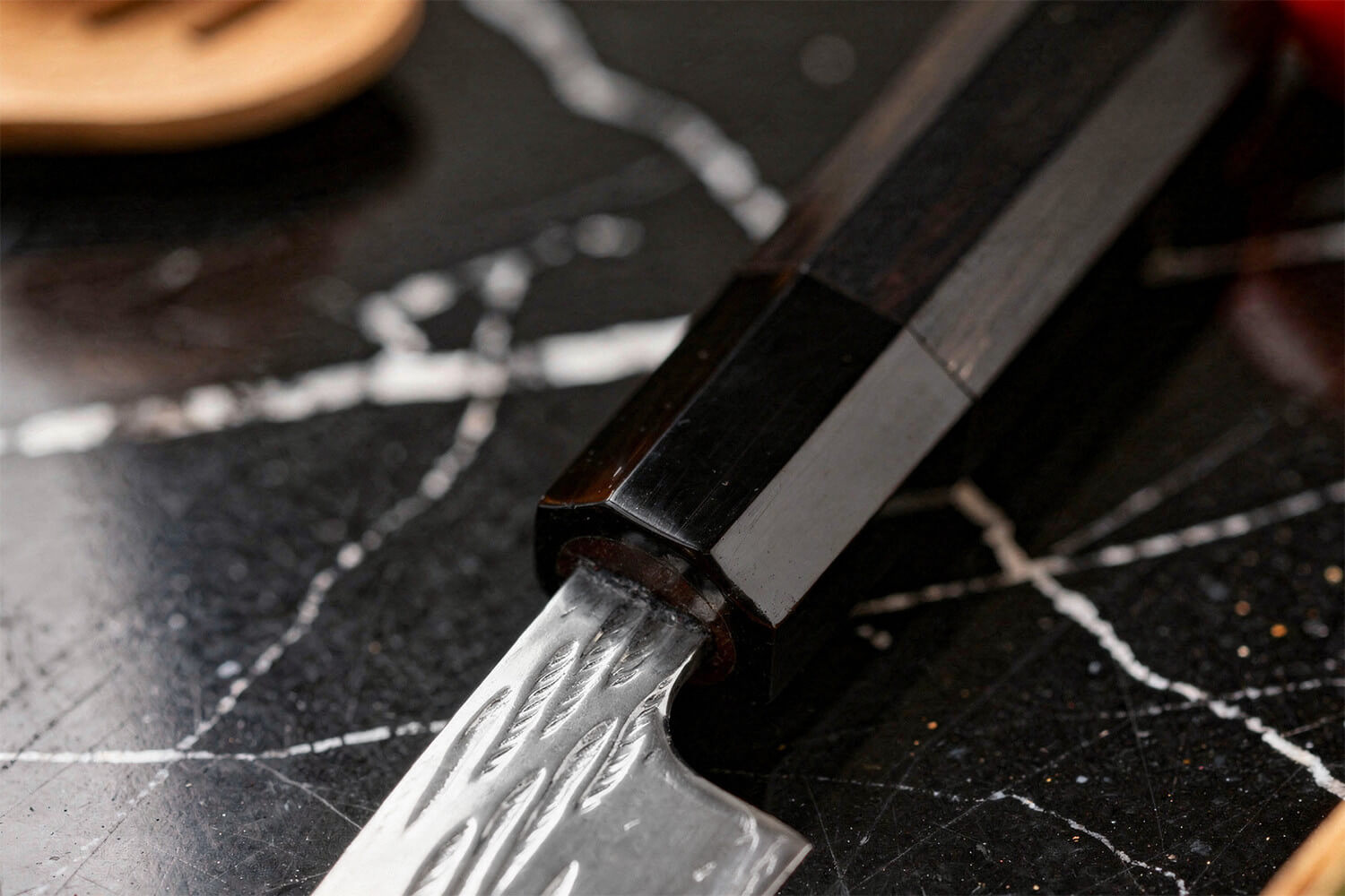 La partie supérieure de la lame est martelée, un procédé qui dessine de fines cavités. Celles-ci réduisent l’adhérence des aliments, permettant un geste de coupe plus fluide, notamment sur les légumes aqueux ou les tranches fines de viande.
