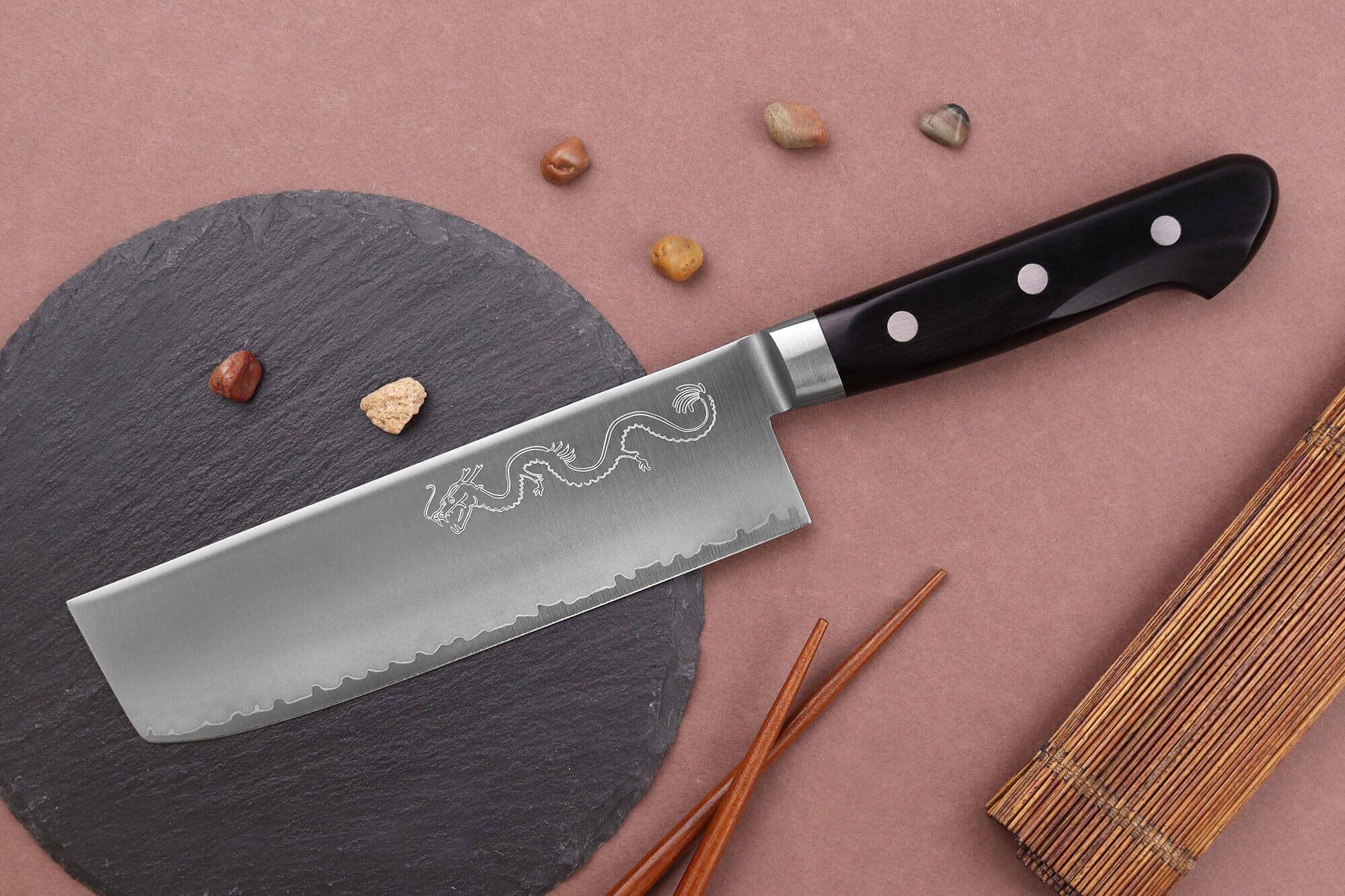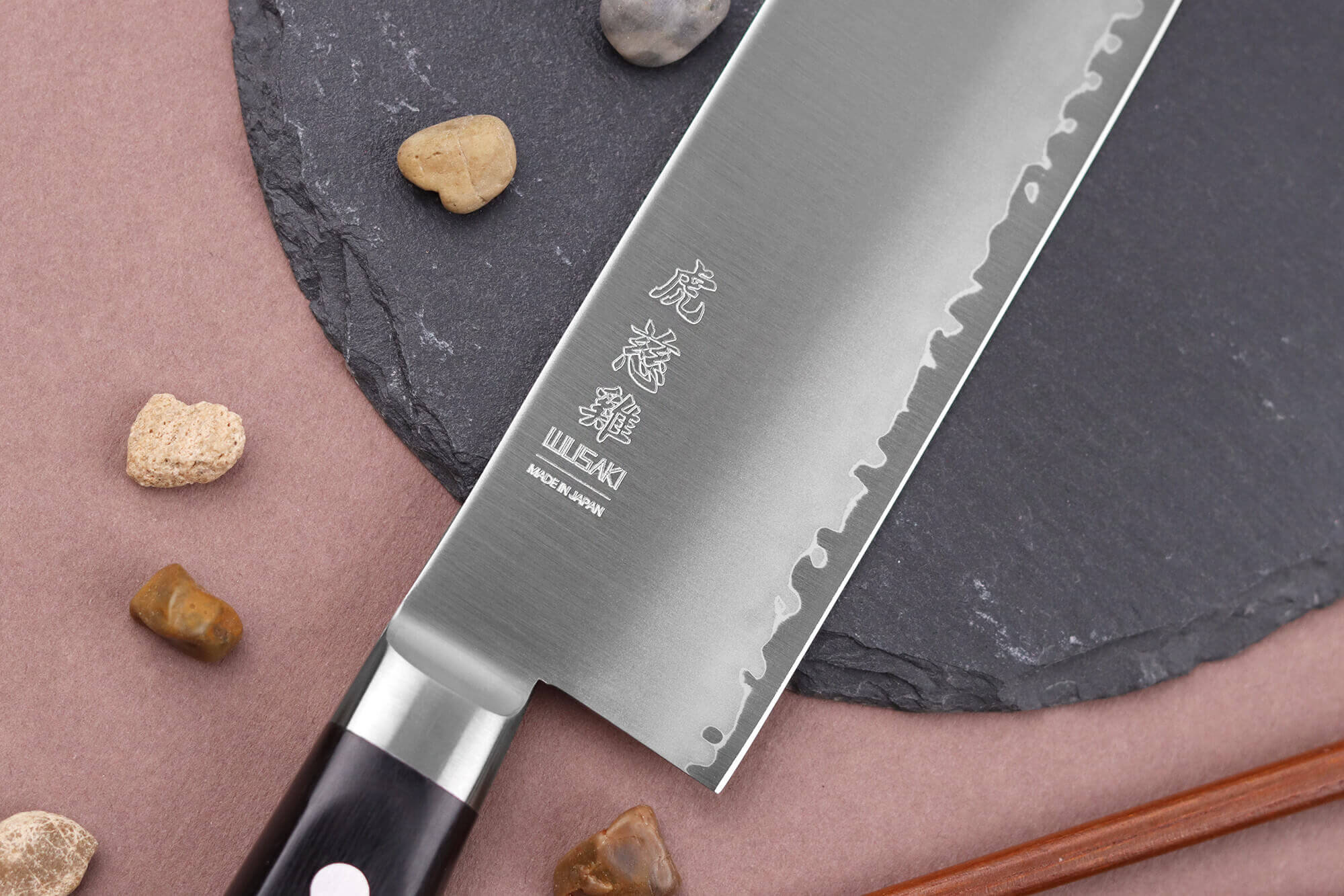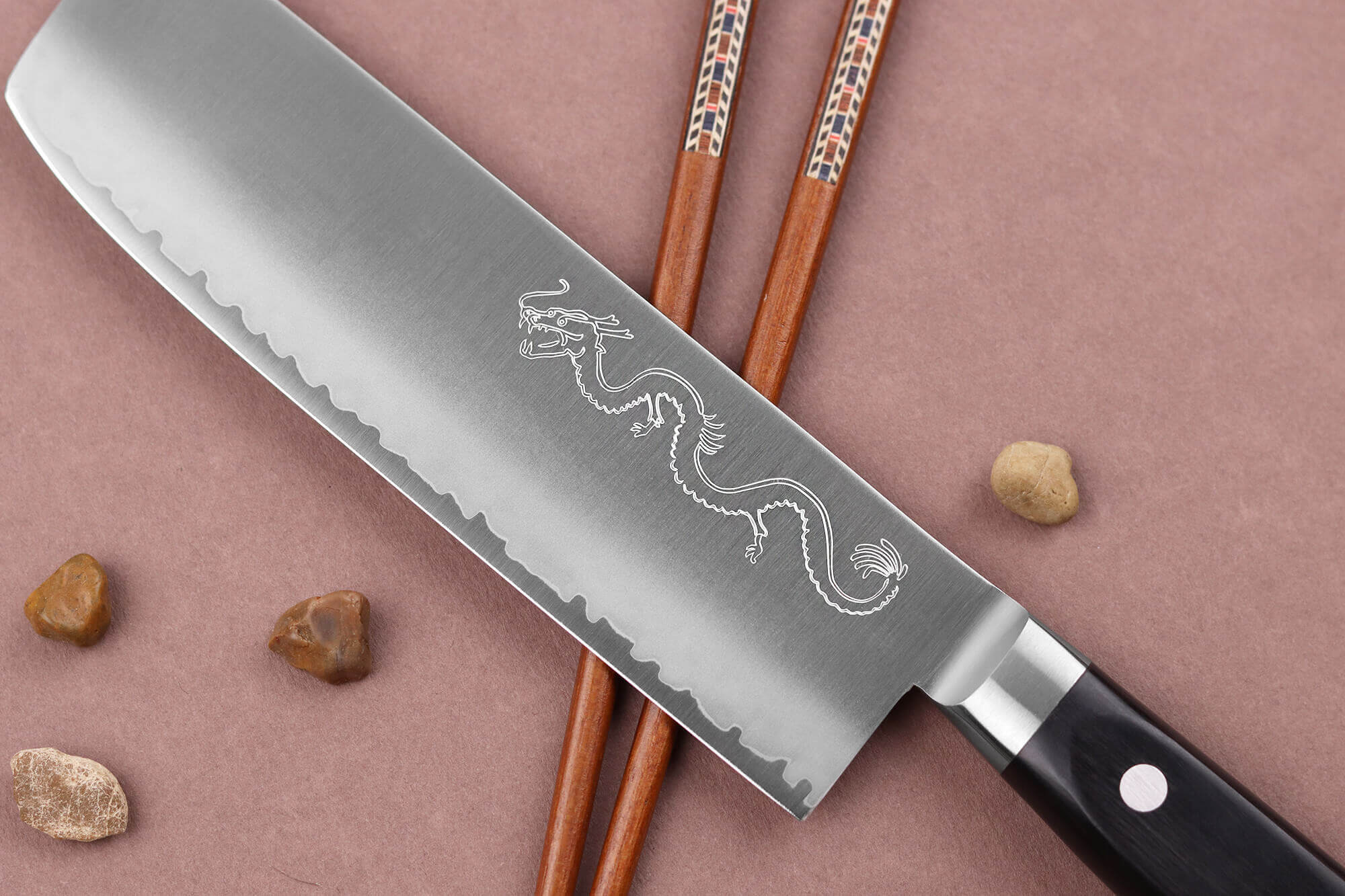 La surface de votre lame a été polie pour un rendu élégant. Elle est ornée des kanjis de la marque Wusaki ainsi que d'un dragon. Le dragon gravé dans l'acier donne son nom à la gamme. En effet, Ryujin est le dieu de la mer dans la mythologie japonaise, et il est représenté sous la forme d'un dragon élancé, symbole de la puissance de l'océan.