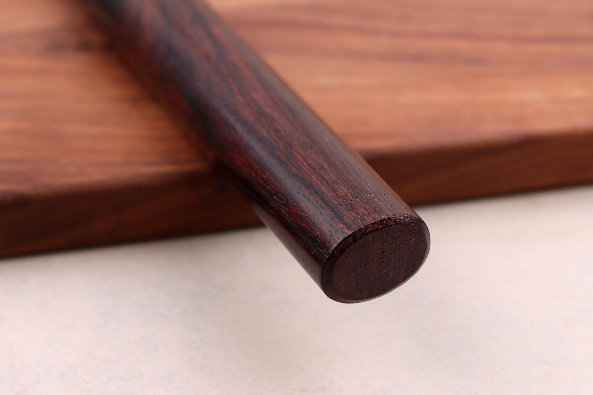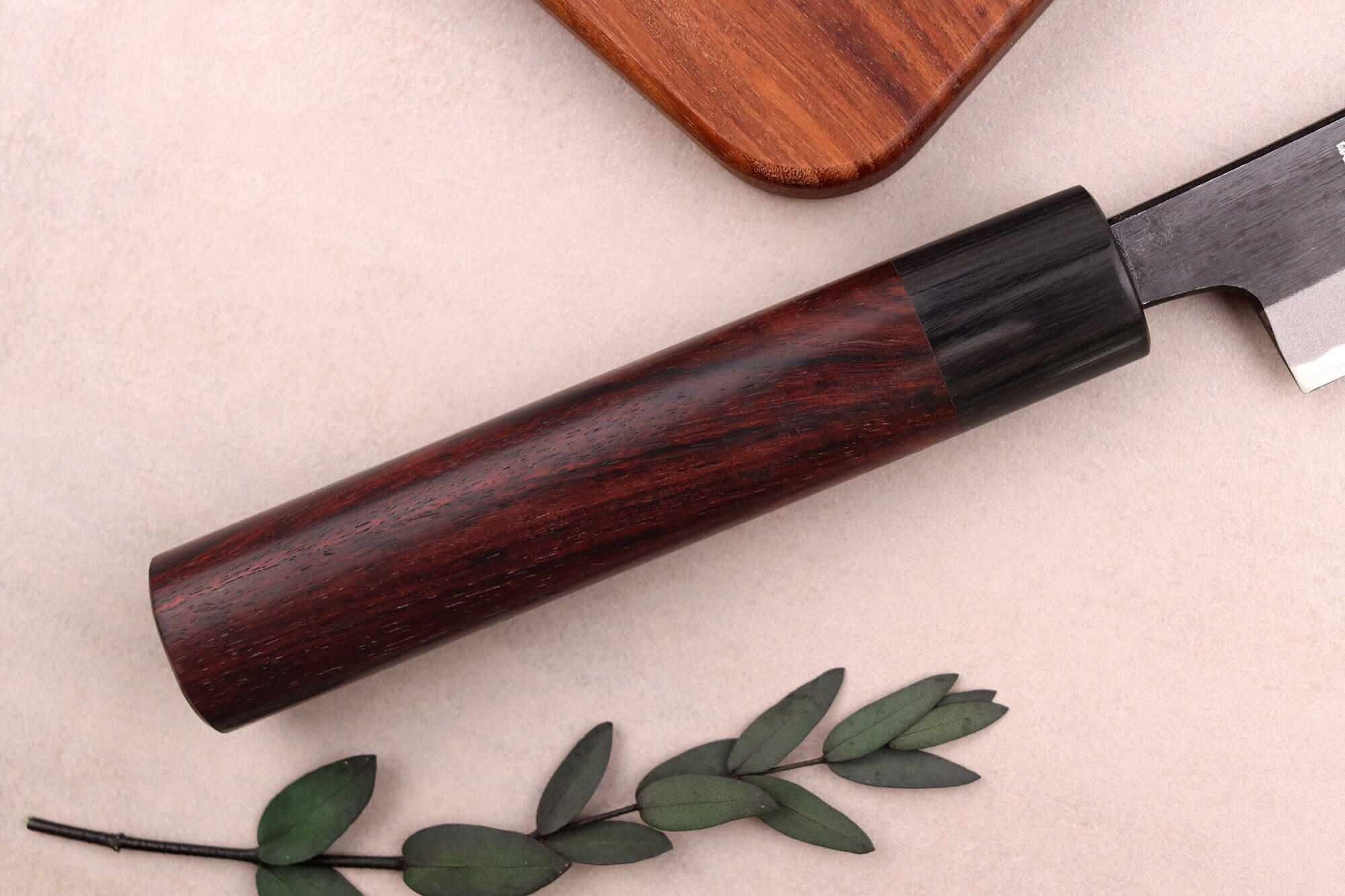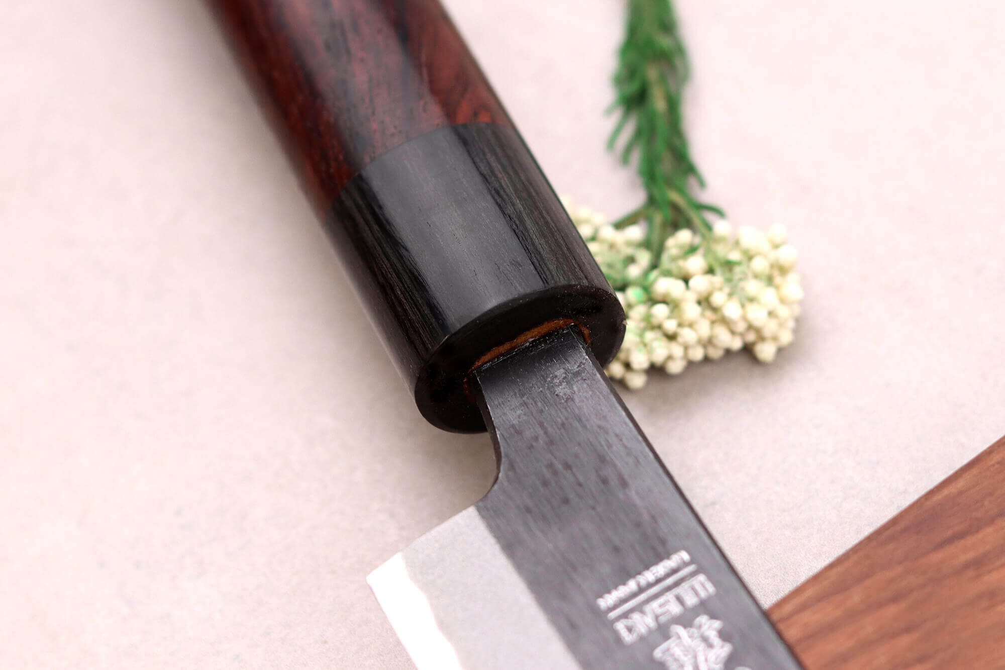 Le manche de ce couteau japonais sakimaru est fabriqué en bois de rose, une essence à la teinte profonde et un veinage unique. C'est un bois avec une haute densité qui est résistant face à l'humidité. Il est complété par une mitre en pakkawood noir qui vient faire le lien entre le manche et la lame. C'est un matériau composite réalisé à partir de bois laminé et de résine compressés à chaud pour vous offrir une résistance aux chocs et à l'humidité. L'assemblage des matériaux se fait en toute élégance.