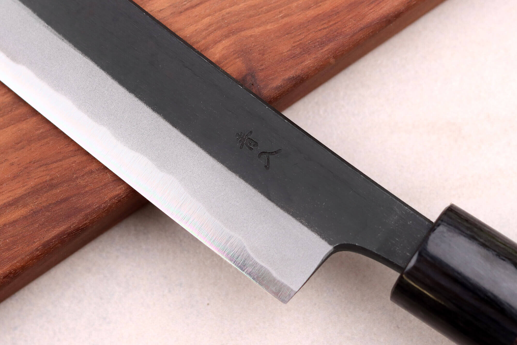 Ce couteau japonais artisanal dispose d'une finition brute de forge qui lui donne un aspect traditionnel, très apprécié des chefs. La lame est sombre, presque rustique.