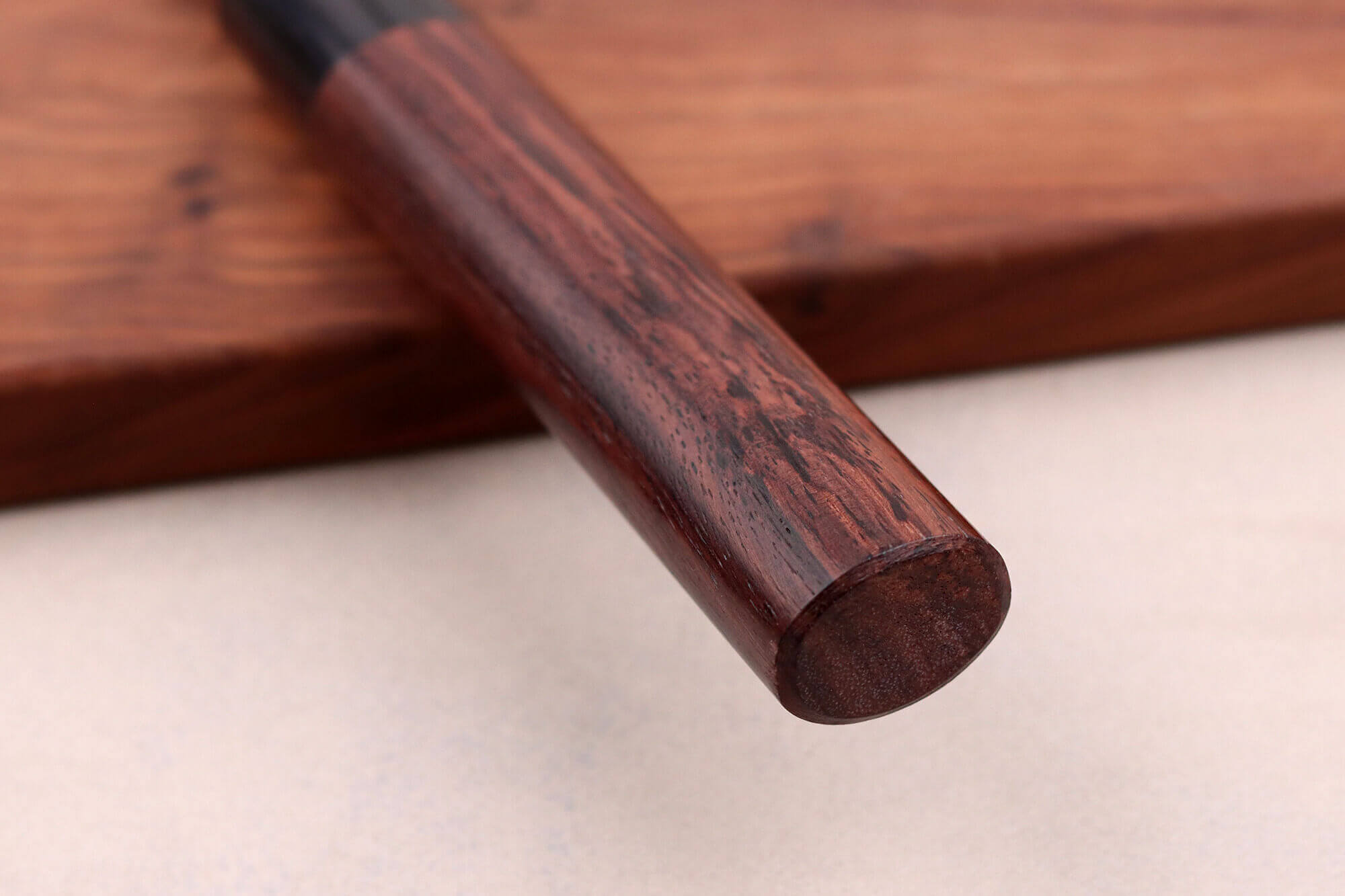 Le manche de ce couteau japonais sakimaru est conçu en bois de rose, reconnu pour sa teinte profonde et son veinage unique. Ce bois dense offre une excellente résistance à l'humidité. Une mitre en pakkawood noir, un matériau composite alliant bois laminé et résine compressée à chaud, relie le manche à la lame, garantissant une haute résistance aux chocs et à l'humidité. L'assemblage des matériaux est réalisé avec élégance.