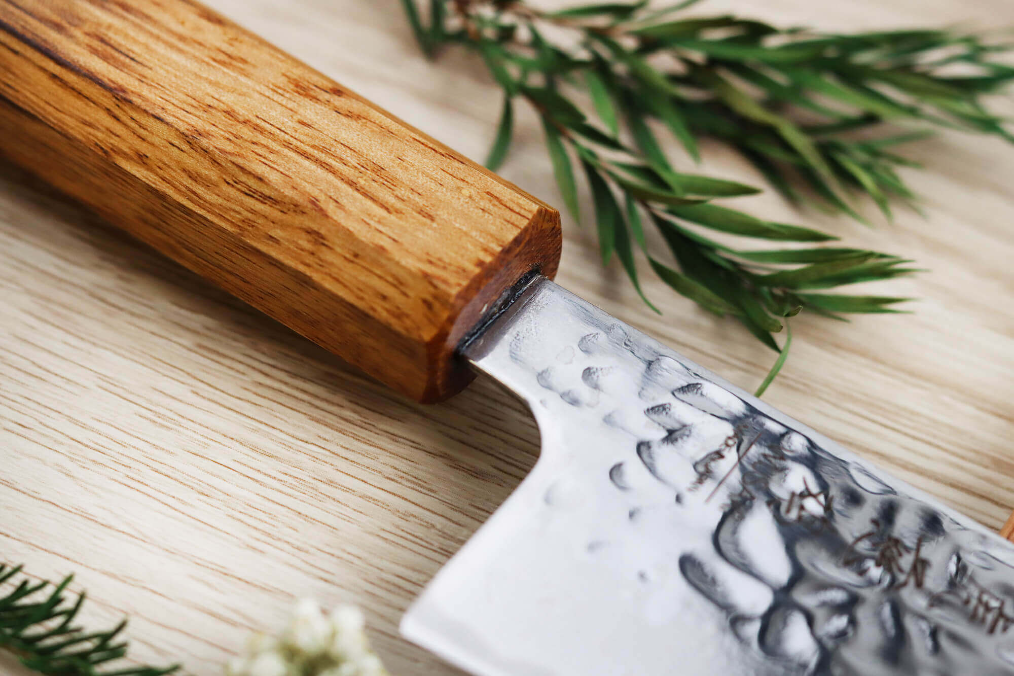 La surface de coupe a été polie au maximum, façon miroir, ce qui permet d'augmenter sa résistance à la corrosion. Aussi, la lame est martelée, pour créer du contraste et lui donner encore plus d'authenticité. Le martelage agit un peu à la manière des alvéoles, pour que la lame adhère moins aux éléments lors de vos découpes.