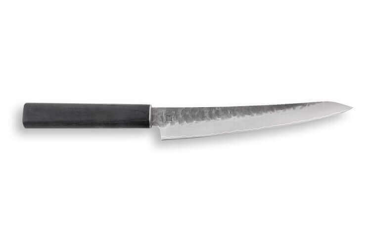 Ce couteau sujihiki 20cm est un couteau de forme typiquement japonaise, avec sa longue lame fine. Il sert principalement à découper les sashimi, et les fines pièces de viande ou de poisson.