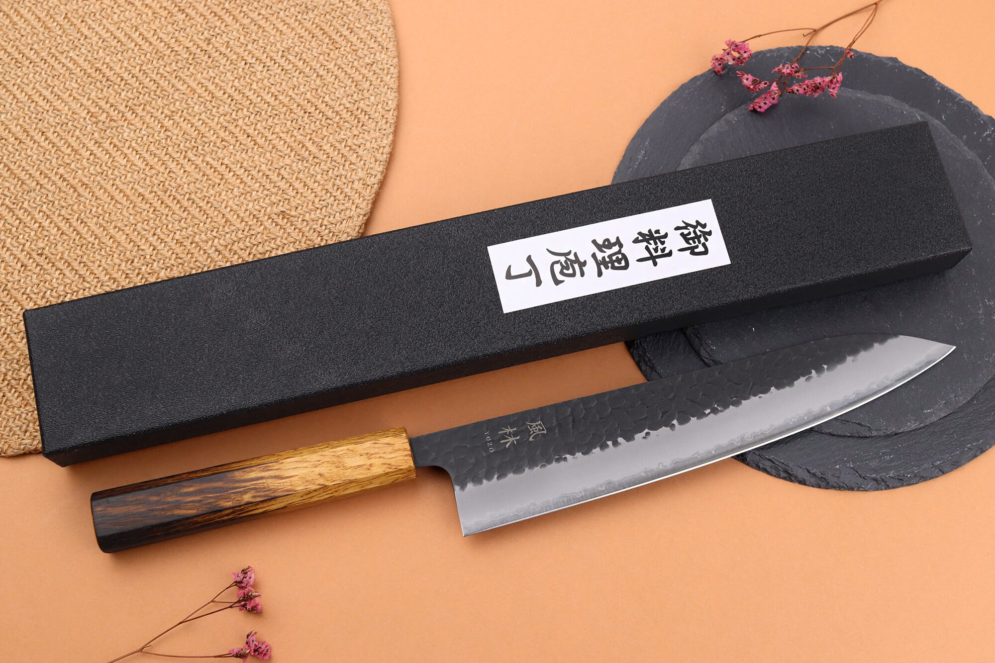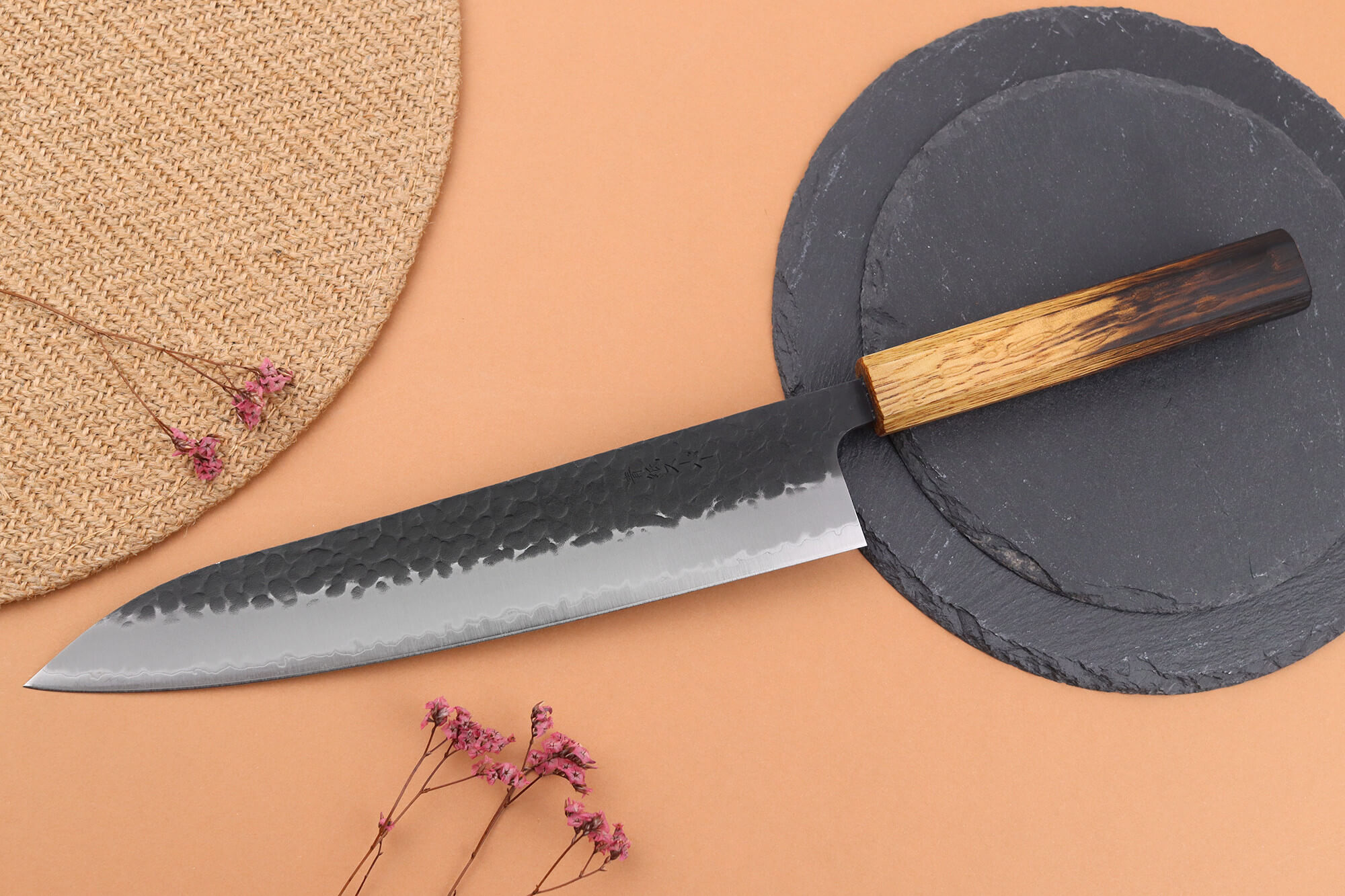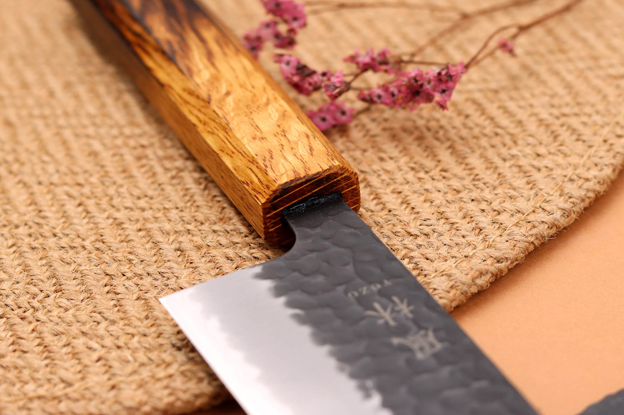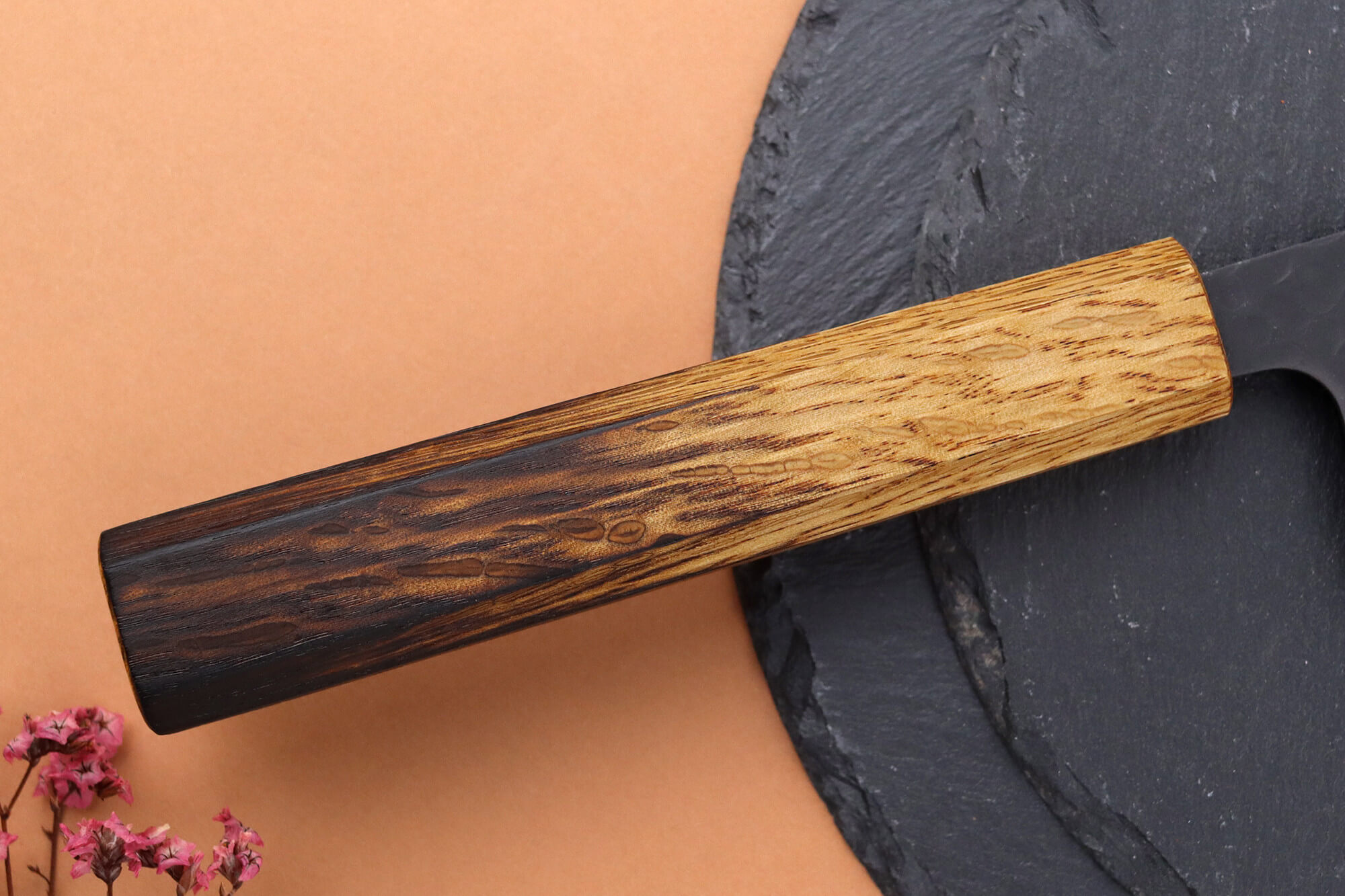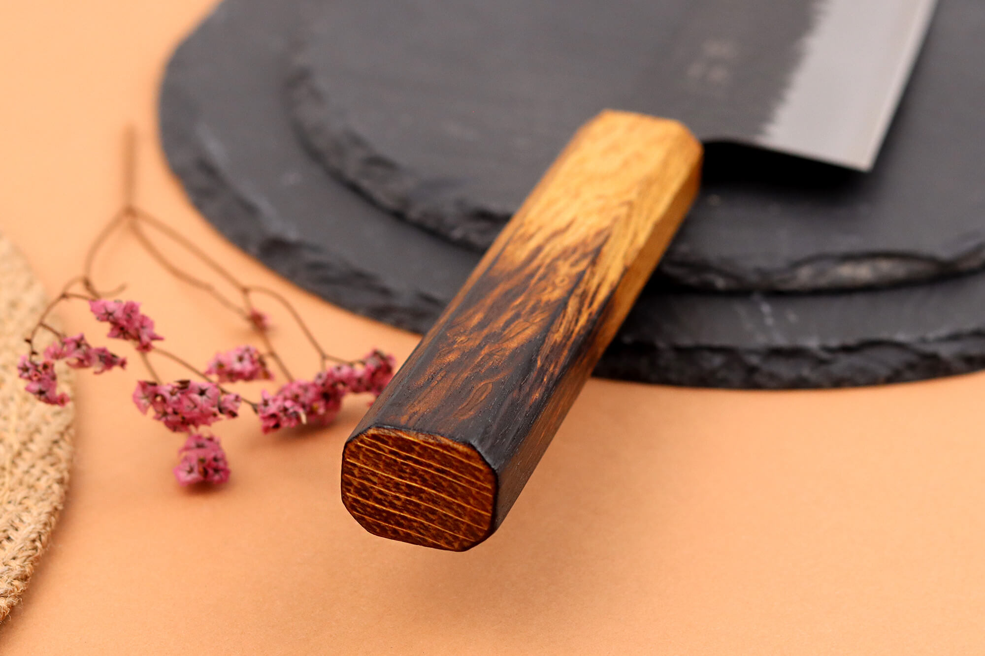Pour apporter une touche visuelle originale et renforcer encore sa durabilité, l’extrémité du manche a été légèrement brûlée. Ce détail esthétique contraste joliment avec la teinte claire du bois et souligne l’aspect artisanal de votre couteau de cuisine japonais.