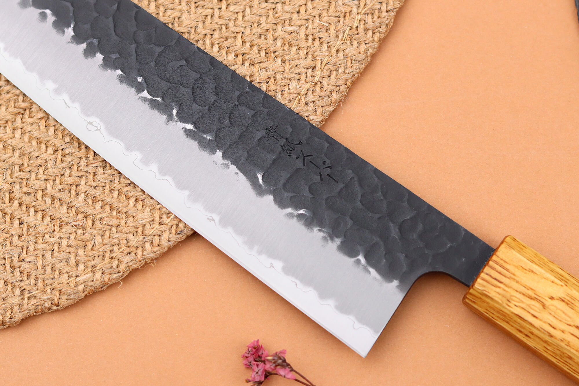 Enfin, la lame présente une finition brute de forge, qui met en valeur son caractère artisanal. L’aspect sombre et non poli, accompagné des traces de martelage visibles, lui donne une allure rustique et authentique, fidèle à l’esthétique des couteaux japonais traditionnels !