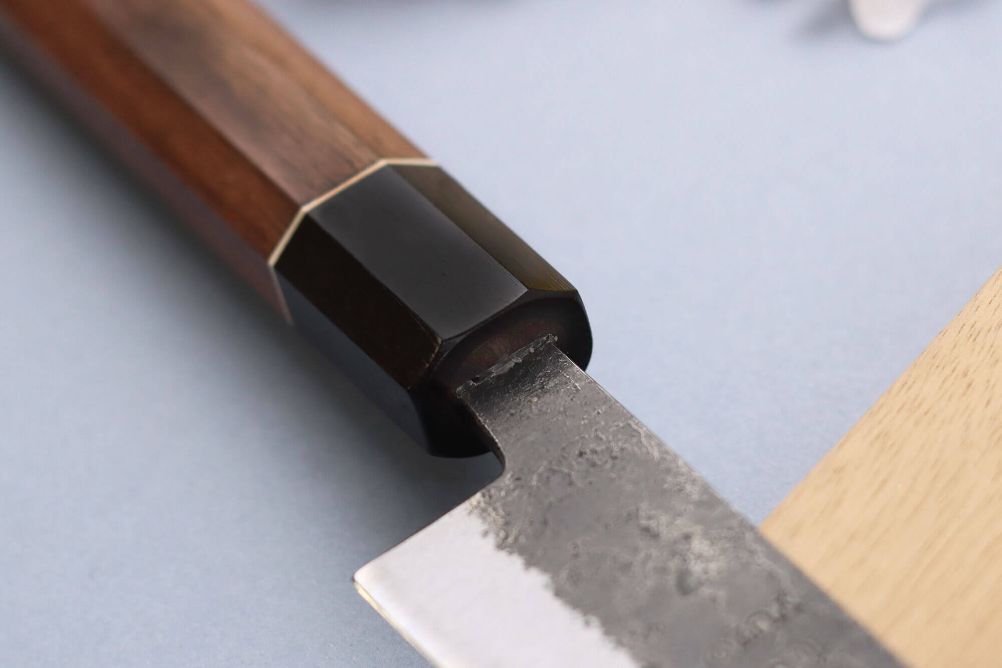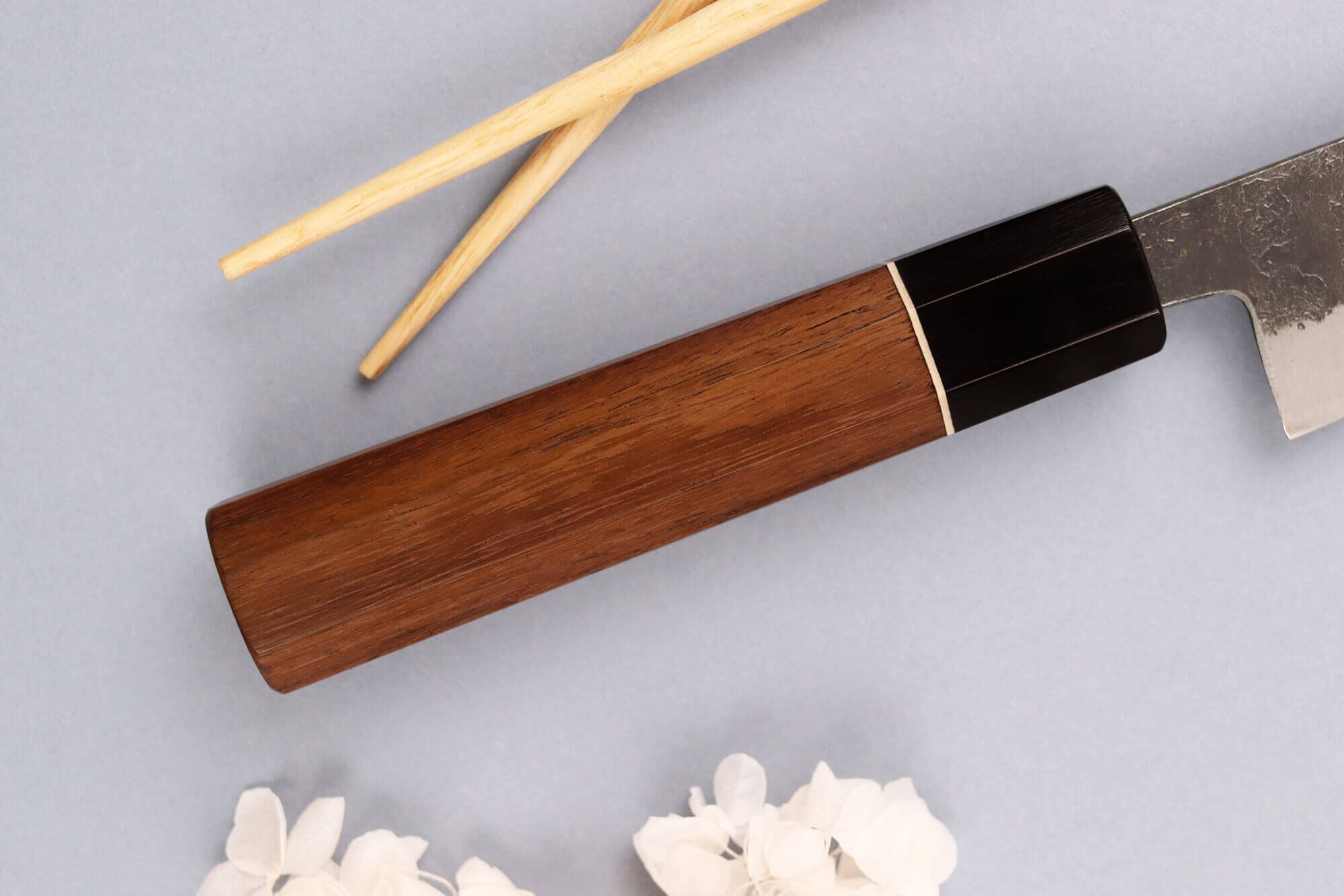 Le manche de ce couteau kiritsuke est fabriqué en bois de rose, une essence robuste et résistante à l'humidité qui se déforme difficilement en raison de sa forte densité.