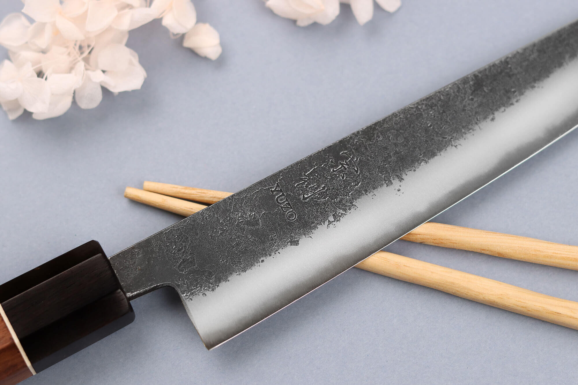 La lame présente une finition Black Nashiji, qui lui donne une apparence brute de forge non polie, appréciée des chefs japonais pour son caractère authentique. Ce résultat est obtenu avec l'utilisation d'une technique de durcissement de l'acier qui va donner un aspect foncé et rustique à votre lame. C'est cette finition traditionnelle qui a donné son nom à la gamme de couteaux Yuzo Black Nashiji.