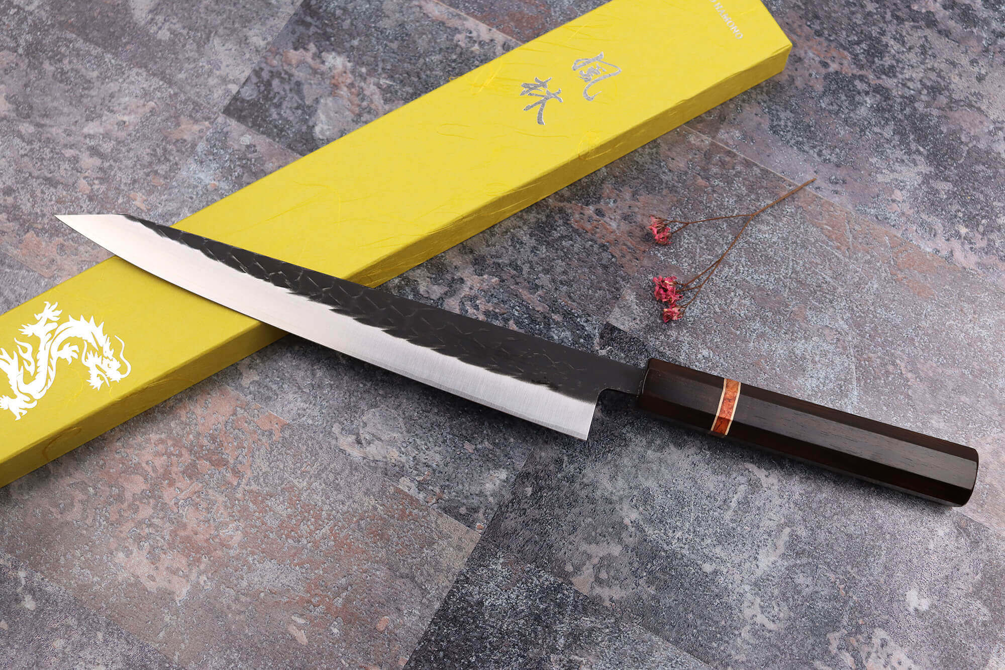 Couteau sujihiki 24cm japonais artisanal Yuzo SLD olivier et cognassier