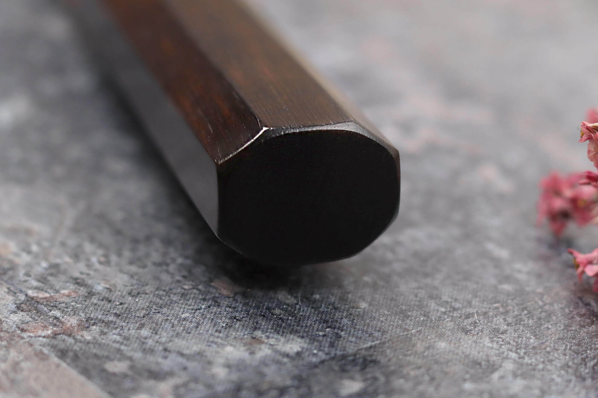 Le manche de ce couteau Yuzo est conçu en ébène aux nuances rouges, il s'agit d'un bois dense qui est résistant face aux risques de fissures sur la durée et qui s'adapte très bien à des utilisations fréquentes. Il est de forme octogonale afin de convenir à tous les cuisiniers, qu'ils soient gauchers comme droitiers !