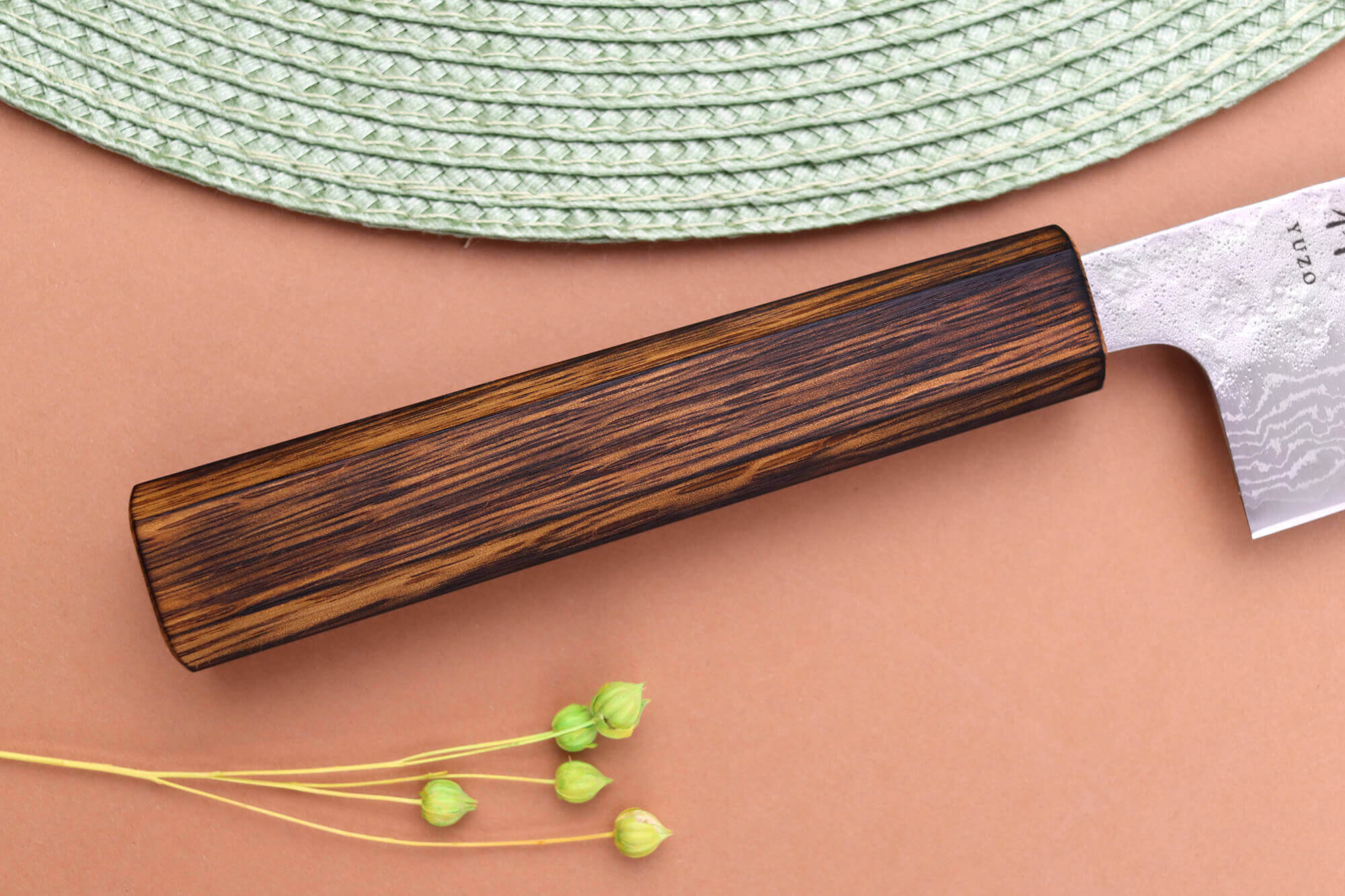 De plus, le damas est aussi un réel avantage esthétique ! La superposition des différentes couches d'acier forme des motifs élégants de fines vagues uniques à chaque couteau Yuzo. Ces motifs aléatoires ajoutent de l'élégance à votre couteau artisanal.