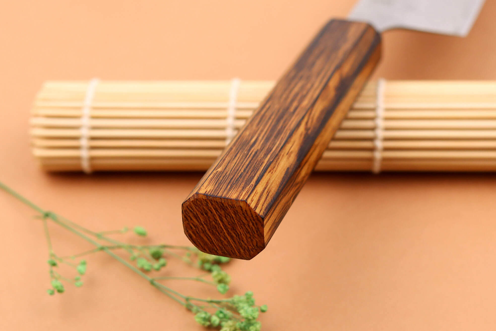 Le manche de votre couteau damassé est fabriqué en bois de chêne fumé, une essence durable et robuste. Ce bois présente une densité élevée afin de mieux résister aux chocs, aux vibrations et à l'humidité (ce qui évite toute déformation). Ce chêne baikoku a bénéficié d'un processus de fumage qui apporte une teinte plus foncée, mettant en avant son veinage naturel pour un aspect authentique.