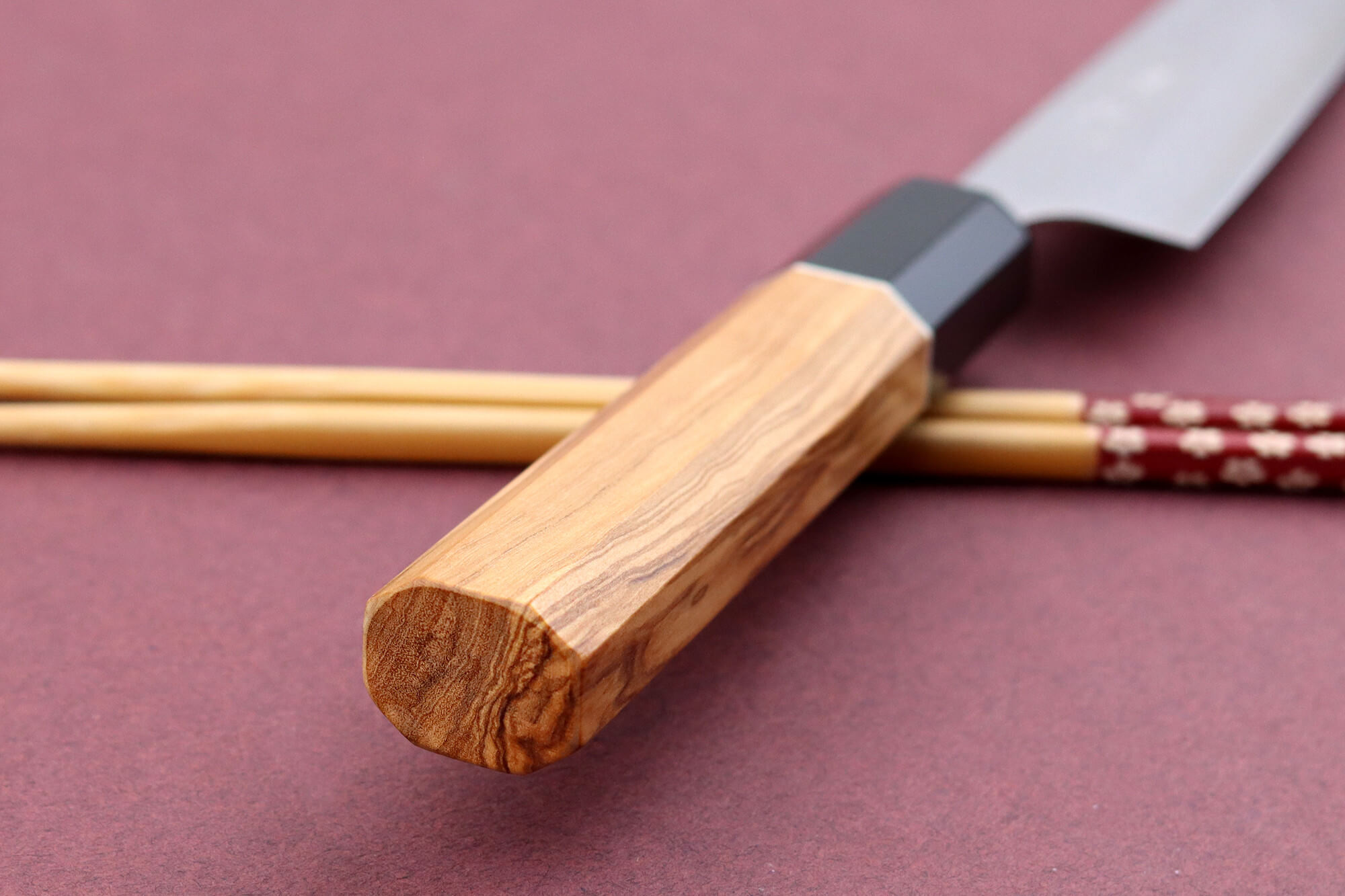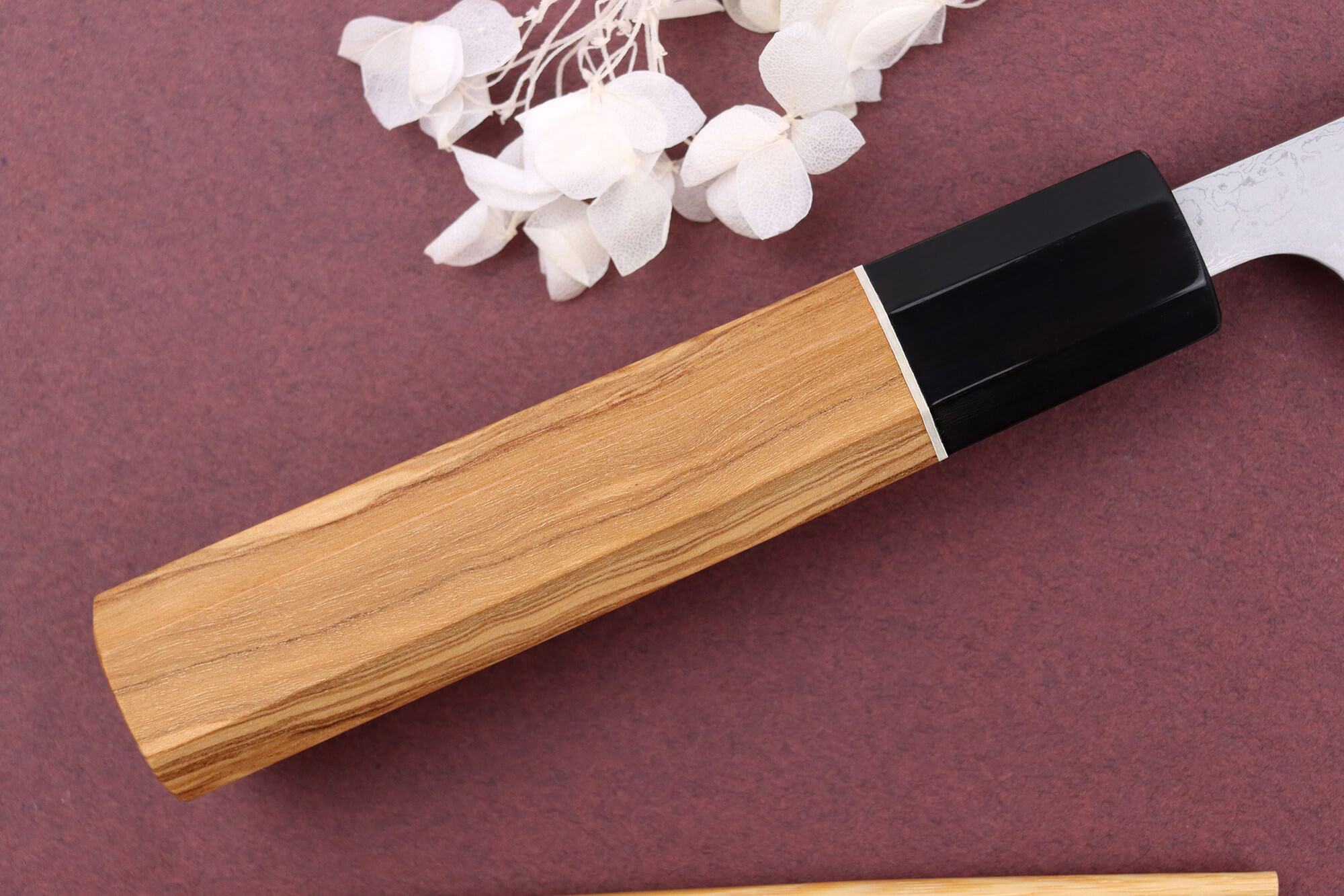 Le manche de ce couteau japonais damas est fabriqué en bois d'olivier, connu pour sa résistance et sa durabilité. Ce bois dense est capable de résister à l'humidité et de conserver sa forme malgré la condensation. De plus, le bois d'olivier présente une teinte claire et un veinage unique sur chaque pièce, offrant ainsi un contraste naturel apprécié.