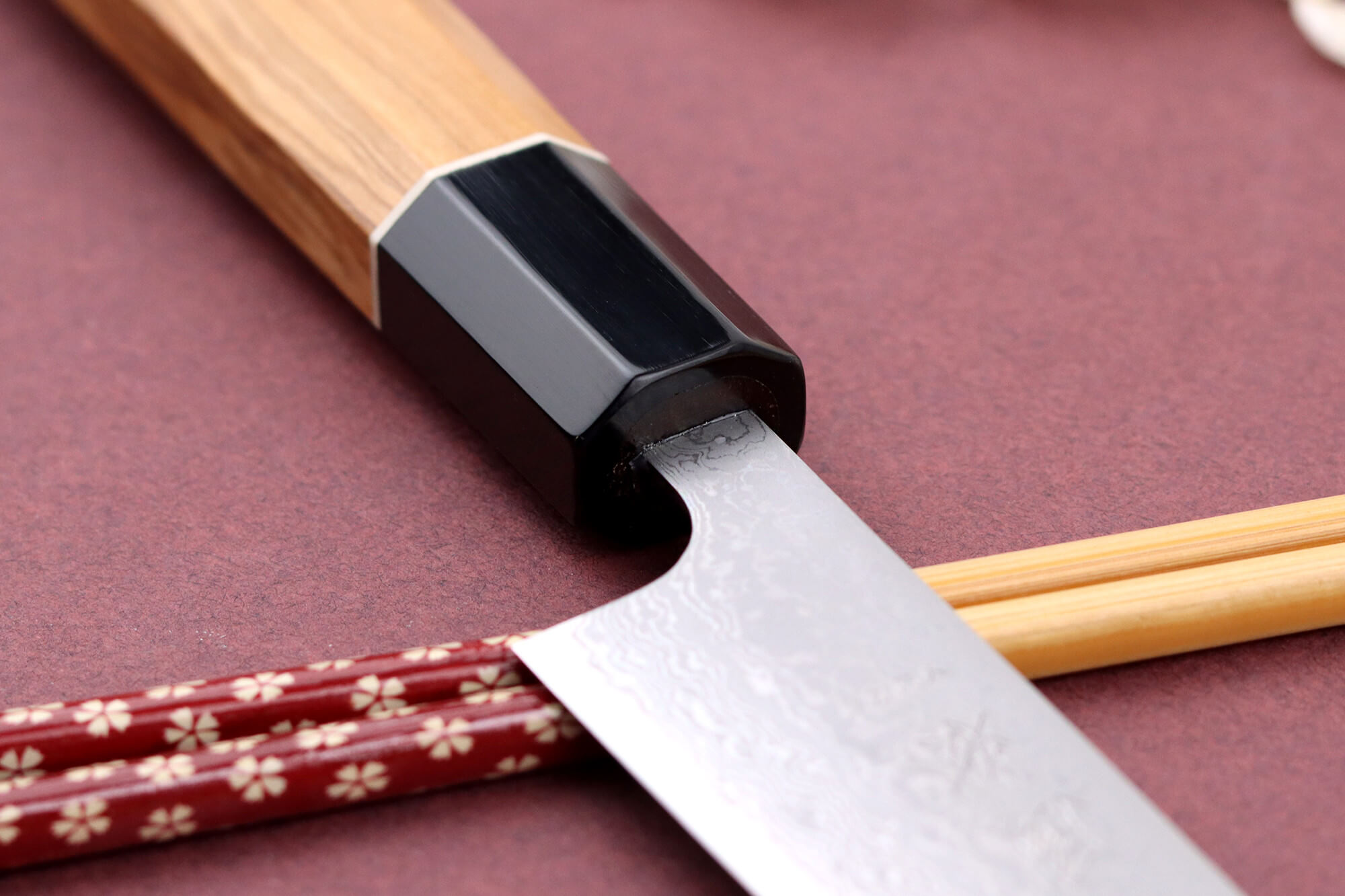 Ce couteau japonais Yuzo Hamono est doté d'une lame en acier damassé, ce qui signifie qu'un noyau en acier rigide est entouré par plusieurs couches d'acier plus doux. Cette technique permet de renforcer le noyau et équilibre la lame, la rendant plus flexible et moins susceptible de se casser.