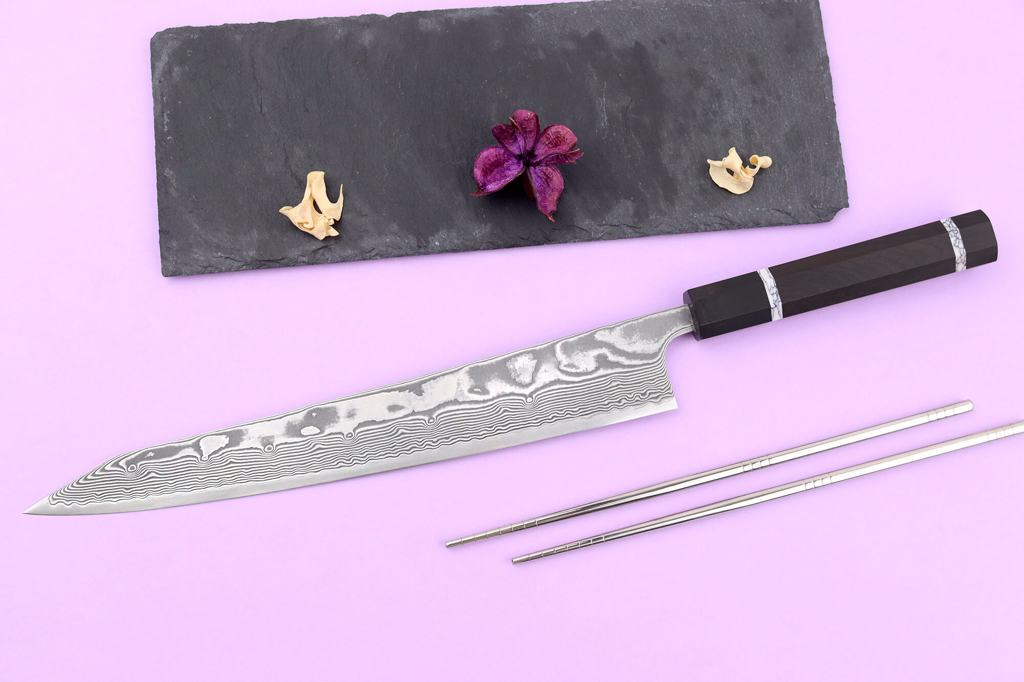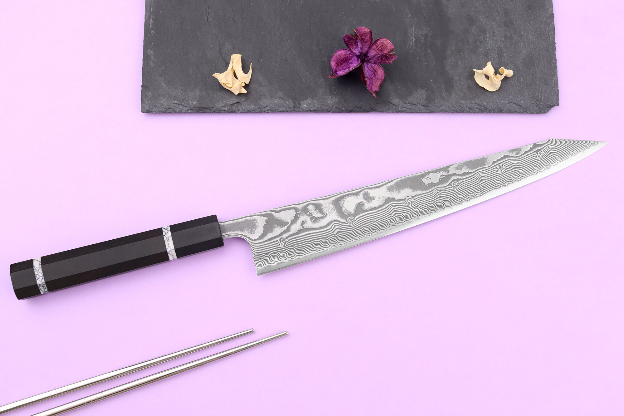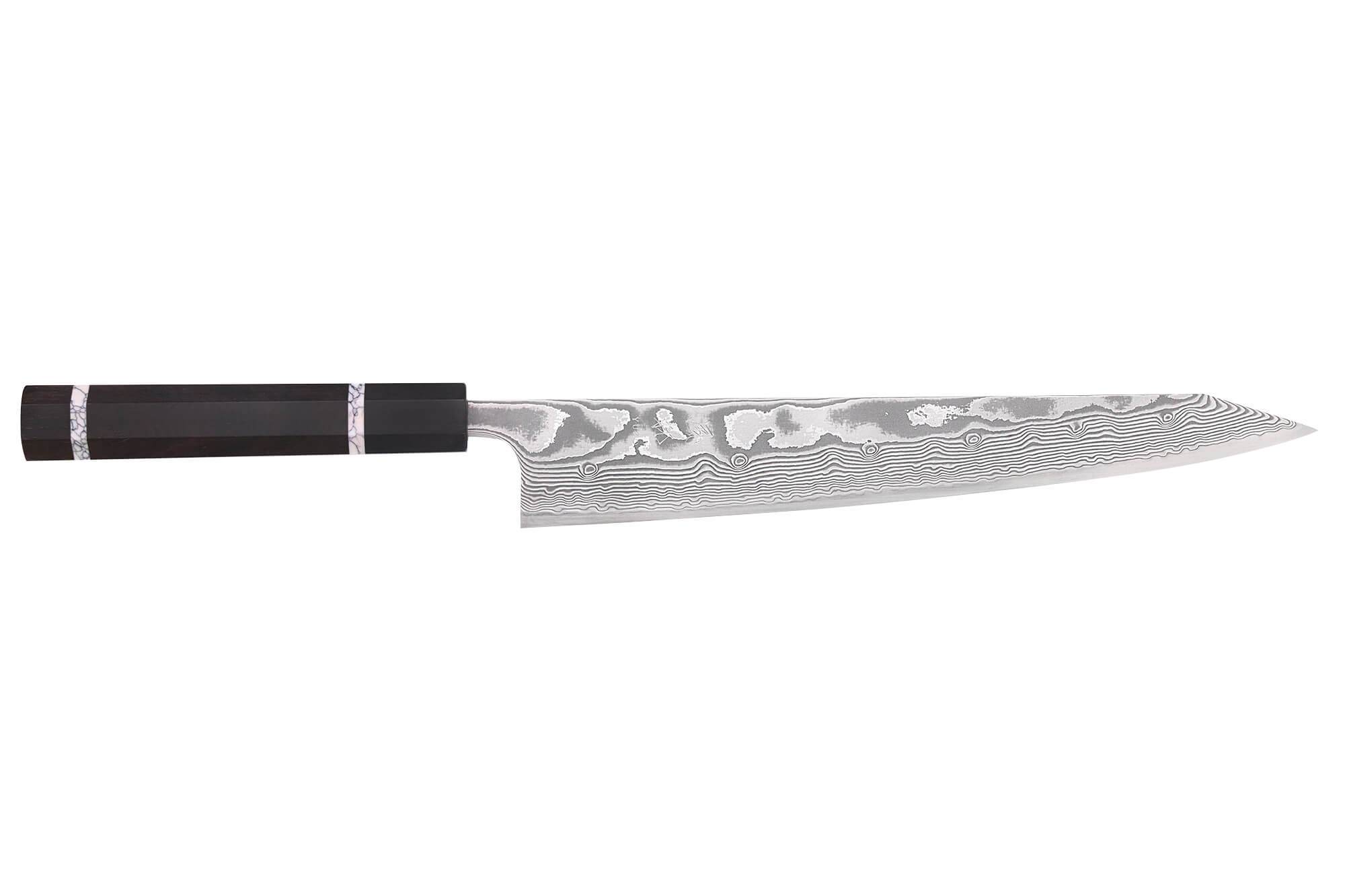 Découvrez un couteau sujihiki kiritsuke 27 cm Yuzo Kanko où l’exigence artisanale japonaise rencontre l’élégance intemporelle du damas pour sublimer chaque découpe !
