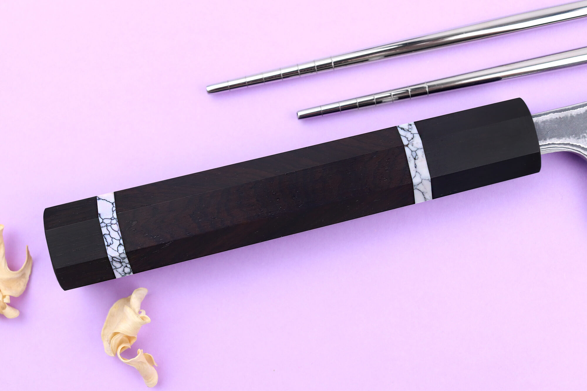 Deux anneaux en pierre de turquoise viennent souligner le manche, ajoutant une touche décorative originale et renforçant le caractère artisanal de votre couteau japonais de cuisine. Ce soin du détail témoigne de la volonté du coutelier de produire un outil aussi beau qu’efficace !