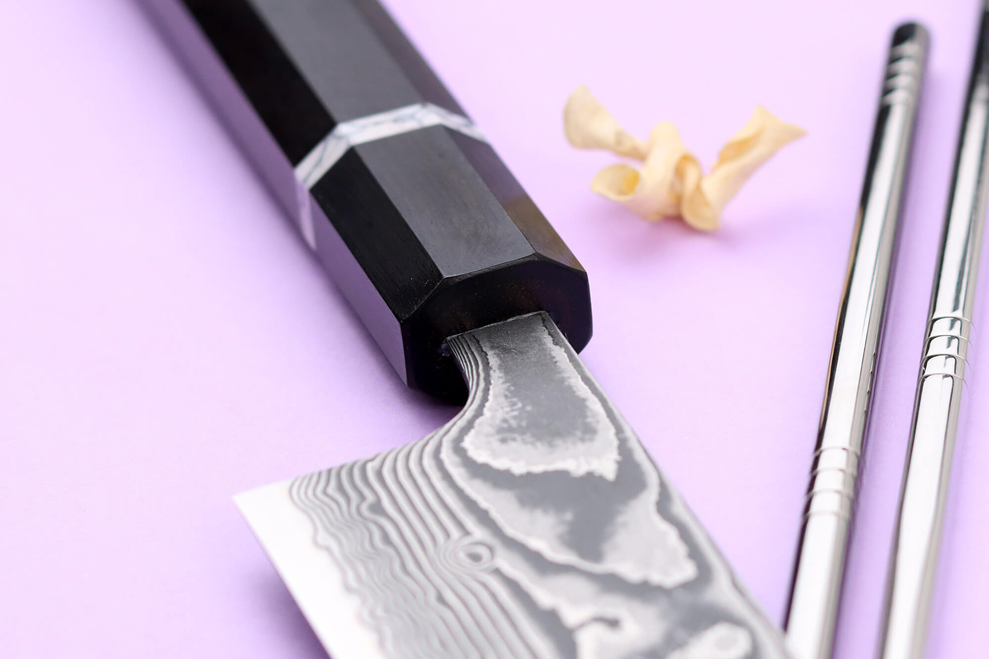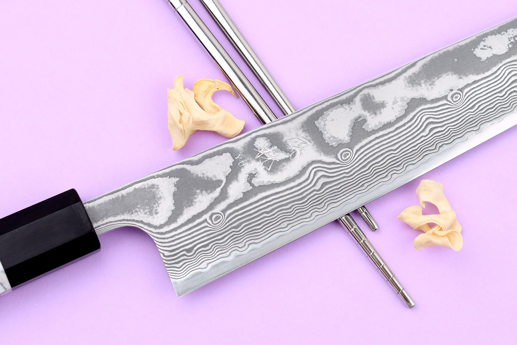 Le noyau est forgé en acier poudre SG2 japonais (également désigné sous le nom R2) enrichi à 1,3 % de carbone. Cet alliage haut de gamme permet d’atteindre 63HRC sur l’échelle de Rockwell, garantissant une tenue de coupe durable et un tranchant remarquable même après de nombreux usages.
