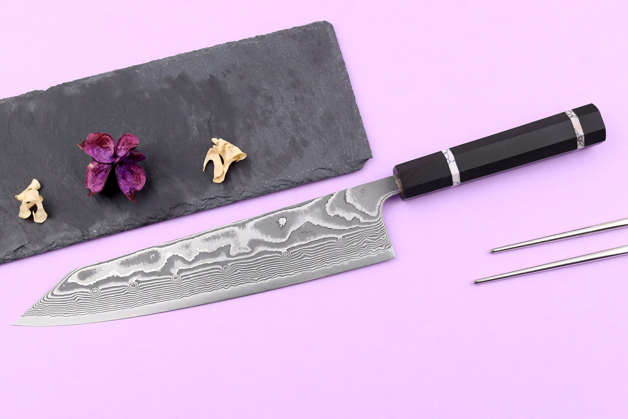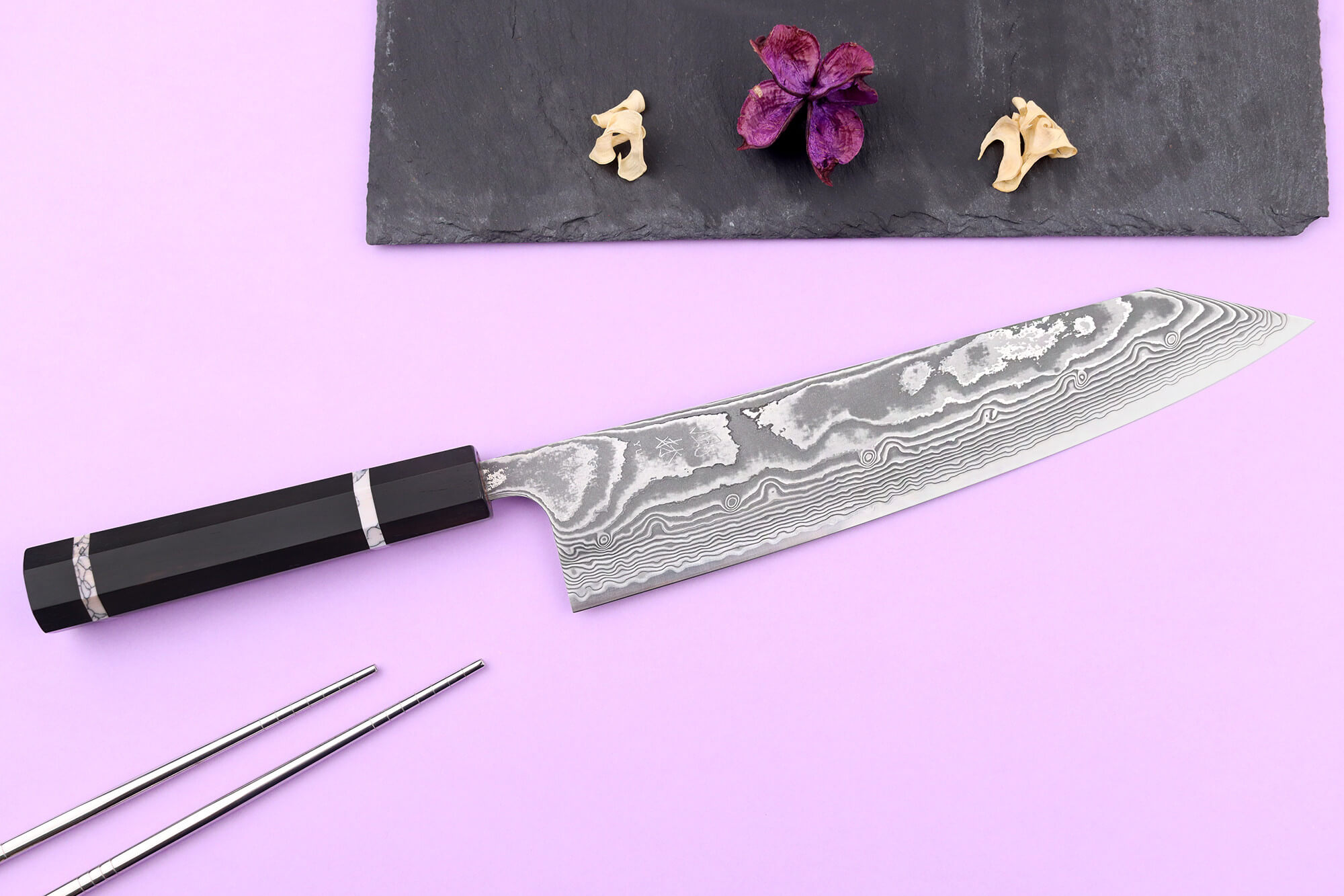Votre couteau kiritsuke dispose d'une lame de 24cm avec une structure damassée : il s'agit d'une technique de forge qui consiste à réaliser un noyau en acier rigide entouré de plusieurs couches d'acier plus souples superposées. Cela permet d'obtenir une meilleure résistance ainsi qu'un meilleur équilibre de dureté.
