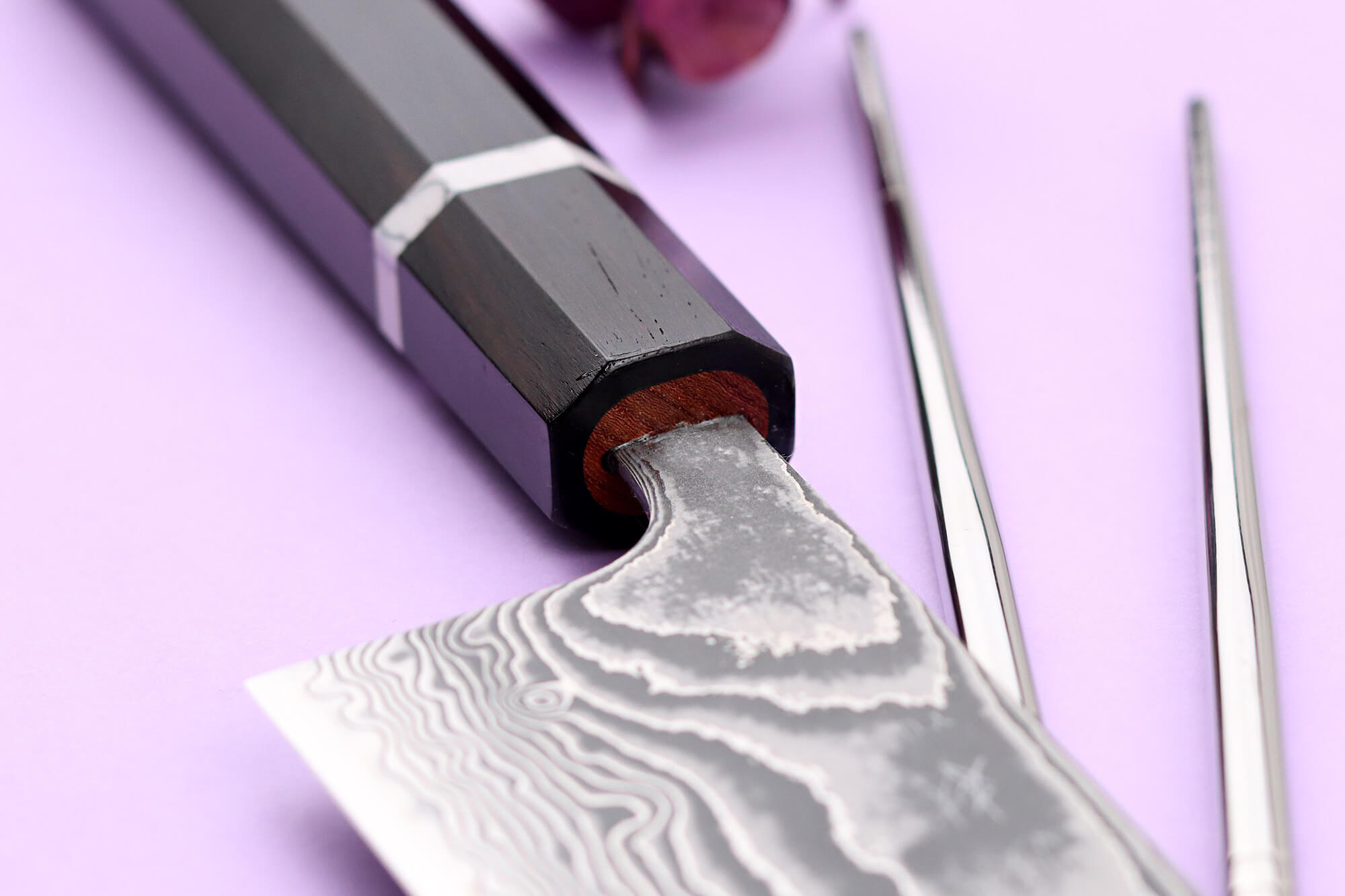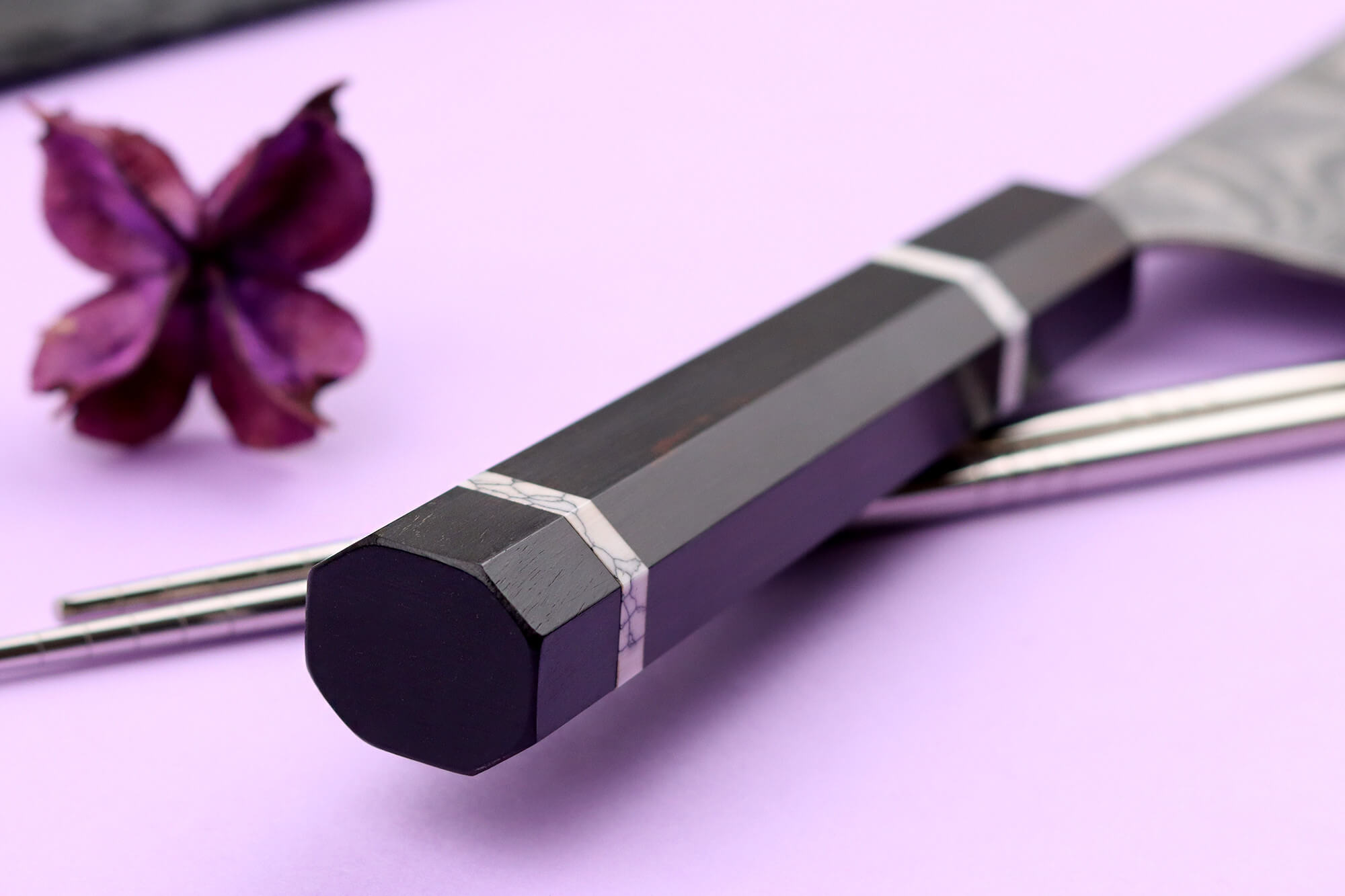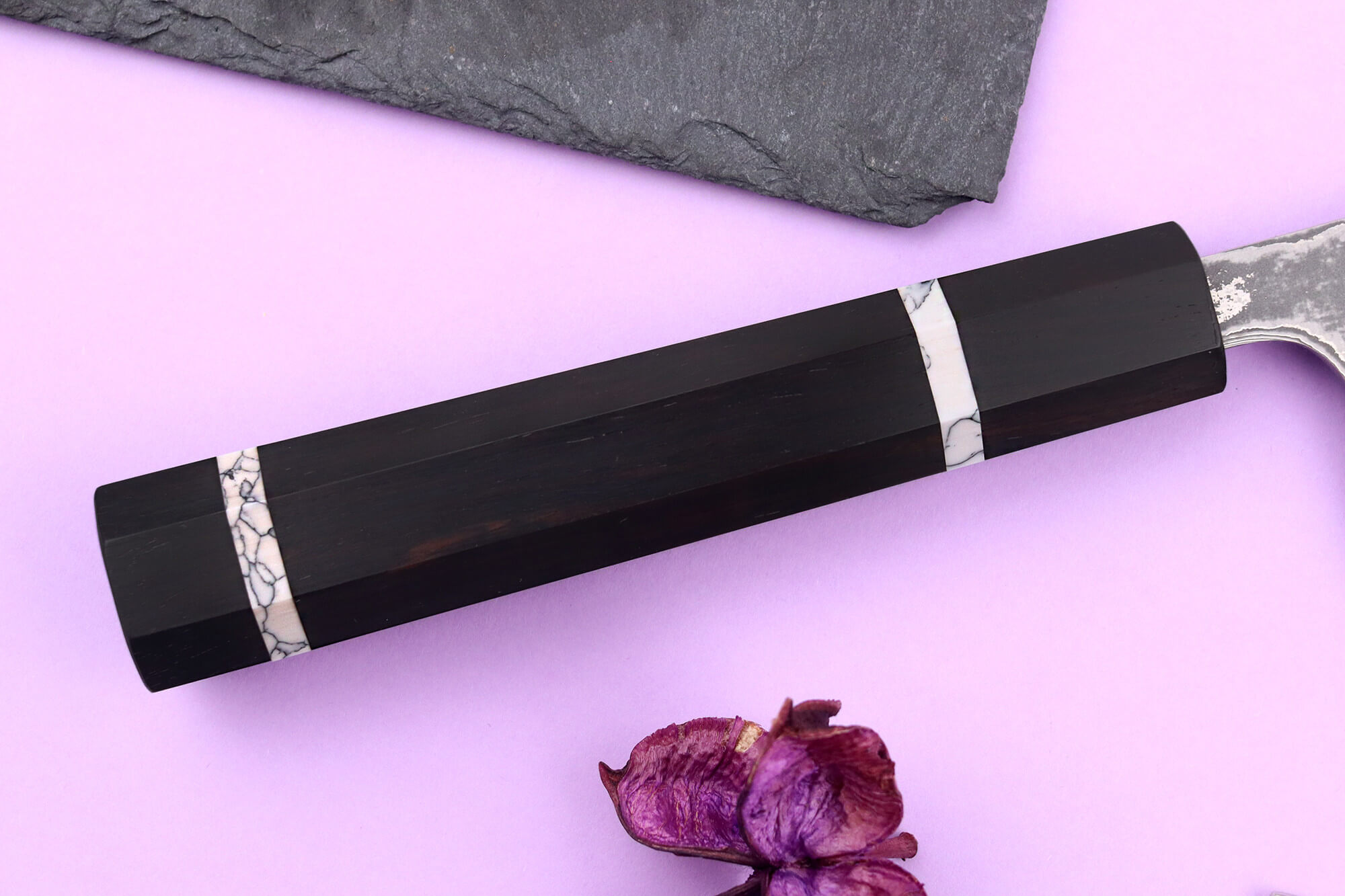 Le manche est façonné en bois d'ébène, une essence dense et durable, naturellement résistante à l’humidité et aux chocs. Le veinage sombre et les nuances profondes de ce bois en font un couteau japonais de cuisine au design élégant.