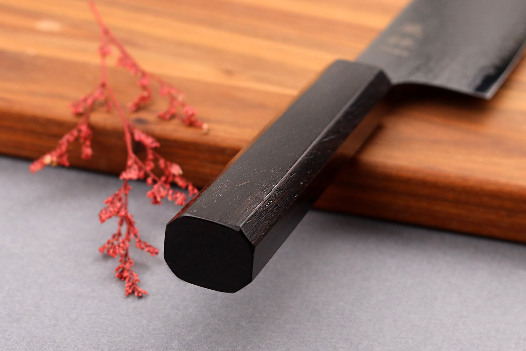 Le manche de votre couteau japonais de cuisine est fabriqué entièrement en bois d’ébène, un matériau dense et naturellement résistant à l’humidité. Sa teinte sombre, presque noire, s’accorde avec sobriété à la lame polie et foncée. Sa finition lisse offre un toucher sec et agréable, même avec les mains légèrement humides.