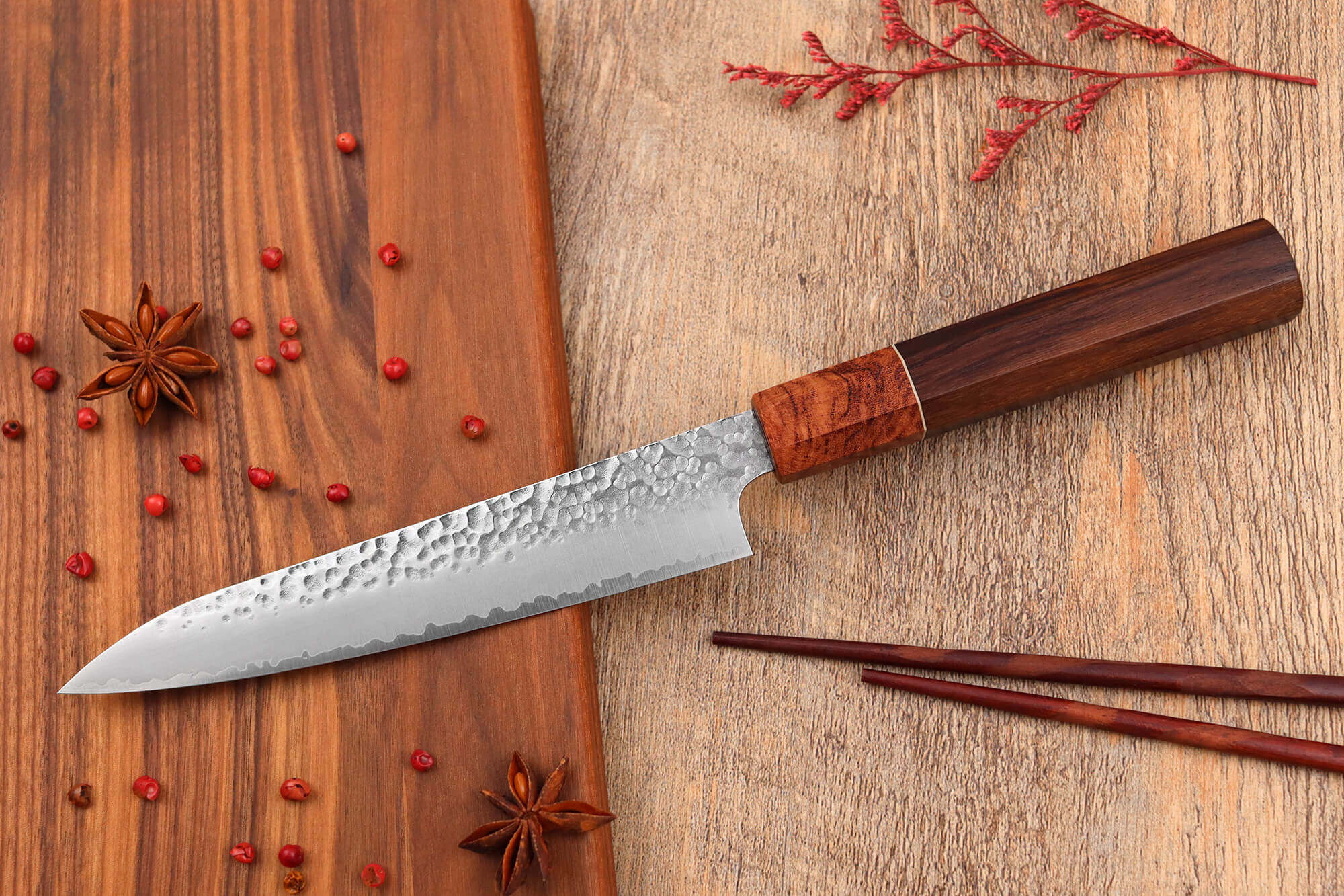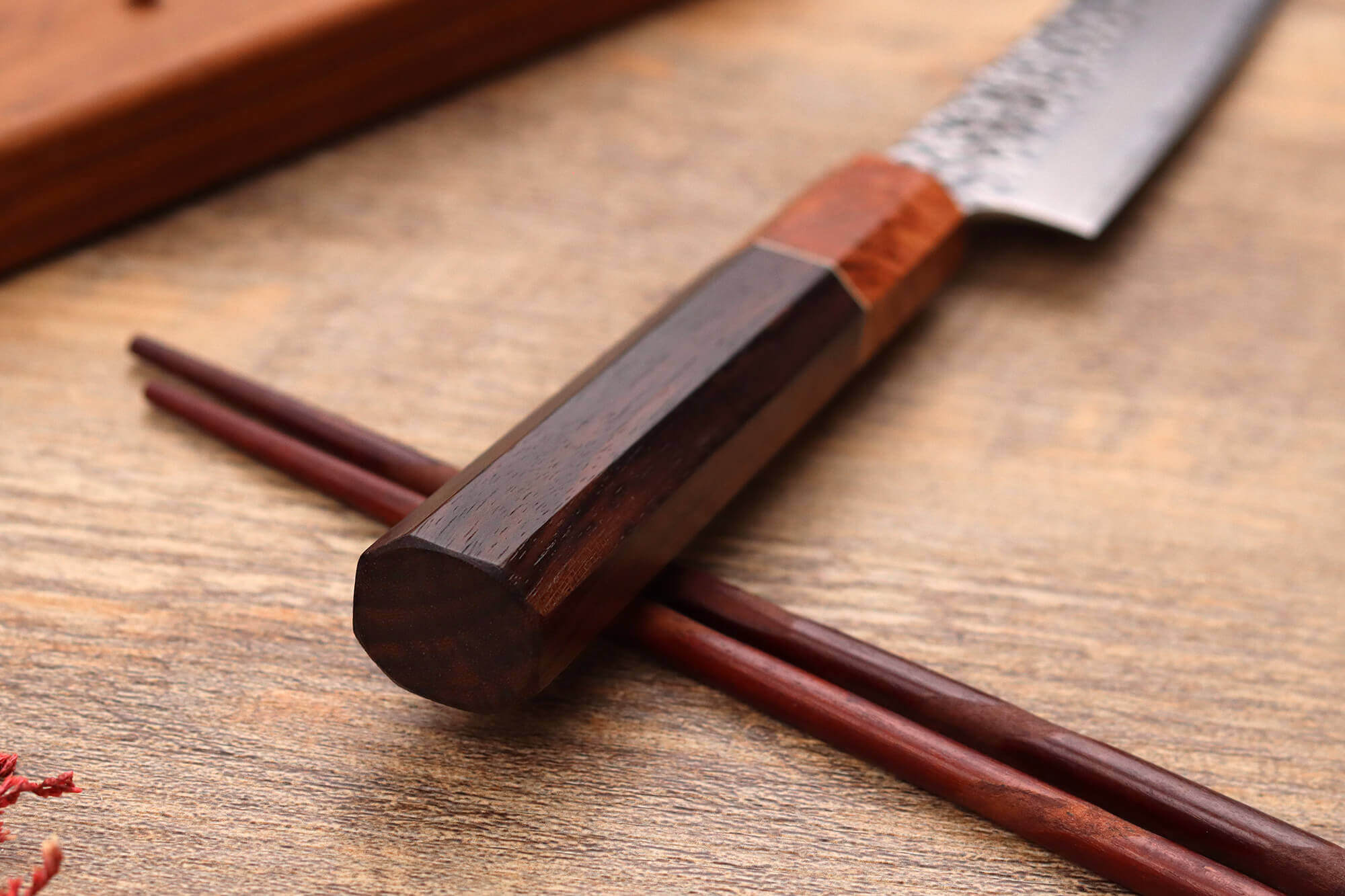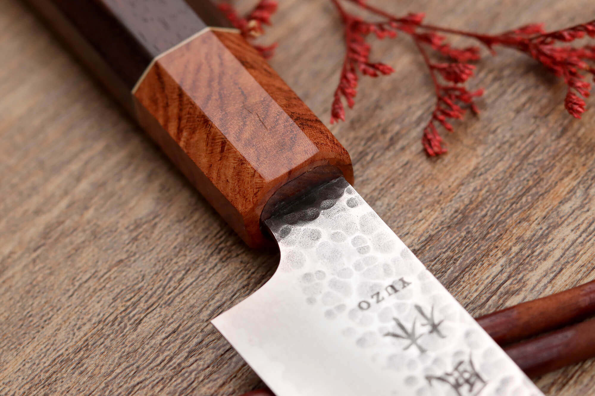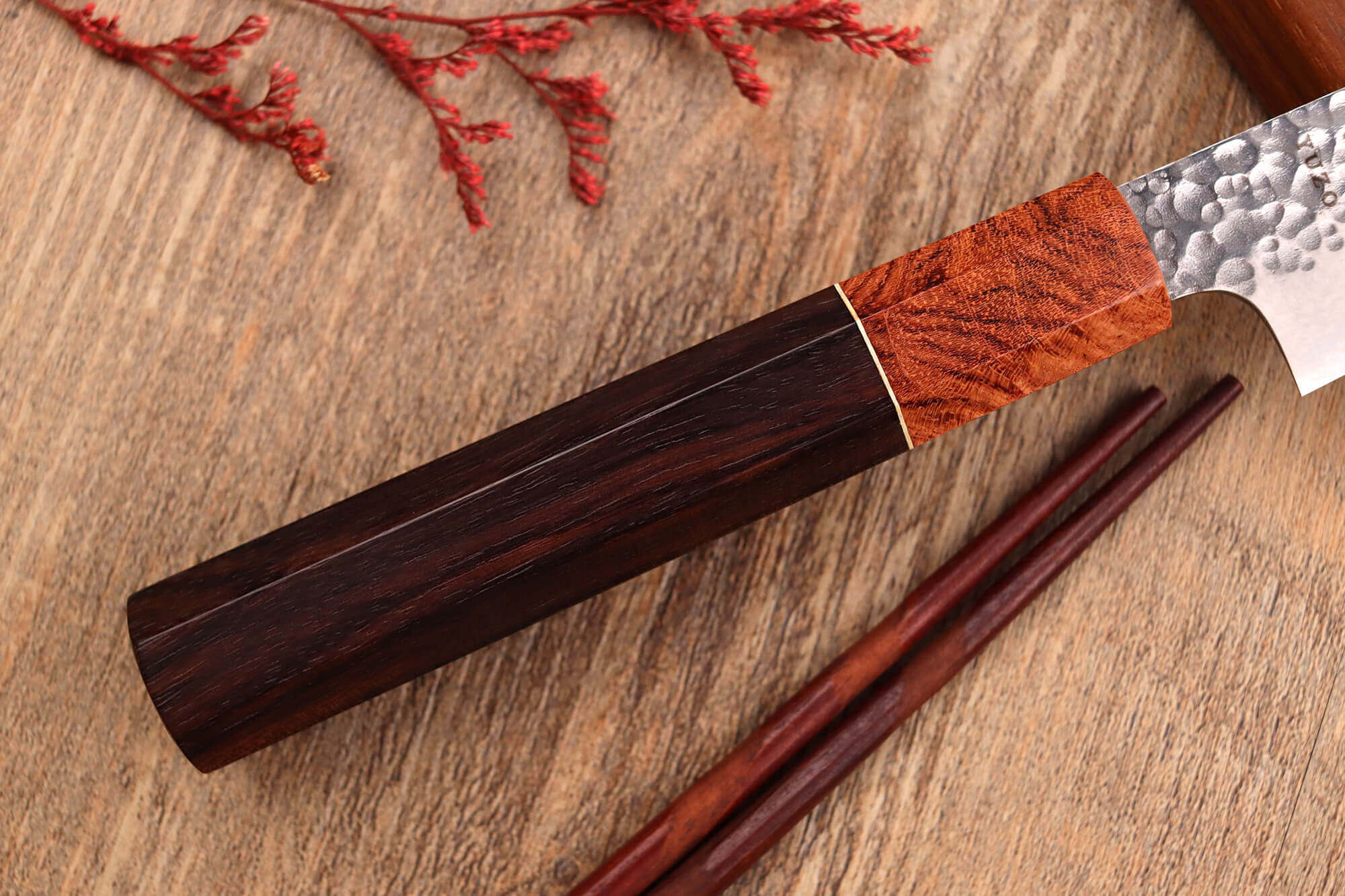 Le manche de ce couteau artisanal japonais est fabriqué en bois de rose, une essence exotique réputée pour sa grande résistance et sa durabilité. Contrairement au bois de magnolia, traditionnellement utilisé pour les couteaux japonais, le bois de rose offre une meilleure résistance à l'humidité. Il présente des couleurs chaudes et un veinage unique, apportant un aspect chaleureux et distinctif à chaque couteau Yuzo !