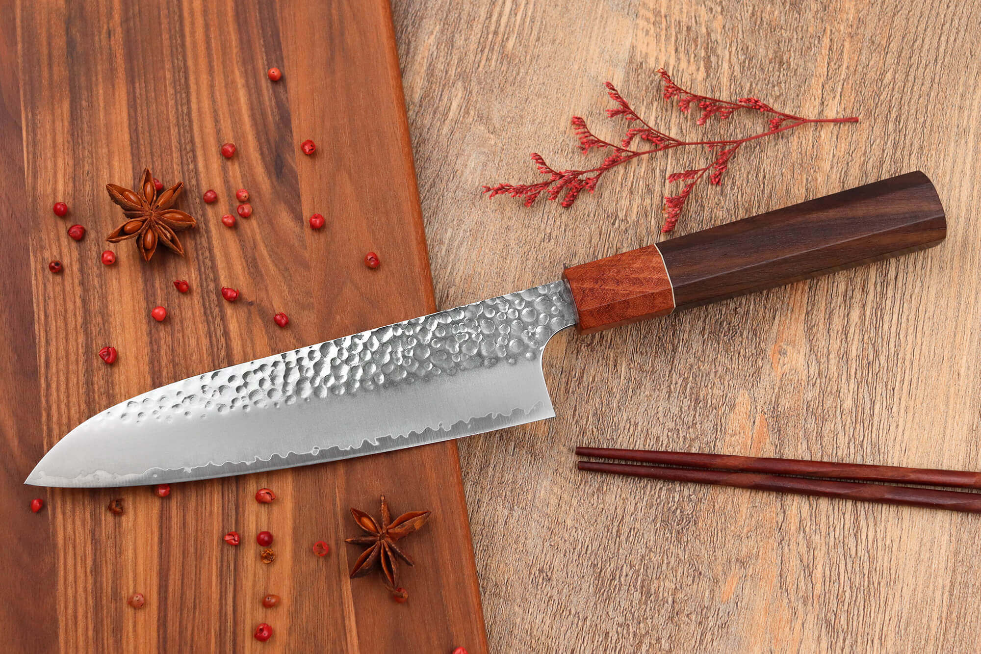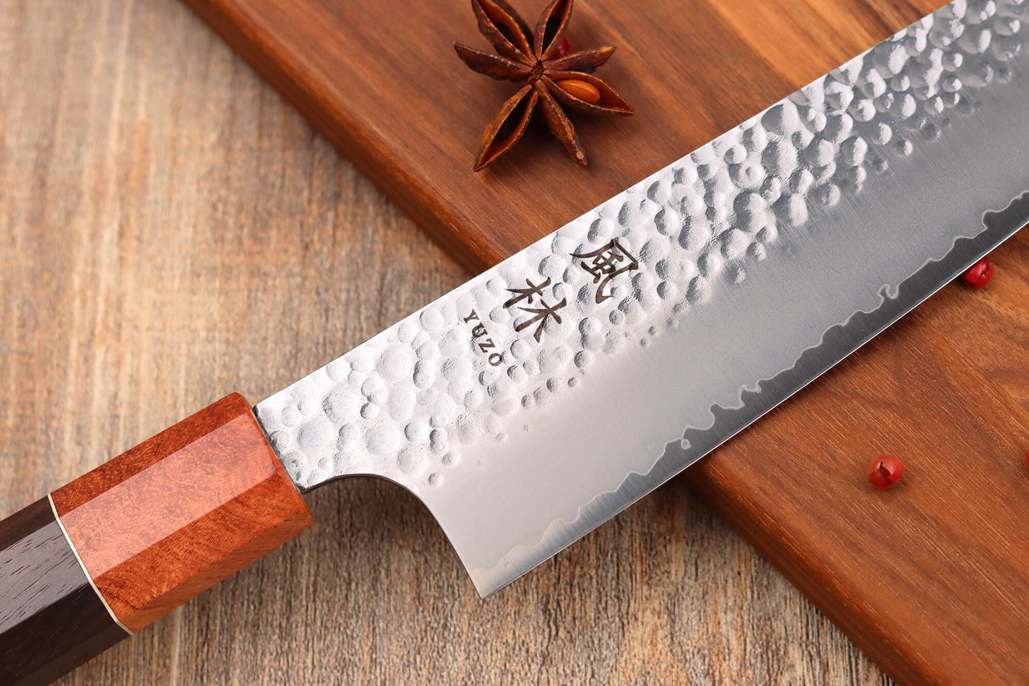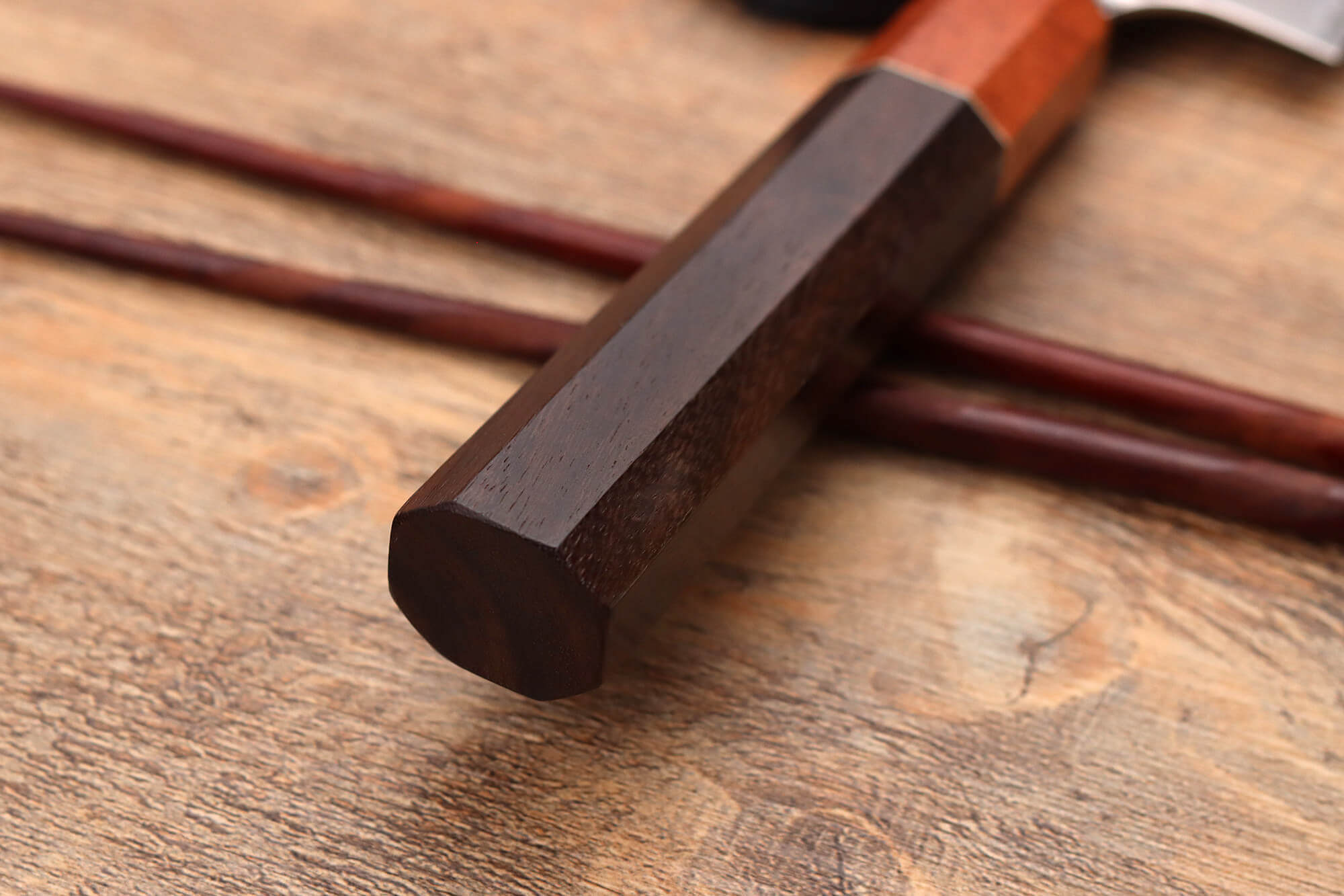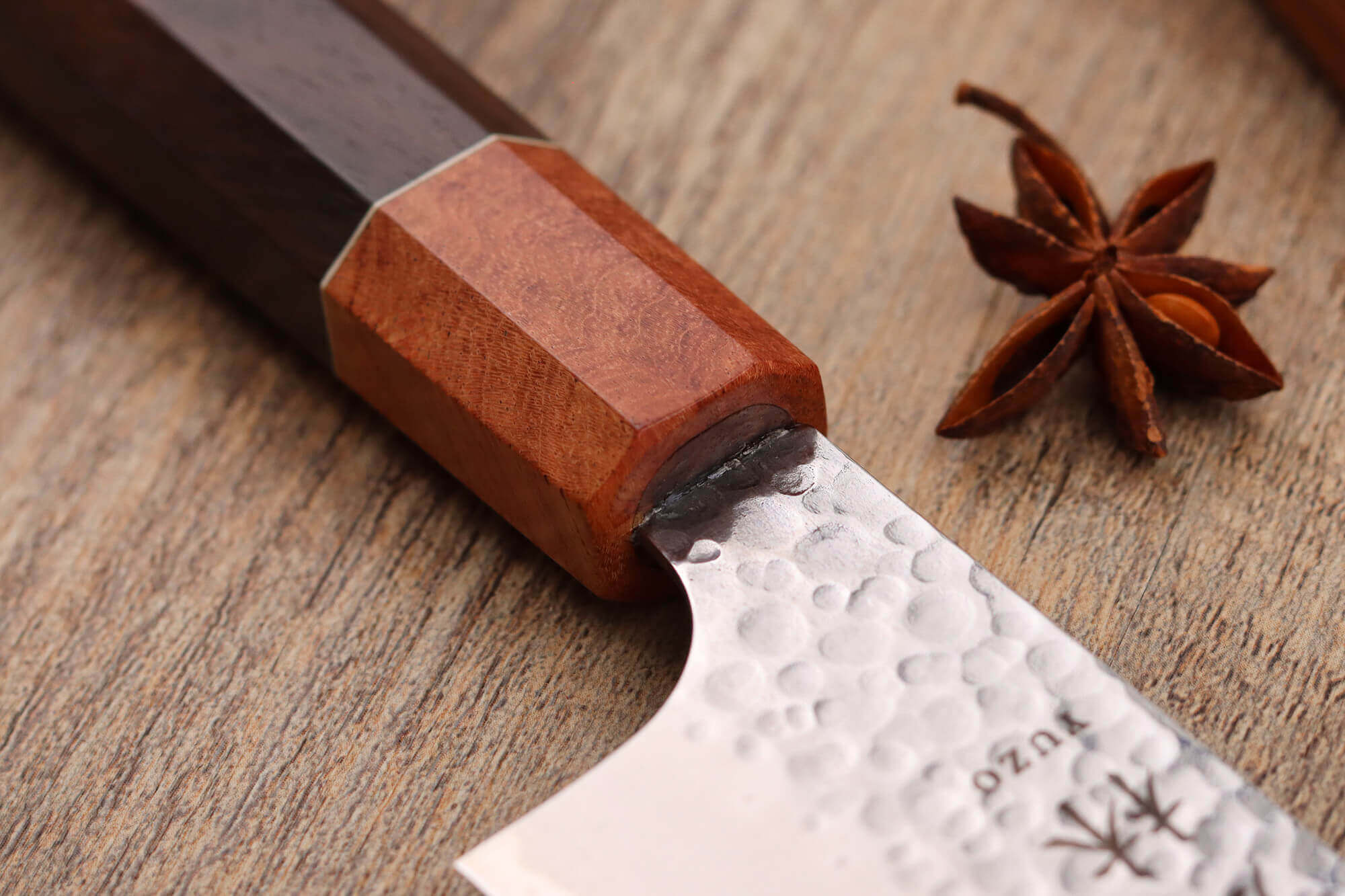 Le manche de ce couteau artisanal japonais est conçu en bois de rose, une essence exotique connue pour sa résistance et sa grande durabilité. Traditionnellement, le bois de magnolia est utilisé pour la confection des couteaux artisanaux, mais le bois de rose est choisi ici pour sa meilleure résistance à l'humidité. Ce bois présente des nuances chaudes pour un aspect visuel chaleureux et arbore un veinage qui est unique à chaque couteau Yuzo !
