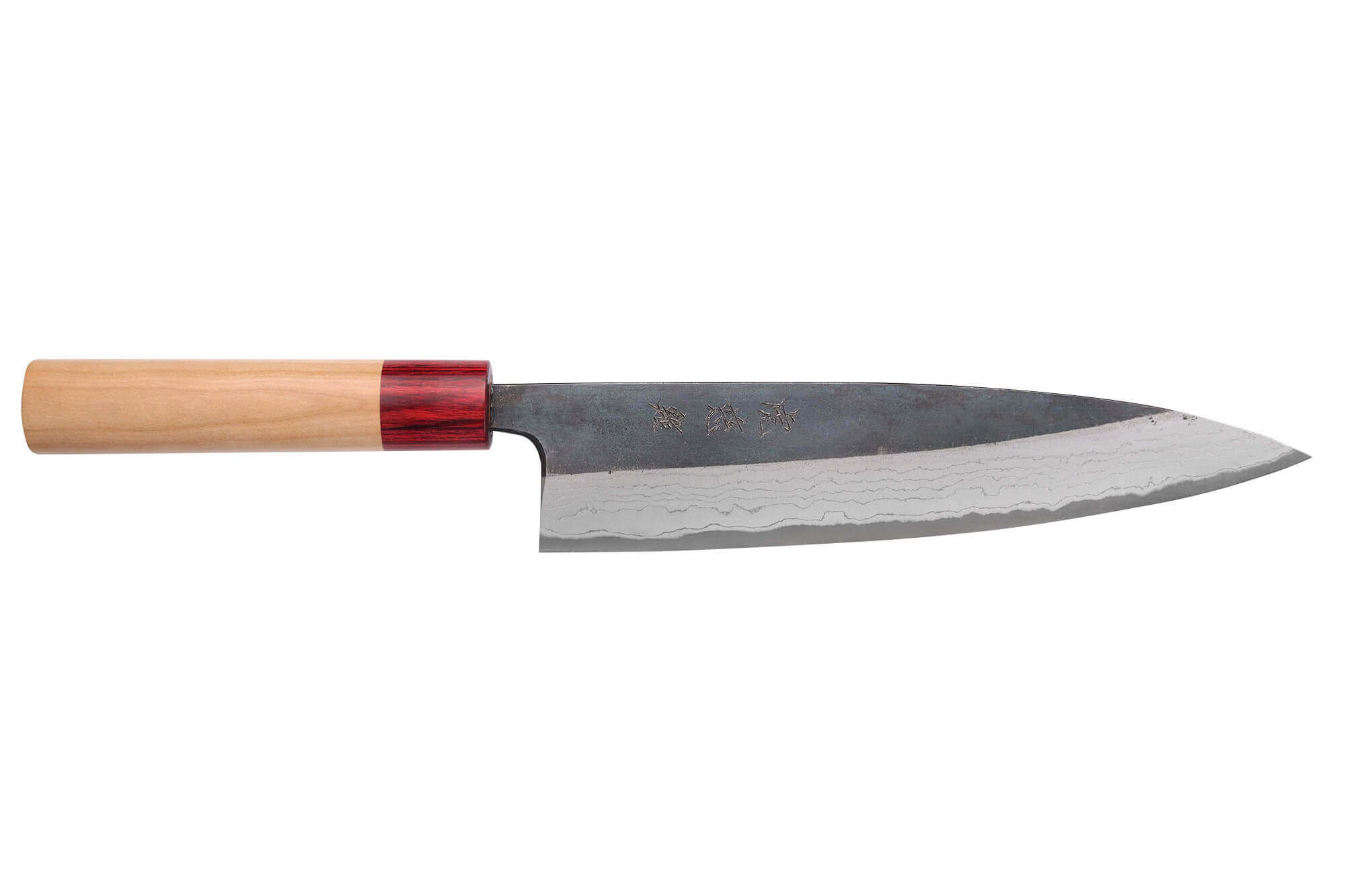 Enfin, la lame arbore des kanjis gravés à la main, une signature qui accentue son authenticité. Sa finition brute de forge, avec son aspect sombre et rustique, renforce l’allure traditionnelle de ce couteau gyuto. Très prisée par les chefs japonais, cette finition met en valeur son caractère artisanal et intemporel.