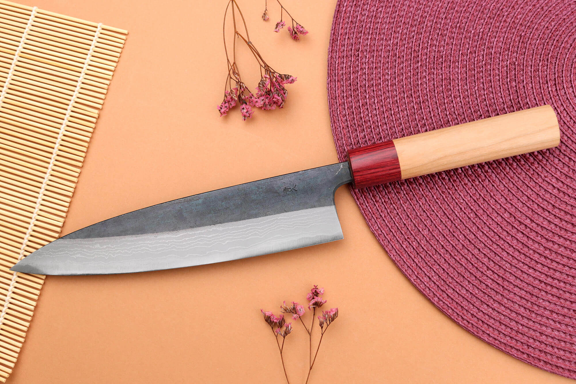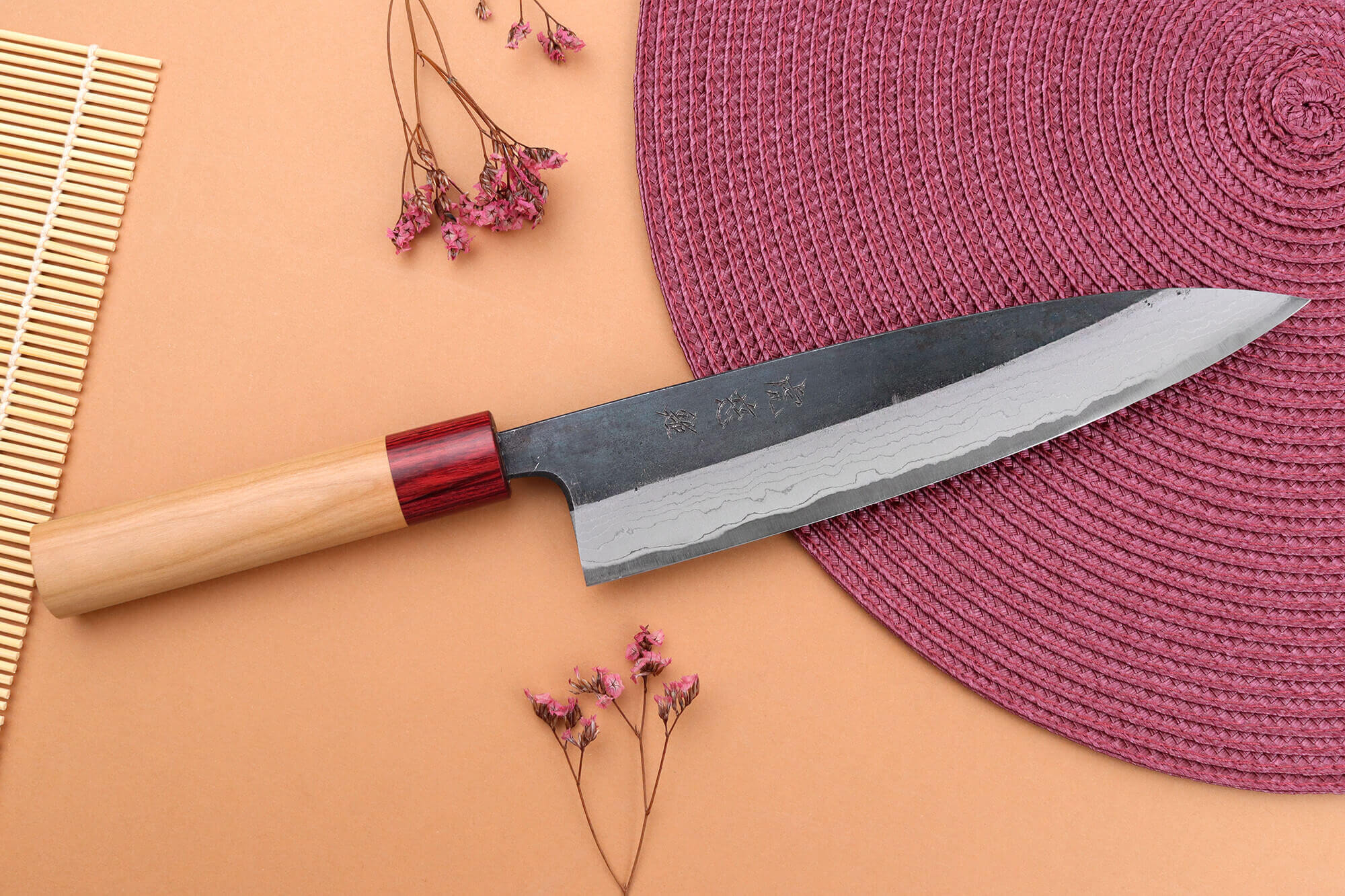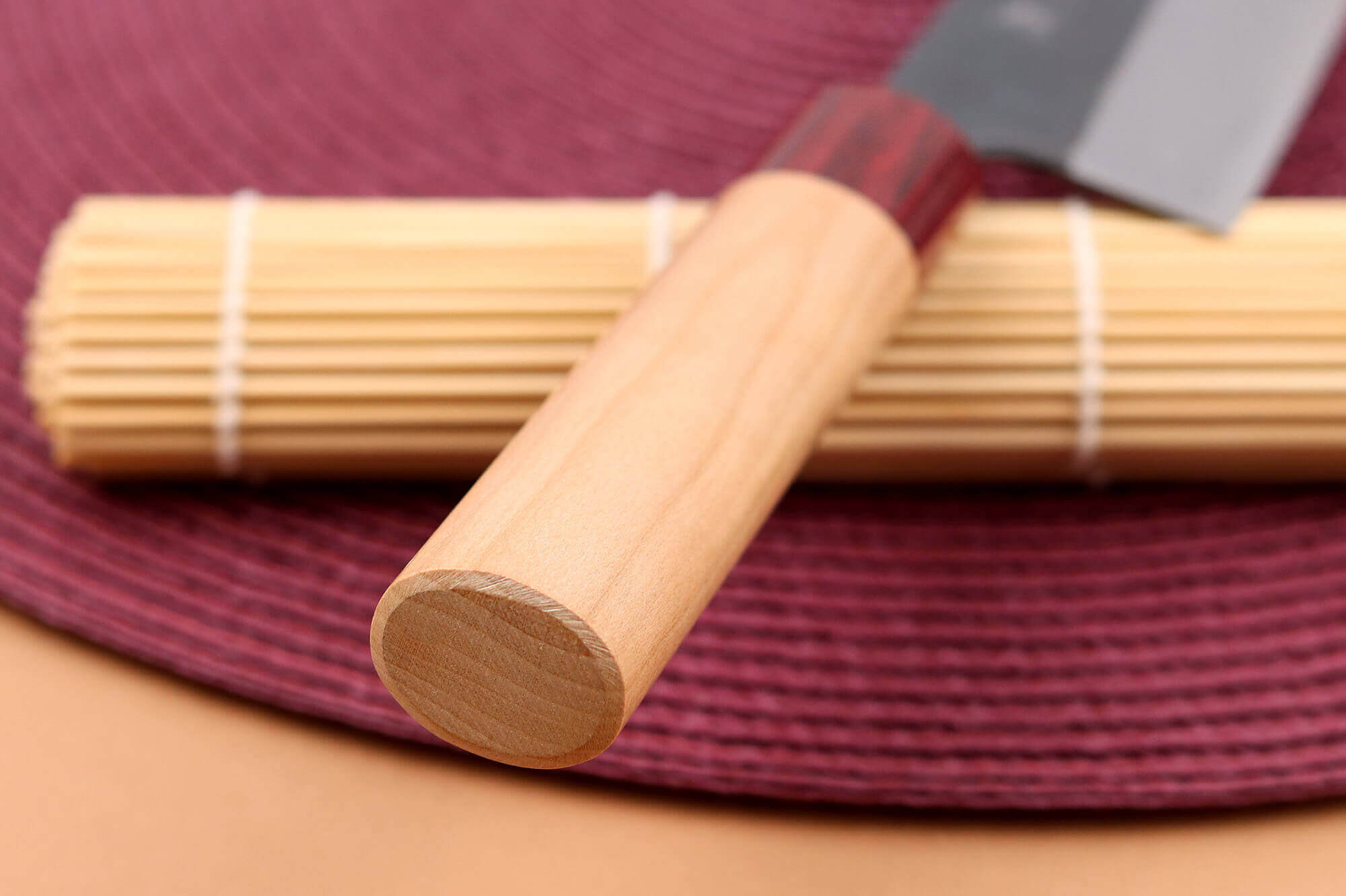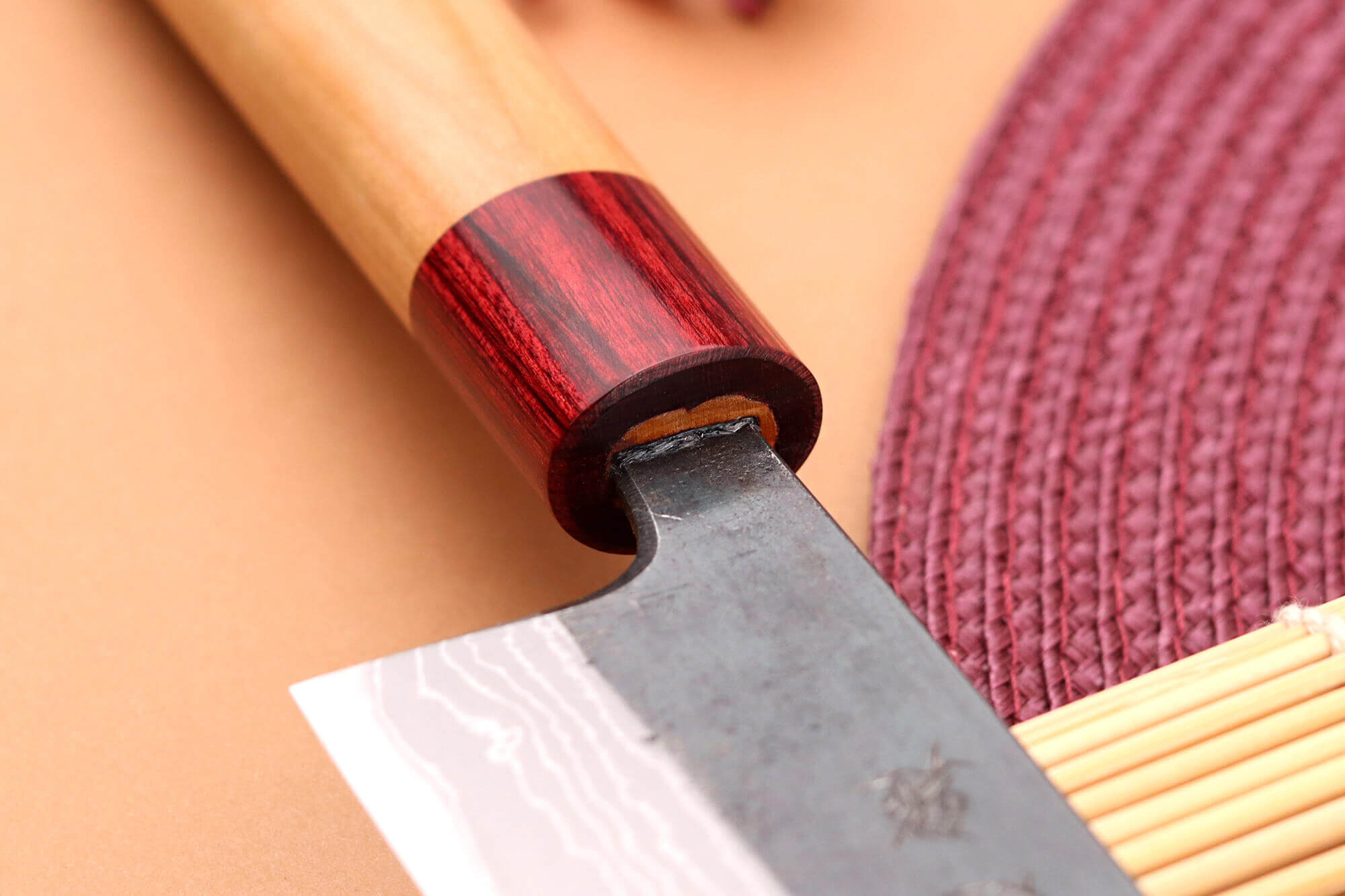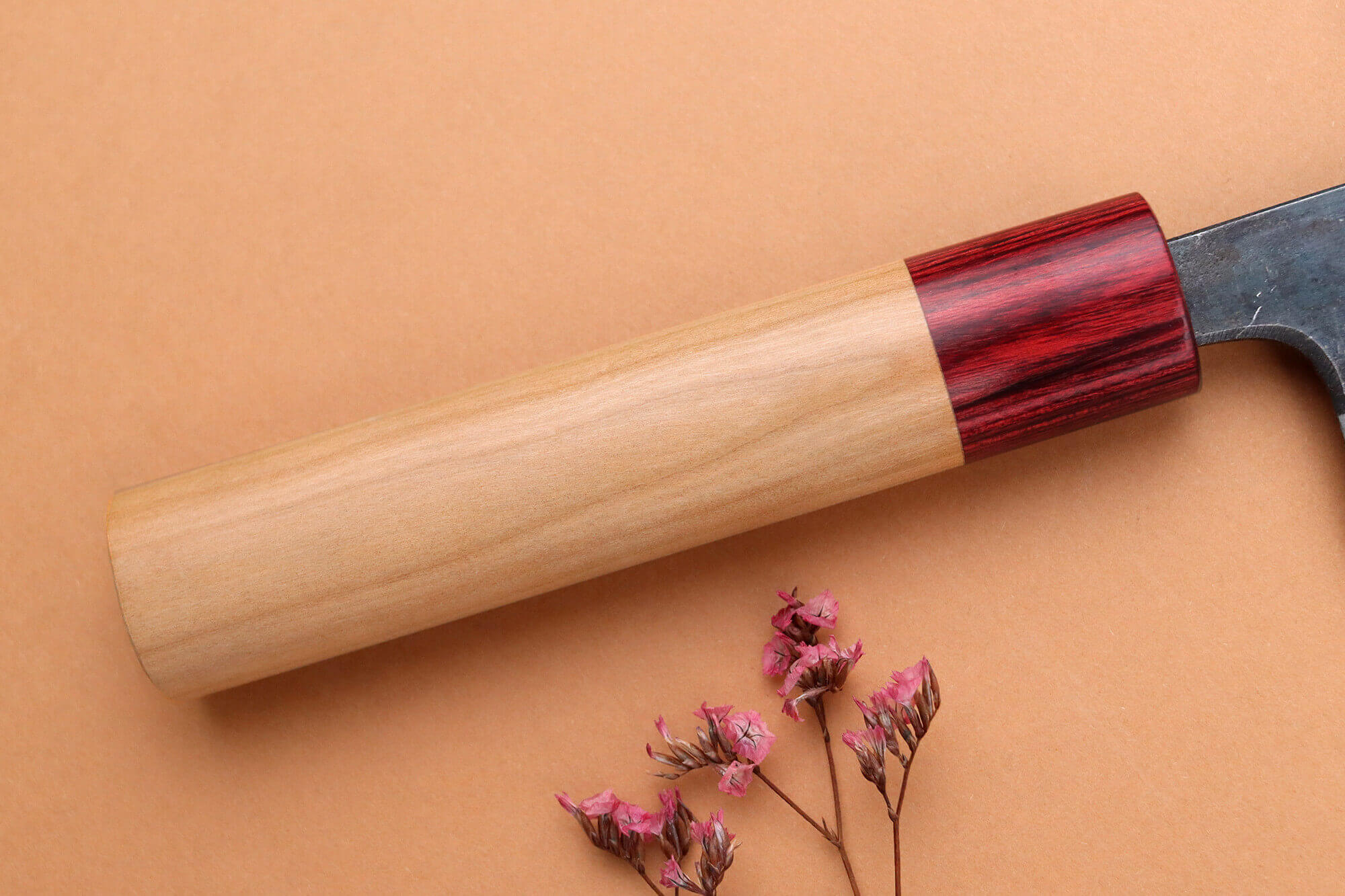 Le manche de votre couteau de chef japonais est conçu en bois de cerisier, une essence robuste et emblématique du Japon. Ce bois se distingue par ses teintes claires et son veinage naturel, offrant un design chaleureux et raffiné.