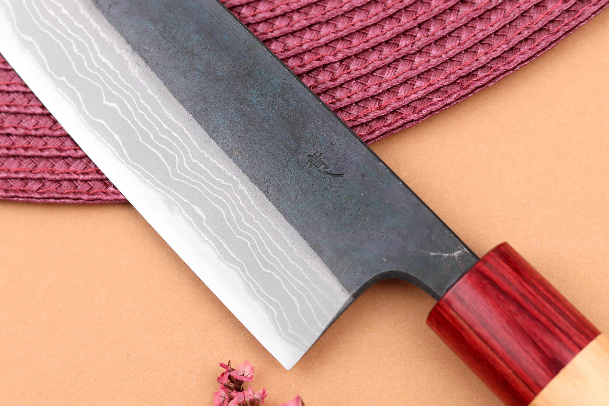Le noyau en acier carbone est enveloppé de plusieurs couches de fer plus tendre, ce qui confère à la lame une certaine souplesse (sans pour autant la rendre flexible) et une meilleure résistance aux cassures. Les différentes couches d’acier sont visibles le long du fil de coupe, formant de délicates vagues aux motifs aléatoires, uniques à chaque couteau Wusaki !
