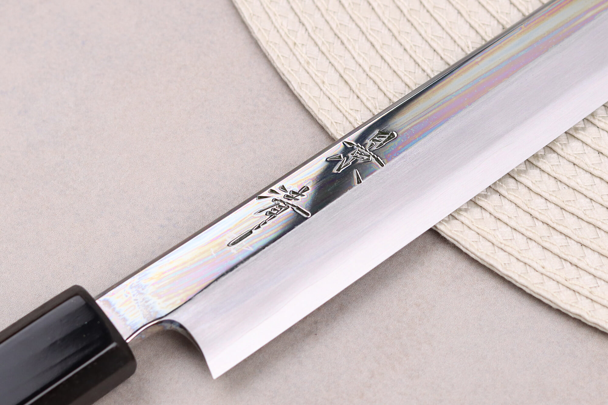 L'arête supérieure a été soigneusement polie pour offrir un meilleur confort aux cuisiniers qui placent leur index sur cette partie lors de la découpe. De plus, des kanjis gravés à la main ornent la surface de la lame, qui arbore une finition polie effet miroir sur sa partie supérieure, ajoutant une touche d'élégance !