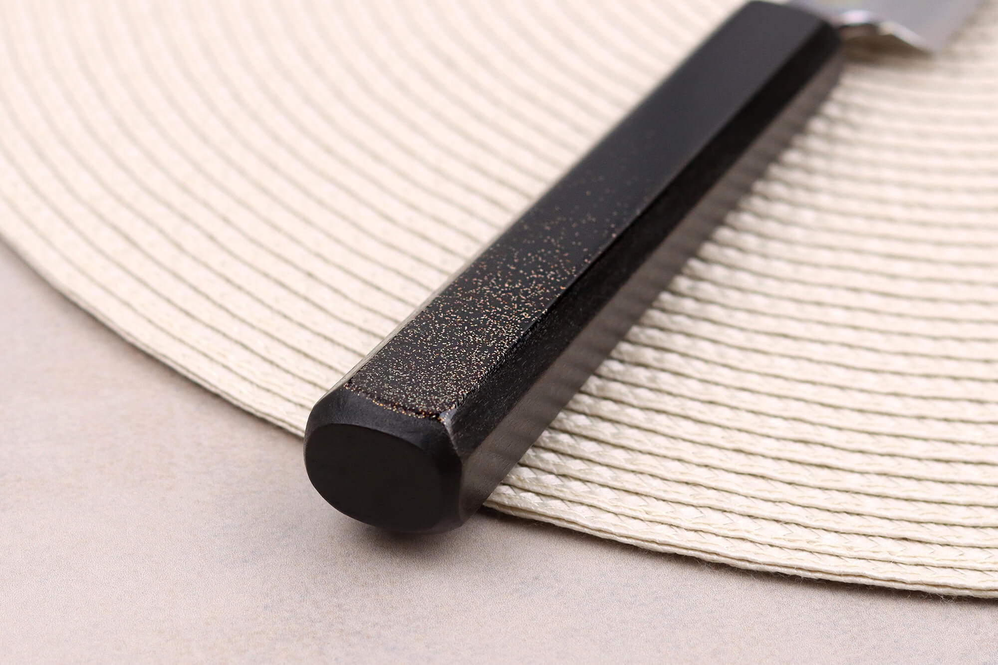 Sa forme octogonale assure une prise en main ergonomique, adaptée à tous les cuisiniers. Deux des facettes du manche sont ornées de fines paillettes dorées à leur base, apportant une touche élégante !