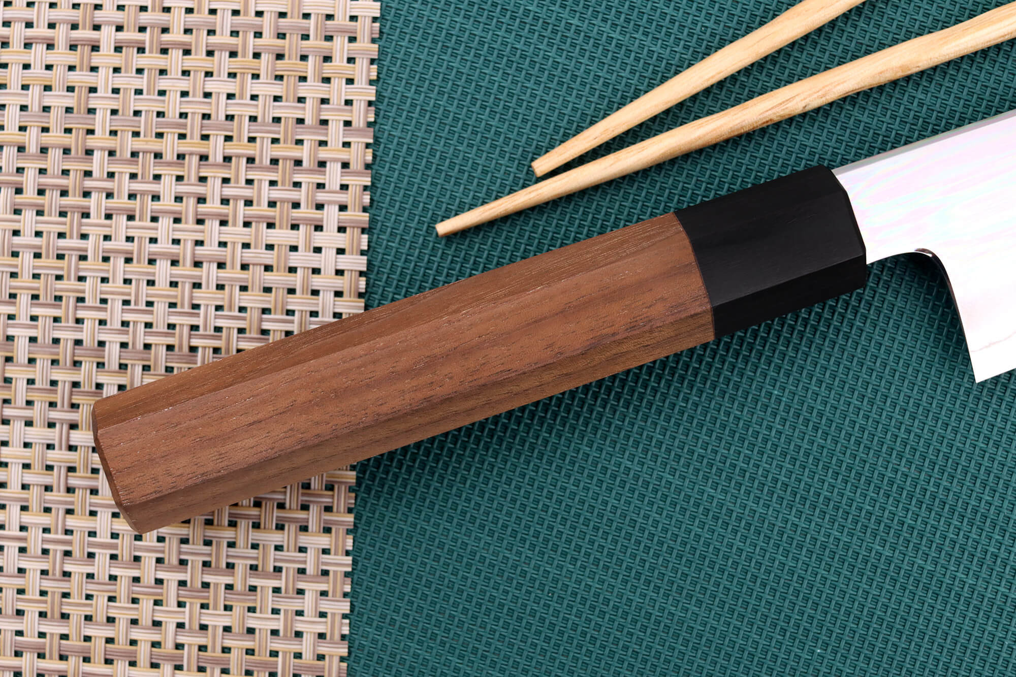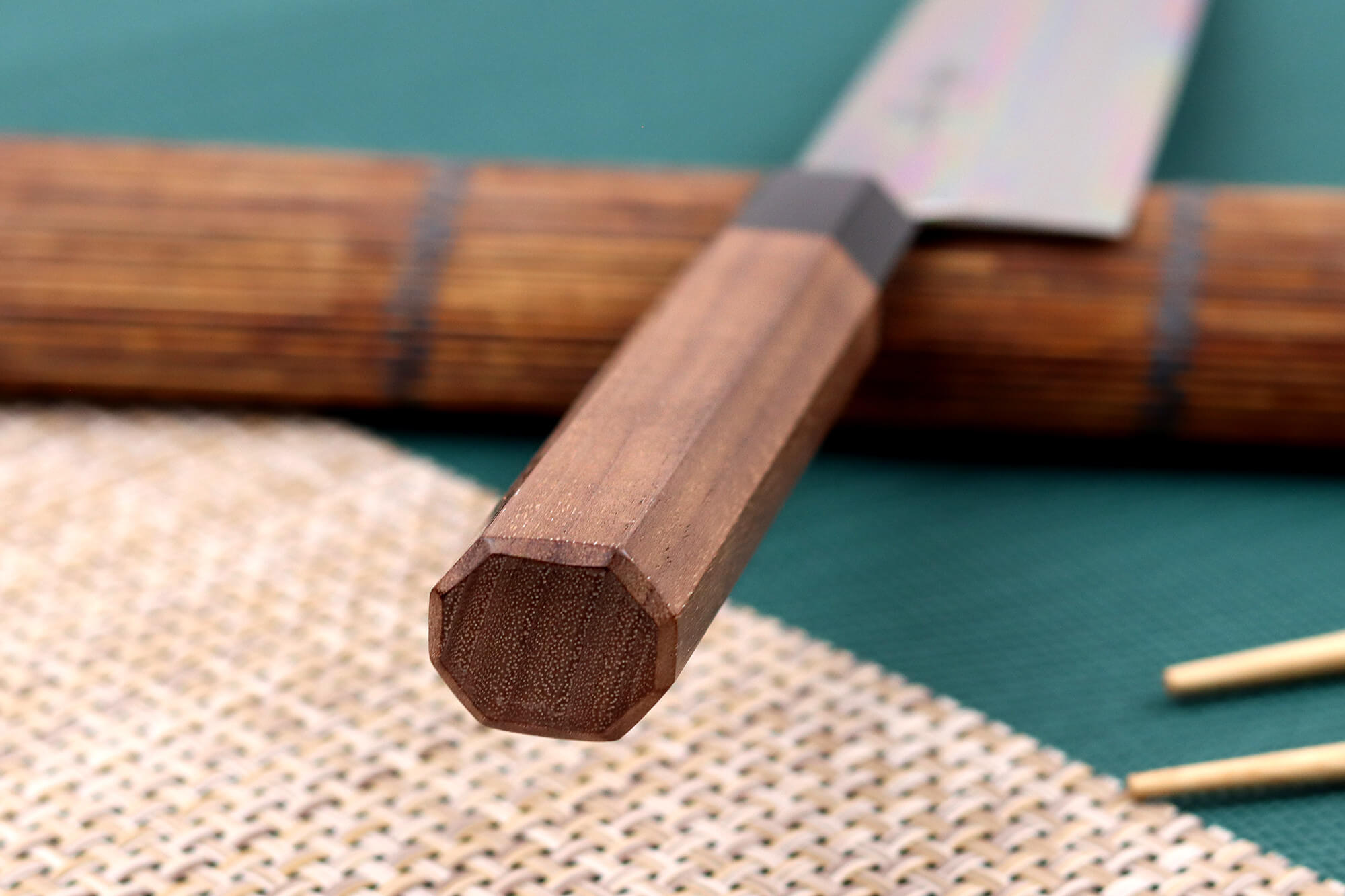 Le manche de ce couteau de chef kiritsuke est taillé de forme octogonale et permet une prise sûre et naturelle, adaptée aussi bien aux cuisiniers droitiers que gauchers. Il vous offre une prise en main ergonomique, idéale pour les longues sessions de découpes en cuisine !