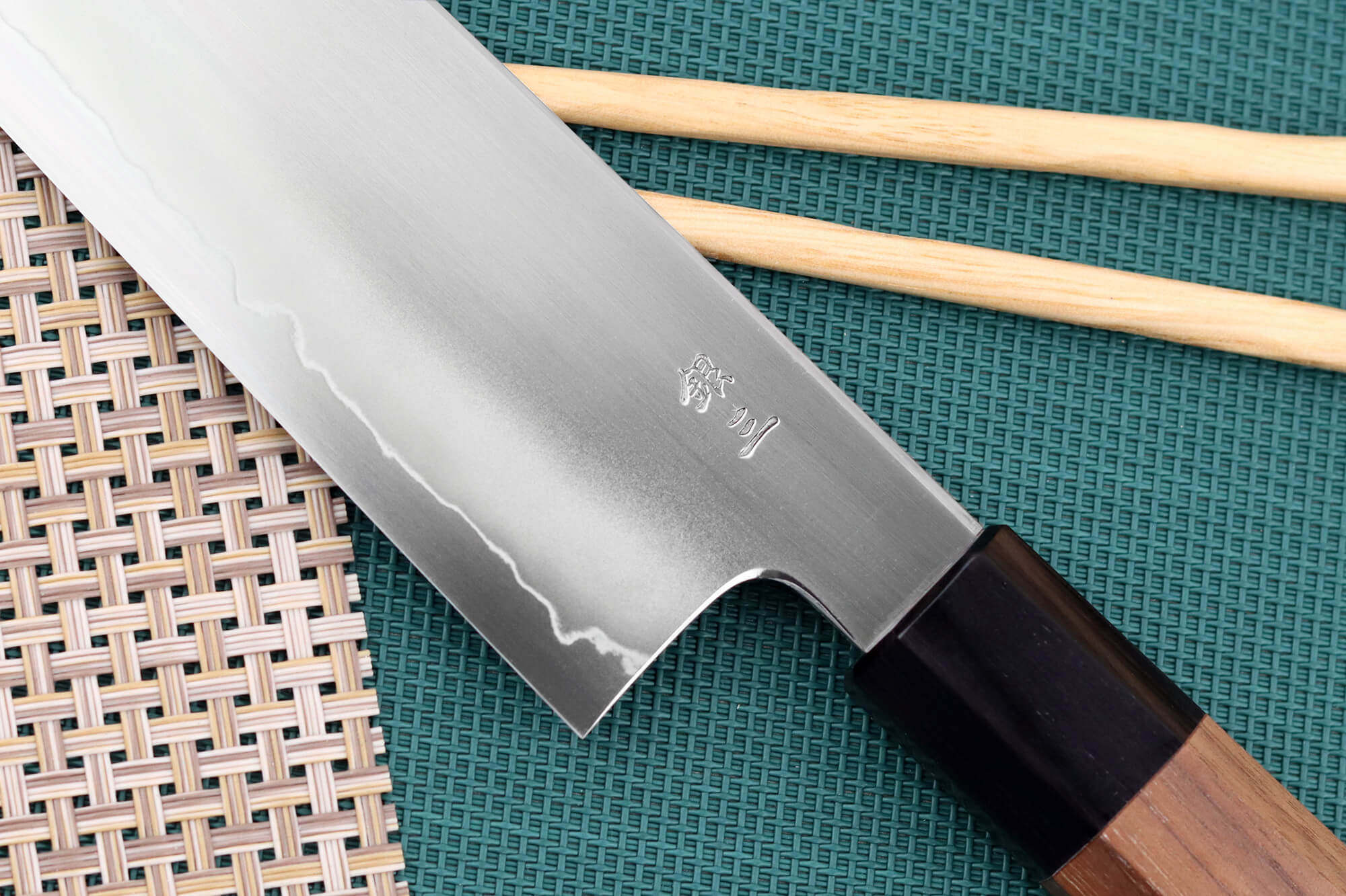 Pour la réalisation de cette gamme, la famille a collaboré avec Satoshi Nakagawa, un jeune forgeron formé dès l’âge de 18 ans auprès du maître Kenichi Shiraki, pendant plus de 15 ans. Aujourd’hui à la tête de son propre atelier, il maîtrise un large éventail de techniques, de la forge au carbone traditionnel aux procédés plus complexes comme le Suminagashi ou le Honyaki. Il est également parfaitement à l’aise avec les aciers inoxydables tels que le VG10 ou le Ginsan, comme en témoigne ce modèle précis. Une belle démonstration de polyvalence et de rigueur artisanale.