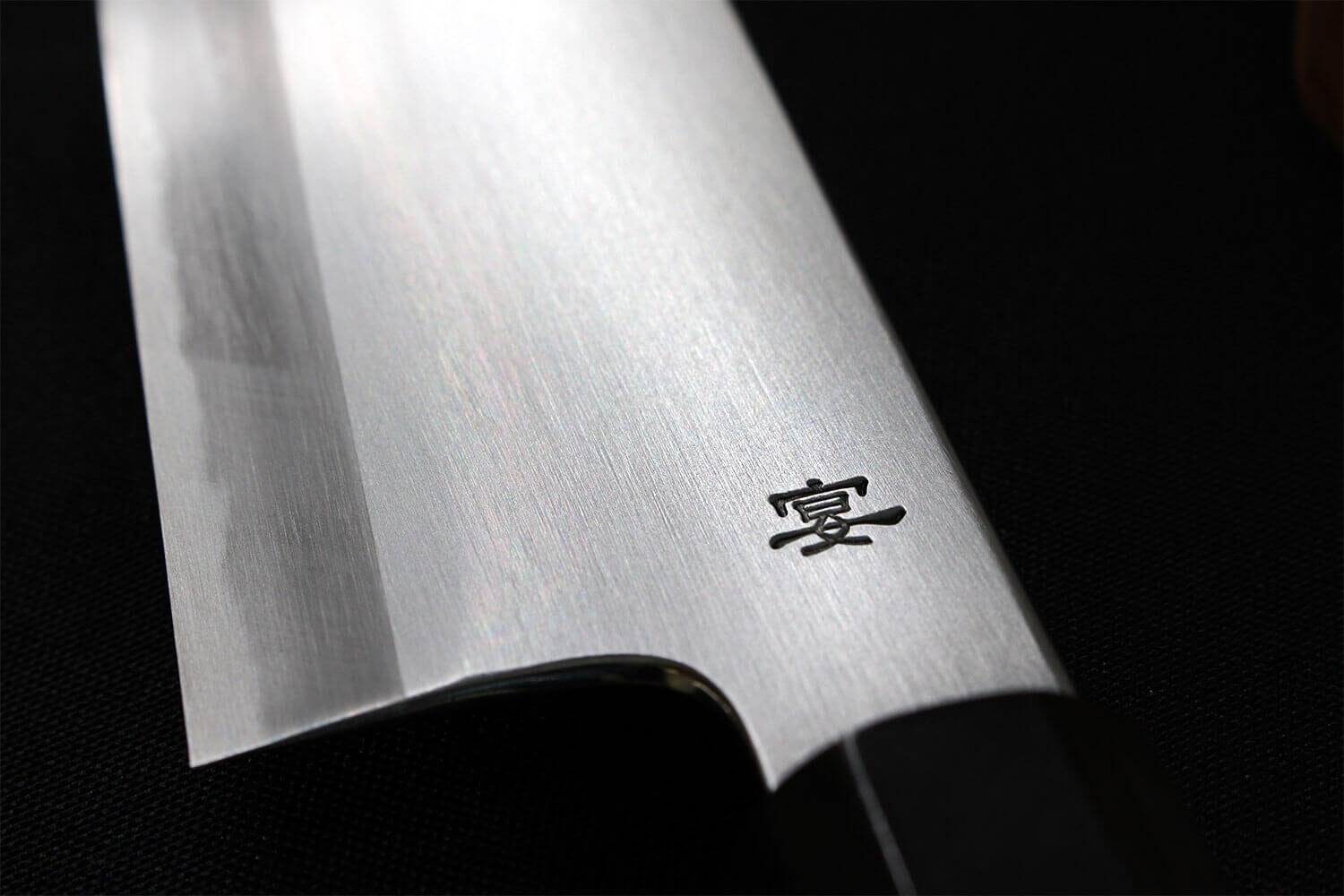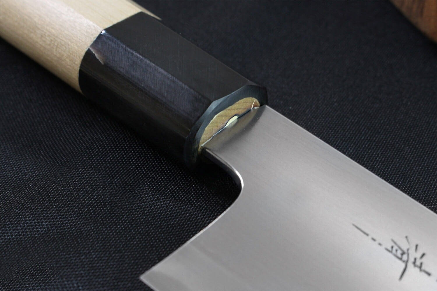 Notons que son arête supérieure, ainsi que la surface à la base de la lame, ont été polies, pour être plus agréables sous vos doigts. En effet, beaucoup de cuisiniers prennent leur couteau très haut sur le manche, et peuvent même poser leur index sur le dos du couteau. Les arêtes polies sont bien plus confortables à l'usage. Le logo de la marque a été apposé sur la surface de coupe, et cette dernière bénéficie d'une finition traditionnelle, réalisée avec une technique d'aiguisage où l'on utilise des pierres de différents grains. Cette technique permet de faire ressortir une vague sur l'acier, qui apparait plus polie.