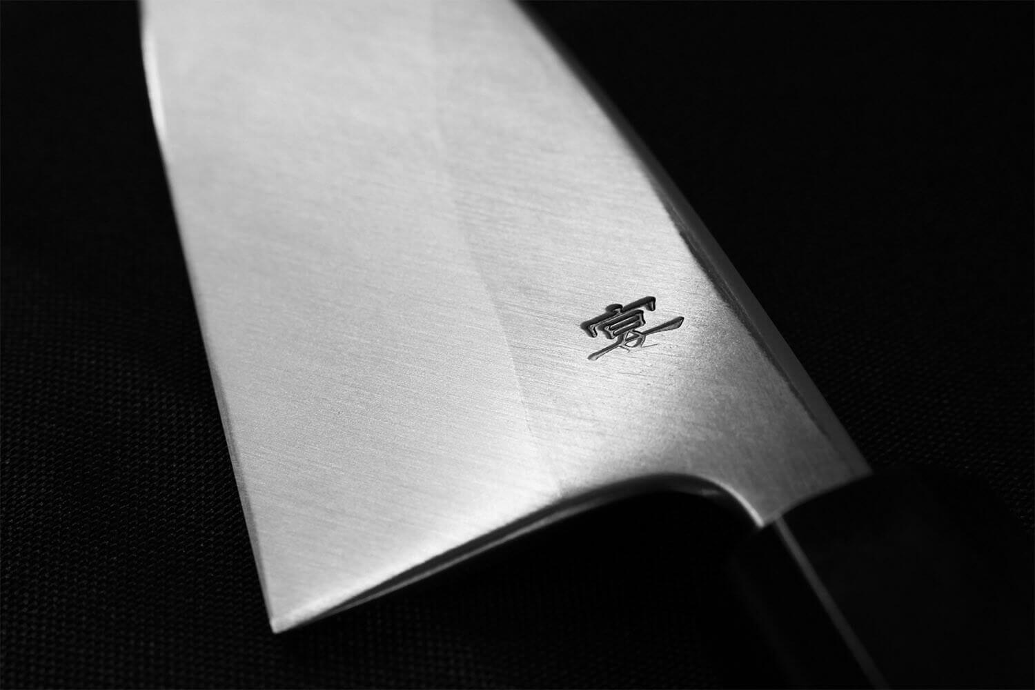 Le logo de la marque a été apposé sur la surface de coupe, et cette dernière bénéficie d'une finition traditionnelle, réalisée avec une technique d'aiguisage où l'on utilise des pierres de différents grains. Cette technique permet de faire ressortir une vague sur l'acier, qui apparaît plus polie que le reste de la lame.
