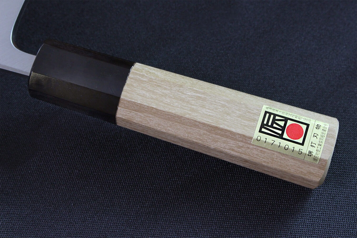 Vous pouvez distinguer une pastille autocollante en bout de manche. Cette étiquette dorée est apposée sur les couteaux qui on été entièrement produits artisanalement à Sakai, ville japonaise réputée pour sa production coutelière. C'est une preuve d'authenticité, et chaque étiquette bénéficie d'un numéro de série unique.