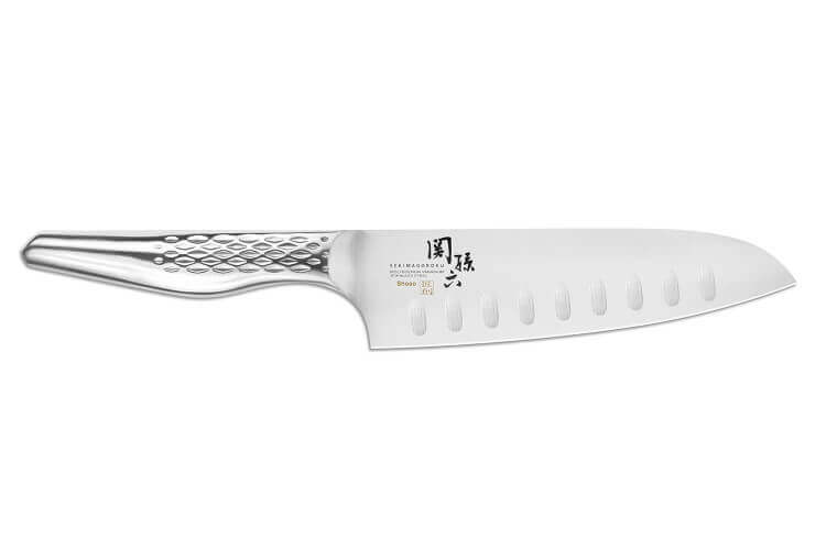 Ce couteau Santoku 16.5cm est un modèle polyvalent, il est considéré comme le couteau de chef de forme japonaise. Sa lame légèrement courbée permet de créer un mouvement naturel de balancier lors de la découpe. Les alvéoles permettent également aux aliments de moins coller à la surface de l'acier.