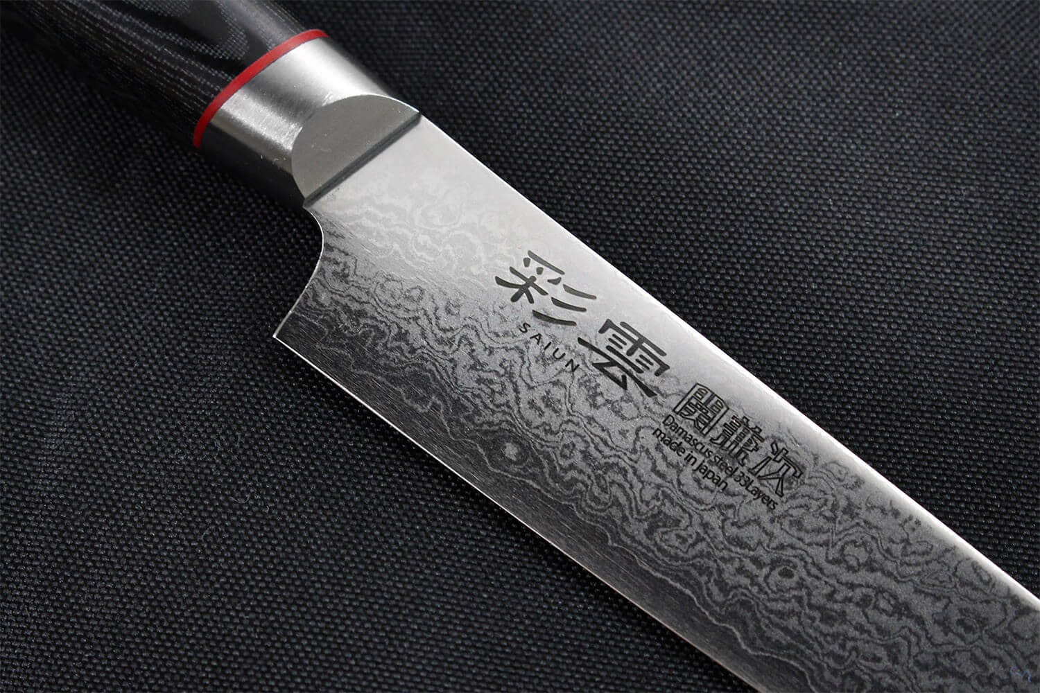 32 couches sont ensuite posées en alternance sur ce noyau, elles sont visibles de chaque côté de la lame. En tout, nous comptons 65 couches (les 32 couches repliées de chaque côté de la lame + le cœur). Vous pouvez distinguer la mention de 33 couches inscrite sur la lame, qui fait état des couches visibles sur chaque côté de celle-ci, ajoutées au cœur. Au delà de son aspect fonctionnel, le damas est apprécié pour le visuel incroyable et unique qu'il donne à chaque couteau. Vous pouvez voir les aciers s'entrelacer le long de la surface de coupe, pour un rendu inédit. D'ailleurs, c'est de son damas que le couteau tire son nom, Saiun signifiant "le délicat rayon de lumière perçant les nuages".