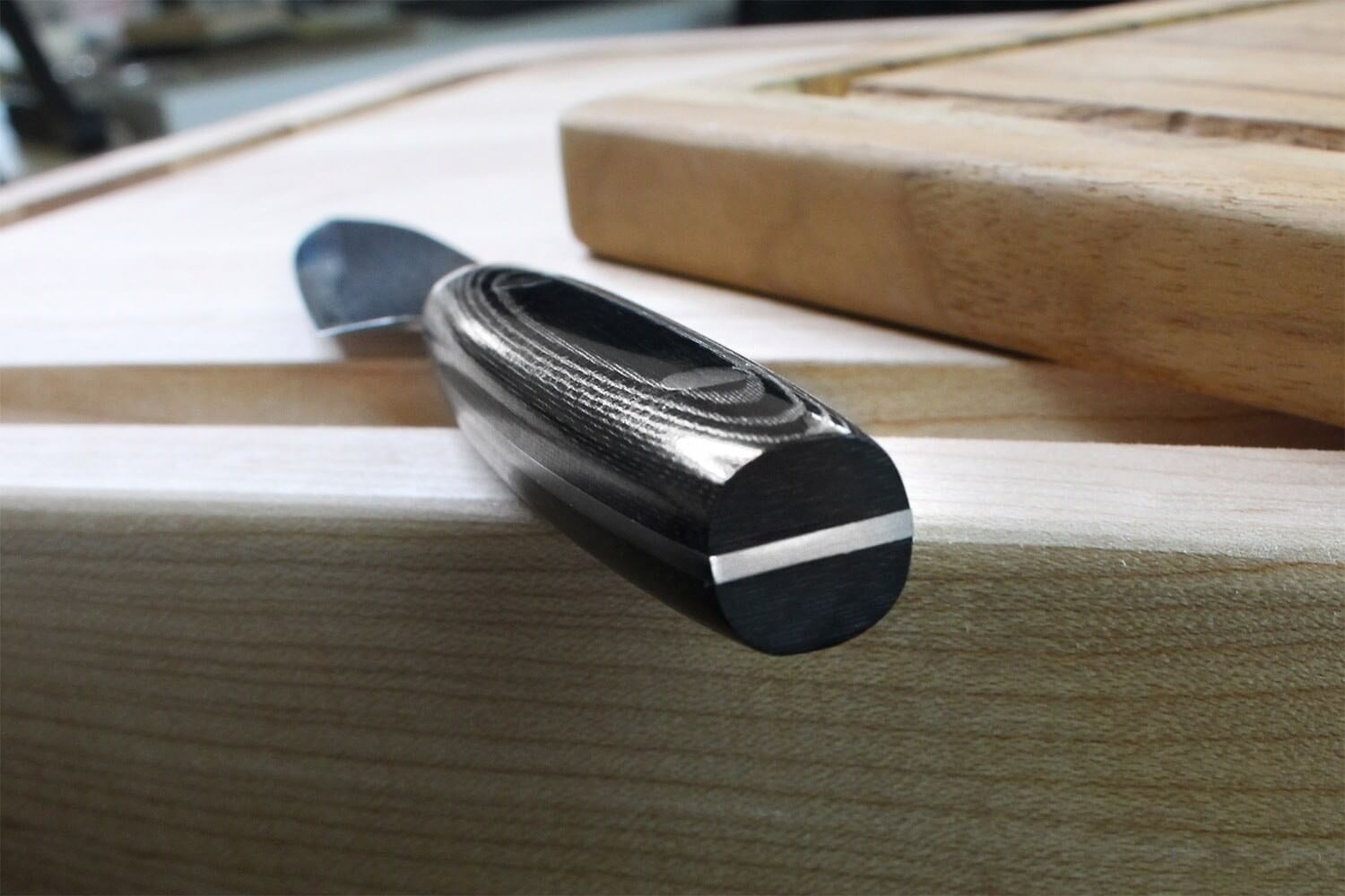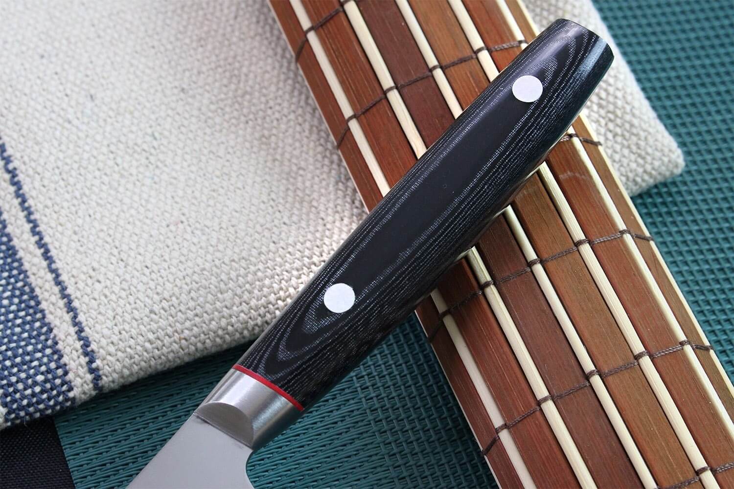 Le manche est en micarta, un matériau résistant, parfait pour durer dans le temps. C'est une matière composite qui comporte 40% de résine et 60% de lin. Il est notamment apprécié pour sa résistance aux variations de température. Il est aussi très résistant face à l'humidité. 2 rivets viennent compléter le micarta pour le fixer sur la lame pleine soie. La mitre est directement intégrée à la lame, pour éviter que l'eau ou les aliments ne puissent s'insérer à la jonction entre les différentes parties du couteau. C'est le gage d'une hygiène impeccable.