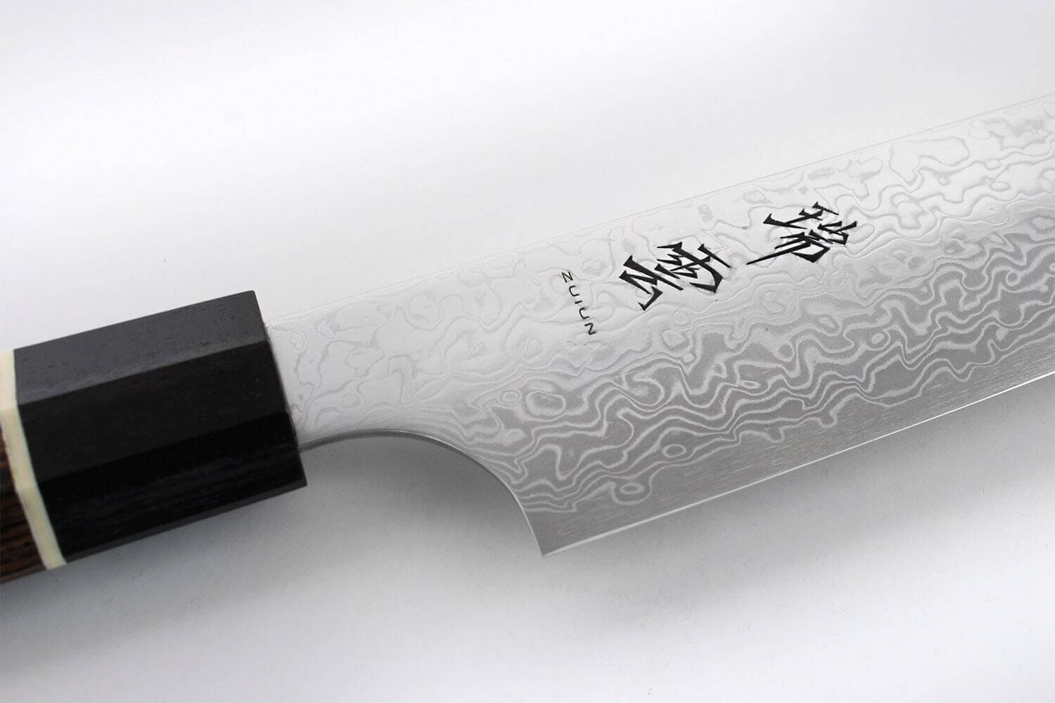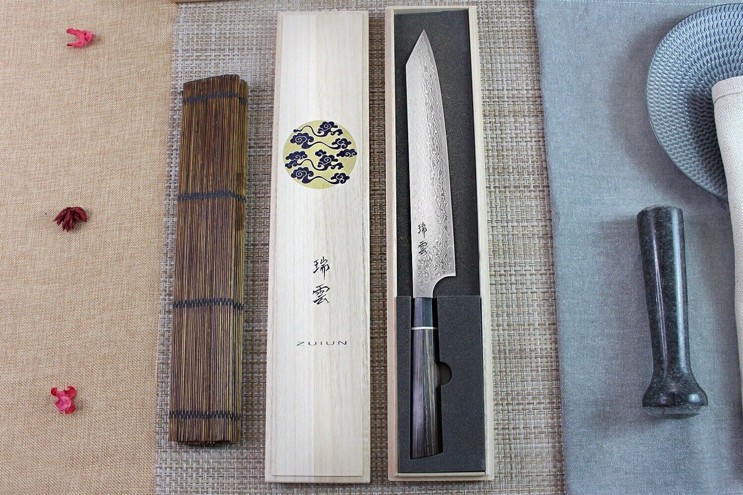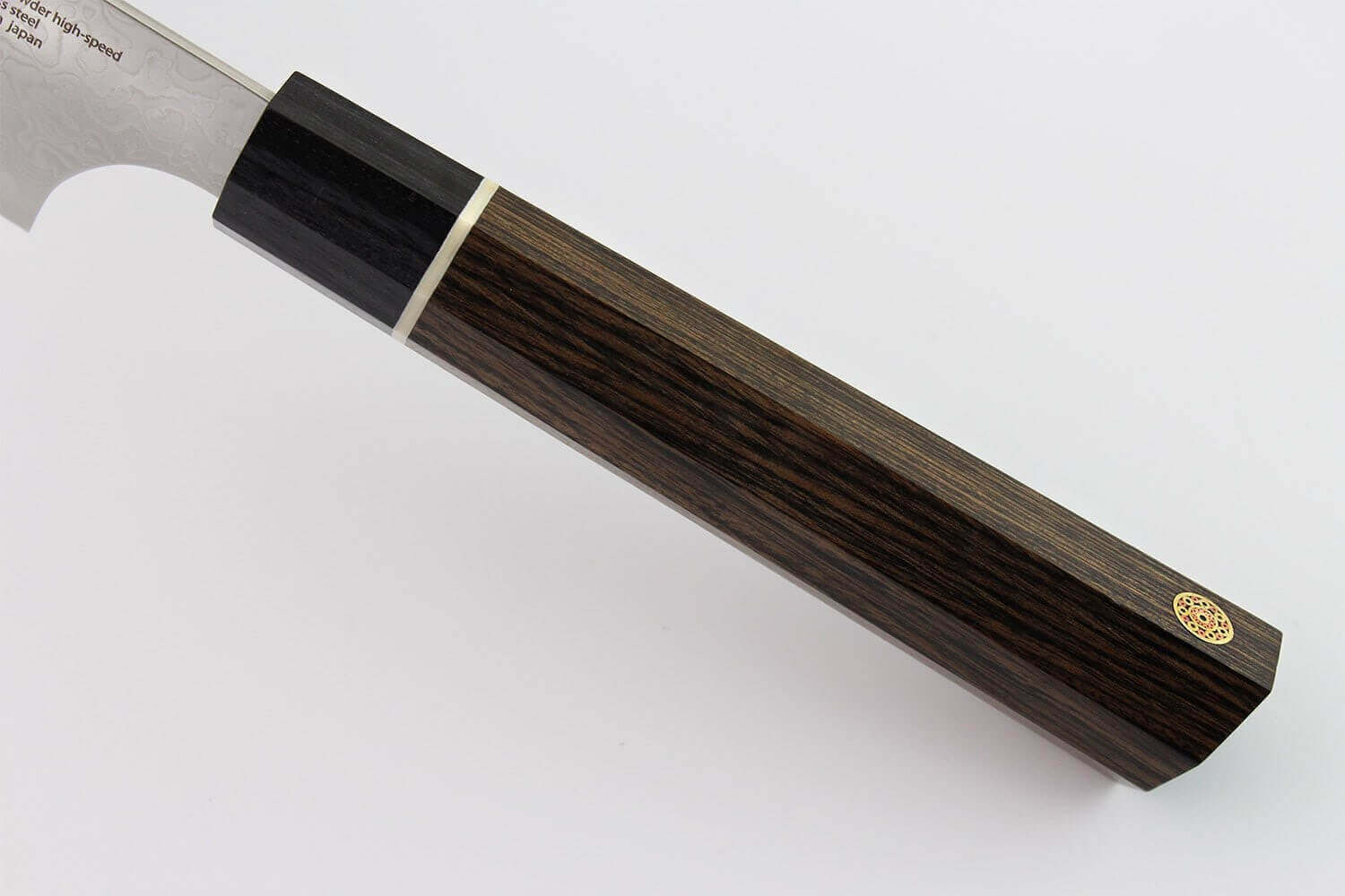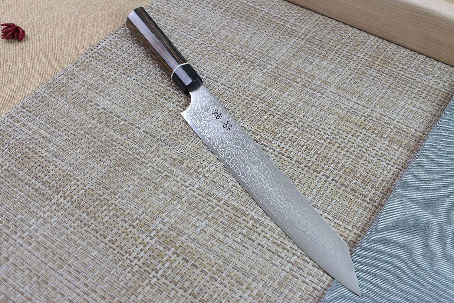 Ce couteau sujihiki 24cm vous permet de découper de grande pièce de viande ou de poisson en tranche fine. C'est l'équivalent du couteau yanagiba, mais sans la lame biseautée. Le bout de sa lame présente un angle marqué original. C'est ce détail qui le fait fortement ressembler à une épée traditionnelle, et qui lui ajoute de l'authenticité.