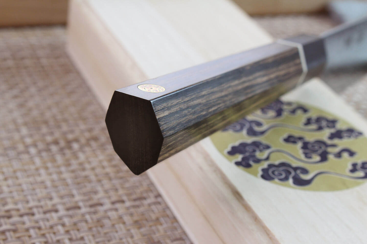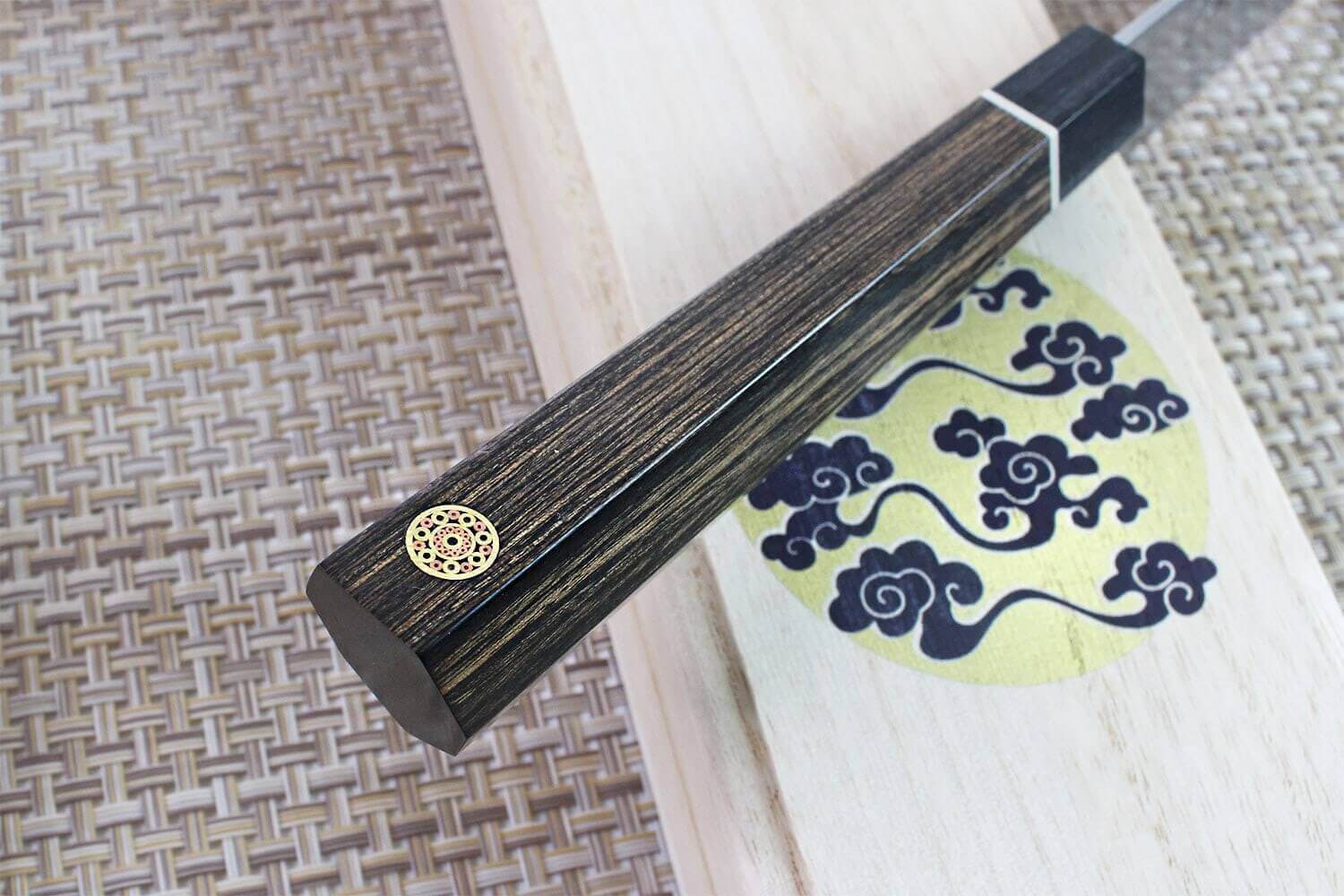 Le couteau est fourni dans un beau coffret en bois de paulownia clair, poli et léger, agrémenté d'un design japonais traditionnel sur sa face supérieure. Vous pouvez ainsi l'offrir facilement à un amateur du genre, ou bien vous faire plaisir !