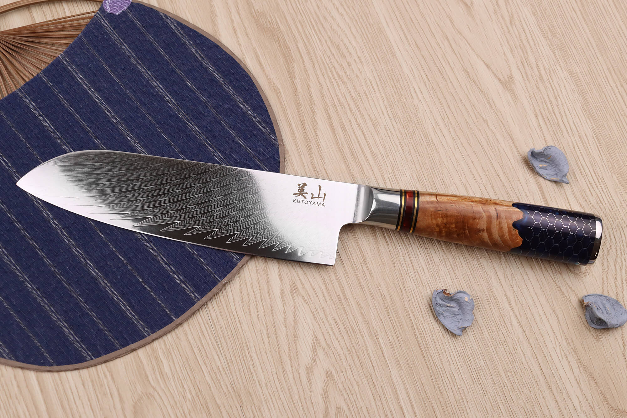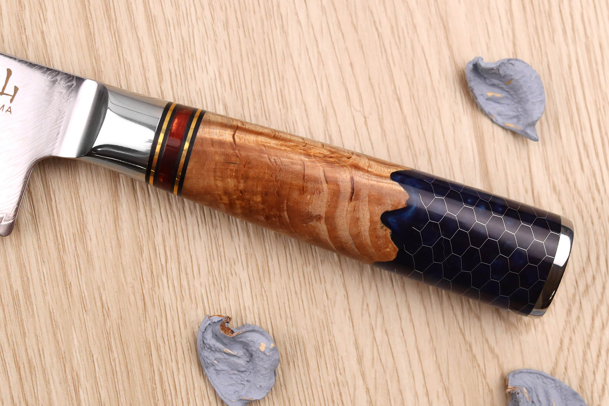 Ce couteau santoku dispose d'un manche fabriqué en bois et en résine qui sont des matériaux durables et robustes. Le mélange des deux matières créé un motif original de nid d'abeille.