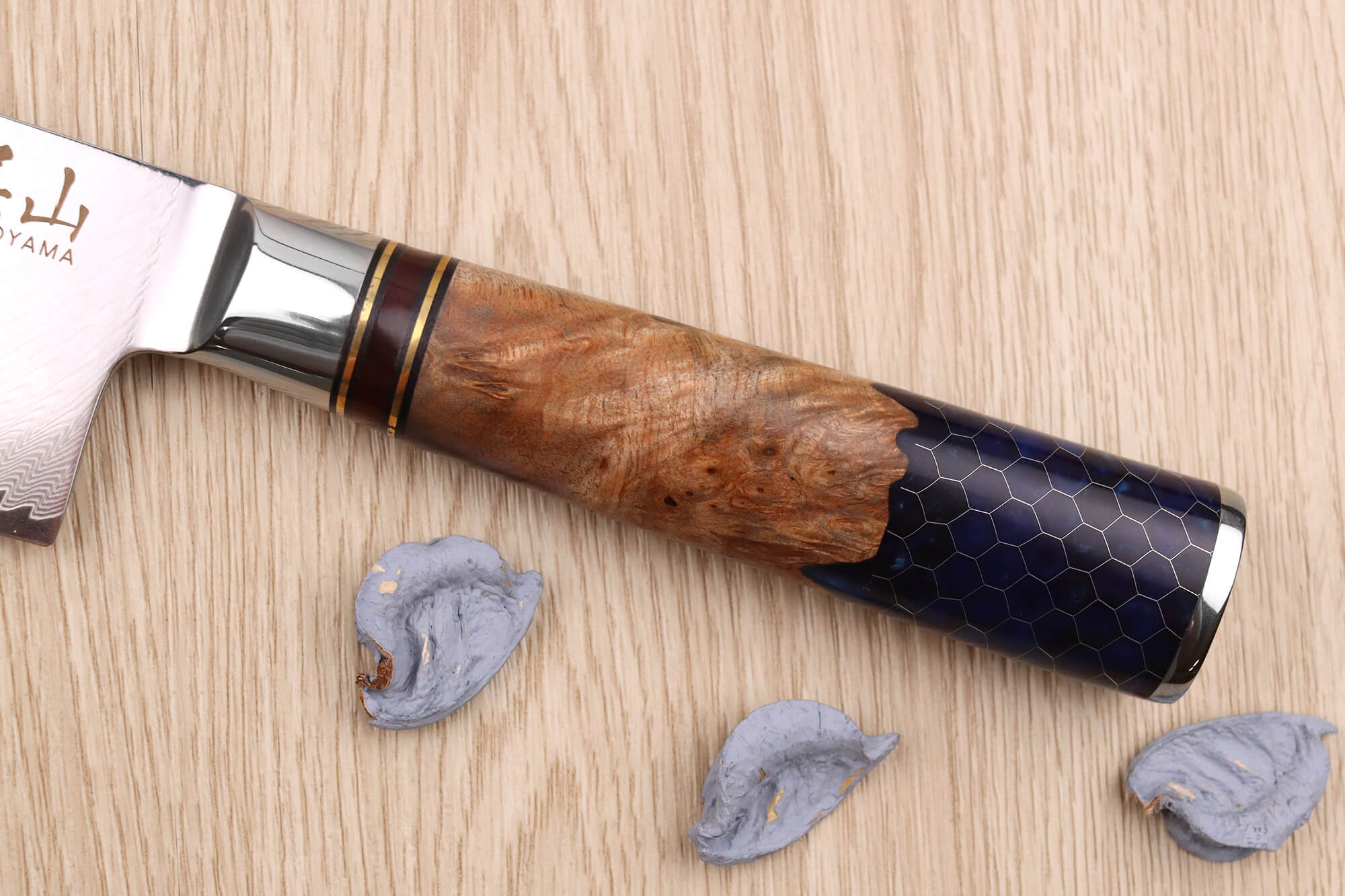 Ce couteau nakiri est doté d'un manche en bois et en résine, des matériaux robustes et durables. Leur combinaison crée un motif de nid d'abeille pour un design unique.