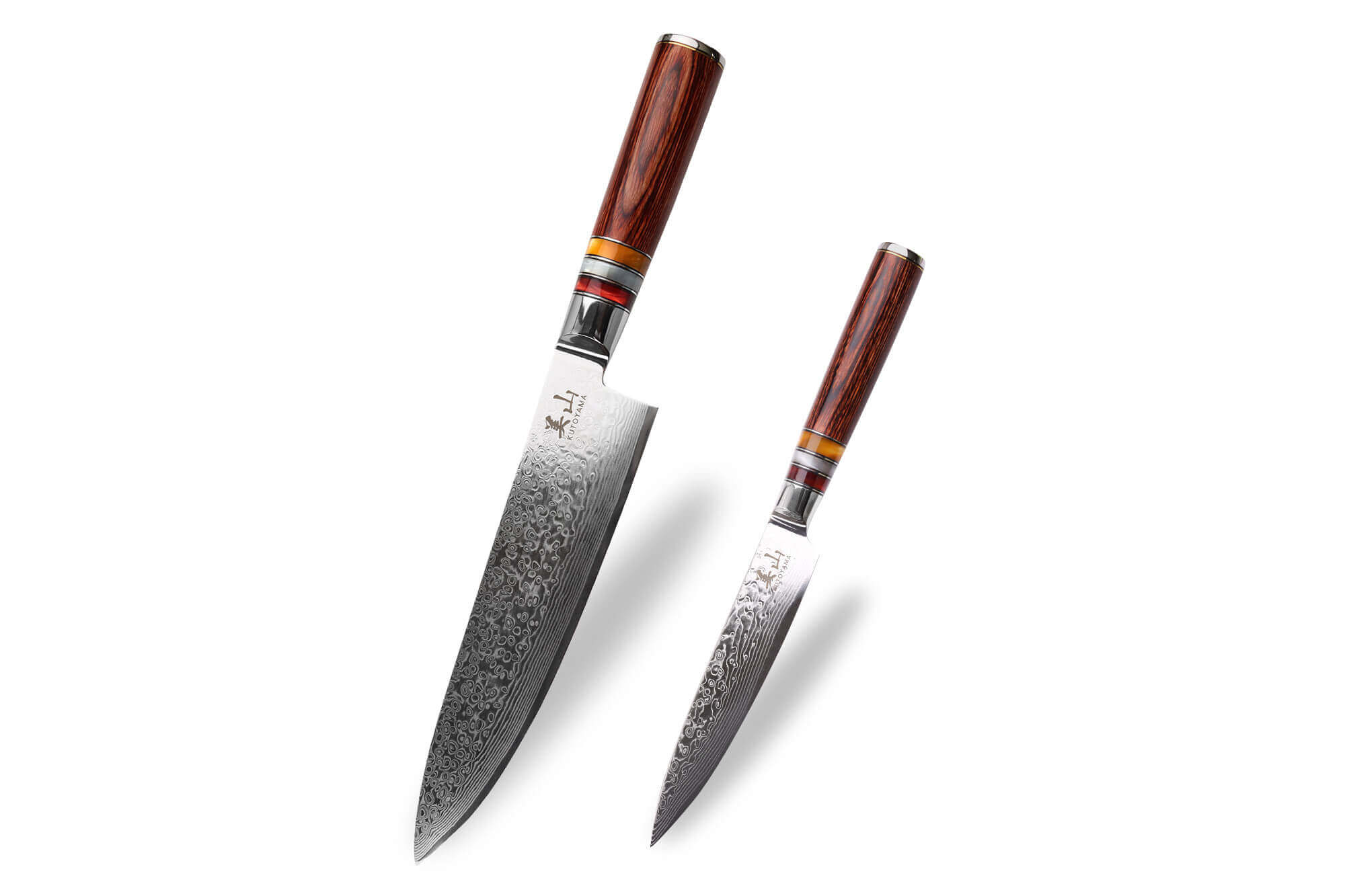 Ces couteaux sont dotés d'une lame damassée, avec un noyau en acier rigide entouré de 66 couches d'acier inox plus souple.