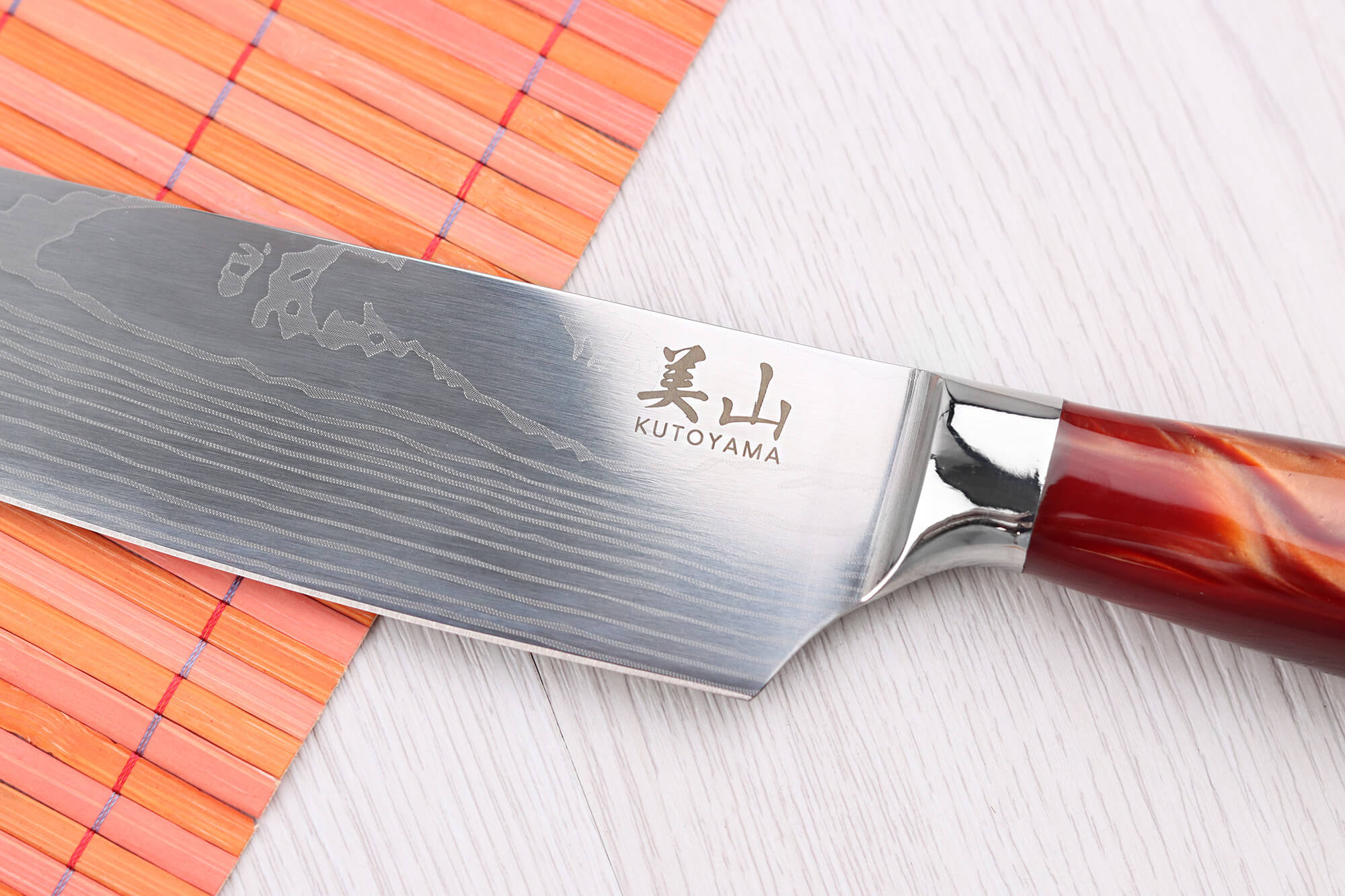 Le couteau Kutoyama dispose d'une lame en acier inoxydable 4Cr13Mov, un alliage enrichi en vanadium et en molybdène, et affiche une dureté de 56HRC sur l’échelle de Rockwell. Cette lame présente une impression damassée et a été polie pour un obtenir un effet miroir.