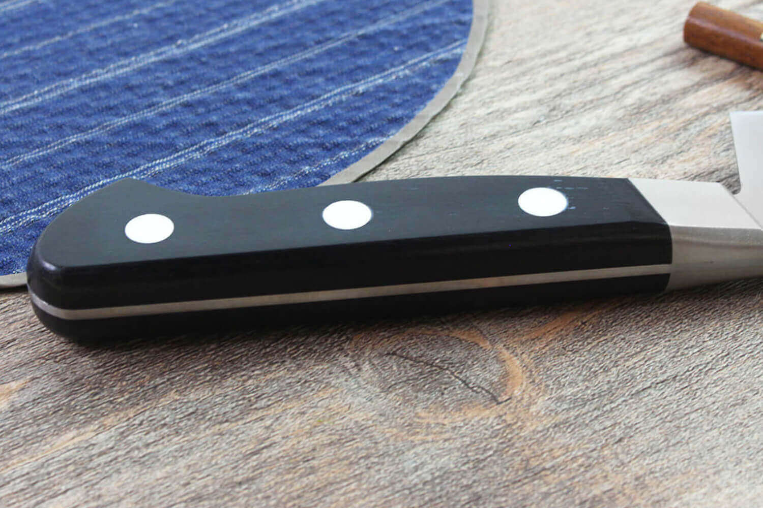 Ses 3 rivets et sa mitre sont en Maillechort. C'est un alliage mélangeant le cuivre, le nickel et le zinc. Il est reconnu pour sa dureté et sa résistance à la corrosion. Il est donc particulièrement recommandé pour un milieu tel que celui de la cuisine. Son aspect ne diffère pas de l'alliage inoxydable, ce qui crée une belle continuité avec la lame. La mitre vient équilibrer le couteau tandis que les rivets viennent parfaitement maintenir le bois de pakka du manche sur la lame pleine soie (elle s'étend tout le long du manche).